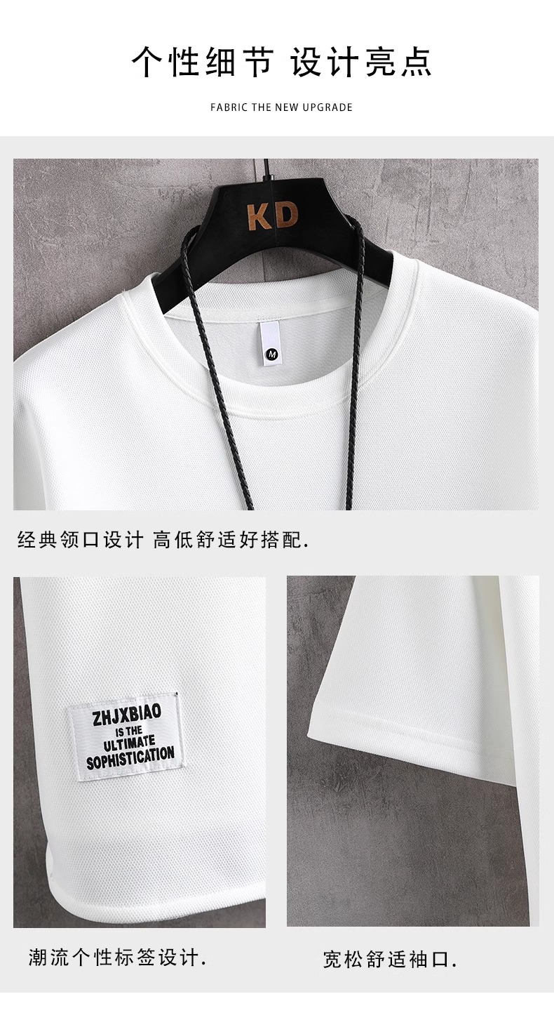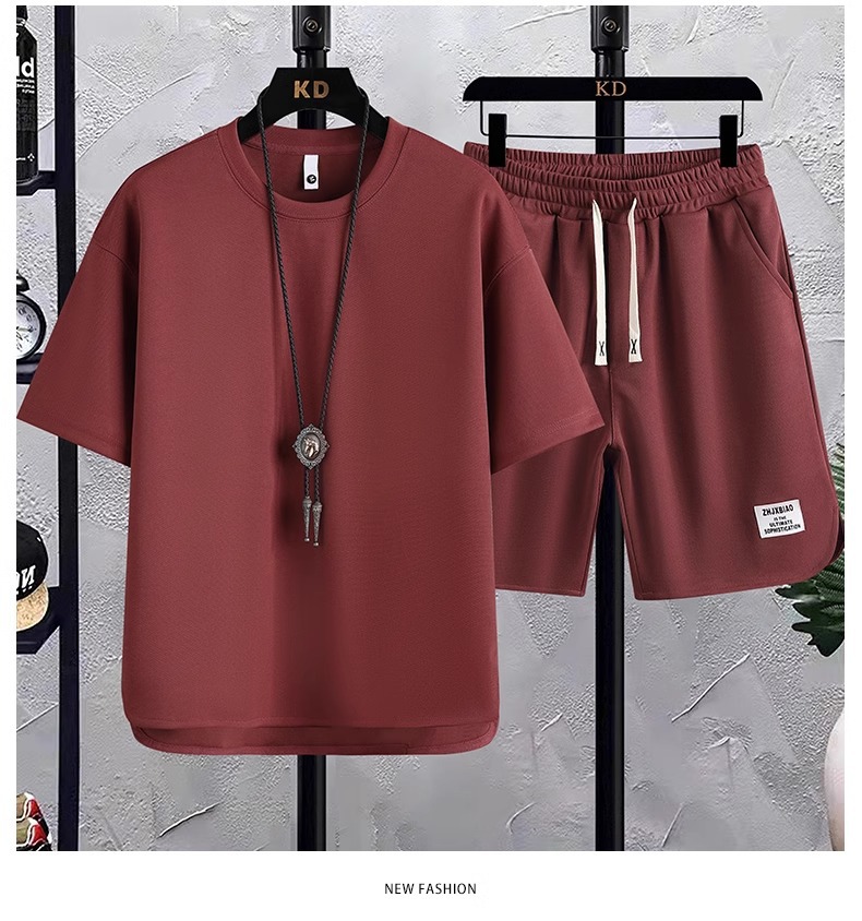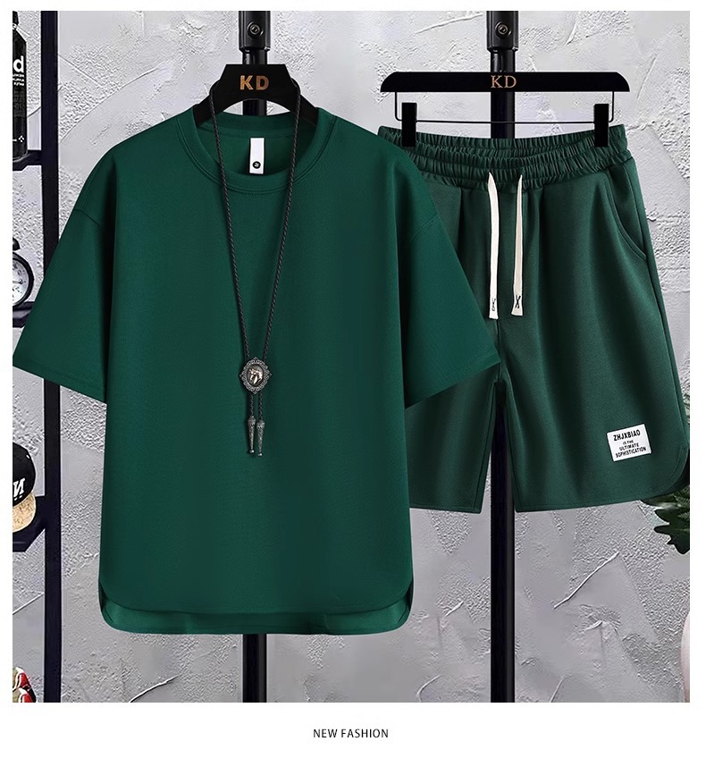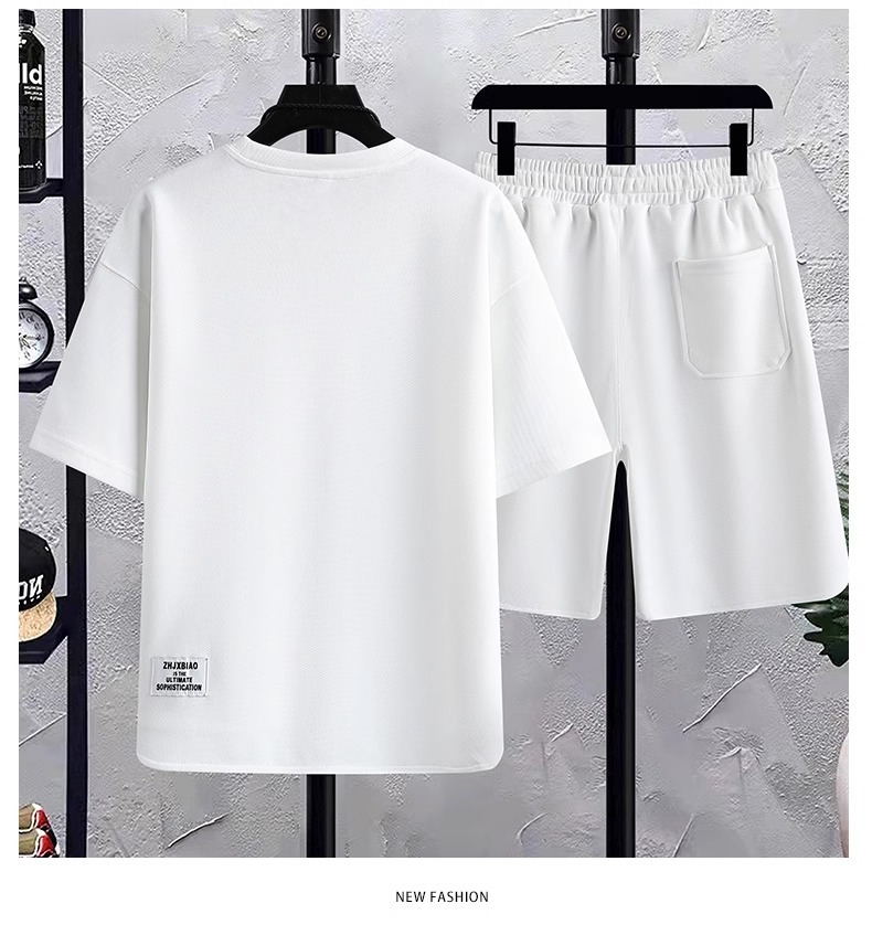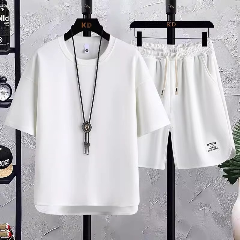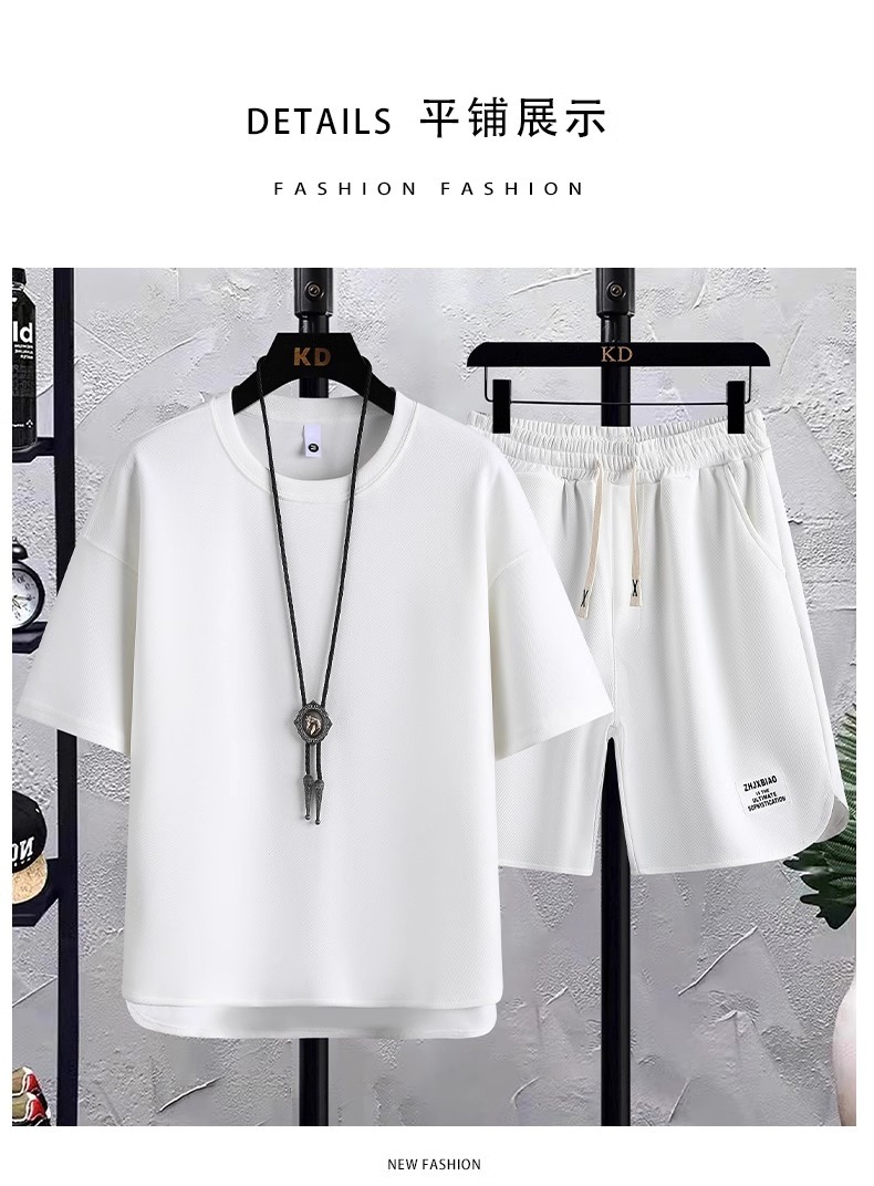 여름 새로운 패션 세트 남성 아이스 실크 짧은 소매 티셔츠 반바지 스포츠 레저 투피스 대외 무역 국경 도매스토어 가기