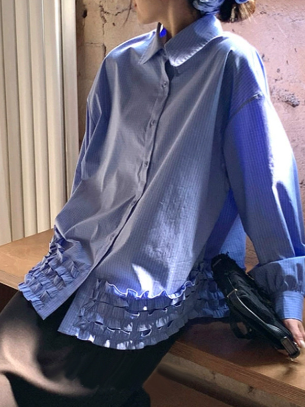 여성을위한 간단한 우아한 파란색 셔츠 여성 디자인 센스 틈새 인형 칼라 느슨한 긴팔 캐주얼 탑