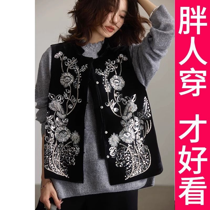 100kg 여성을위한 고급 대형 새로운 중국 스타일 조끼 2025 이른 봄 새로운 스타일 조끼 조끼 블랙 양복 조끼 유행
