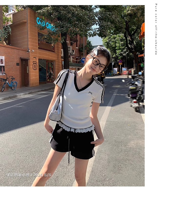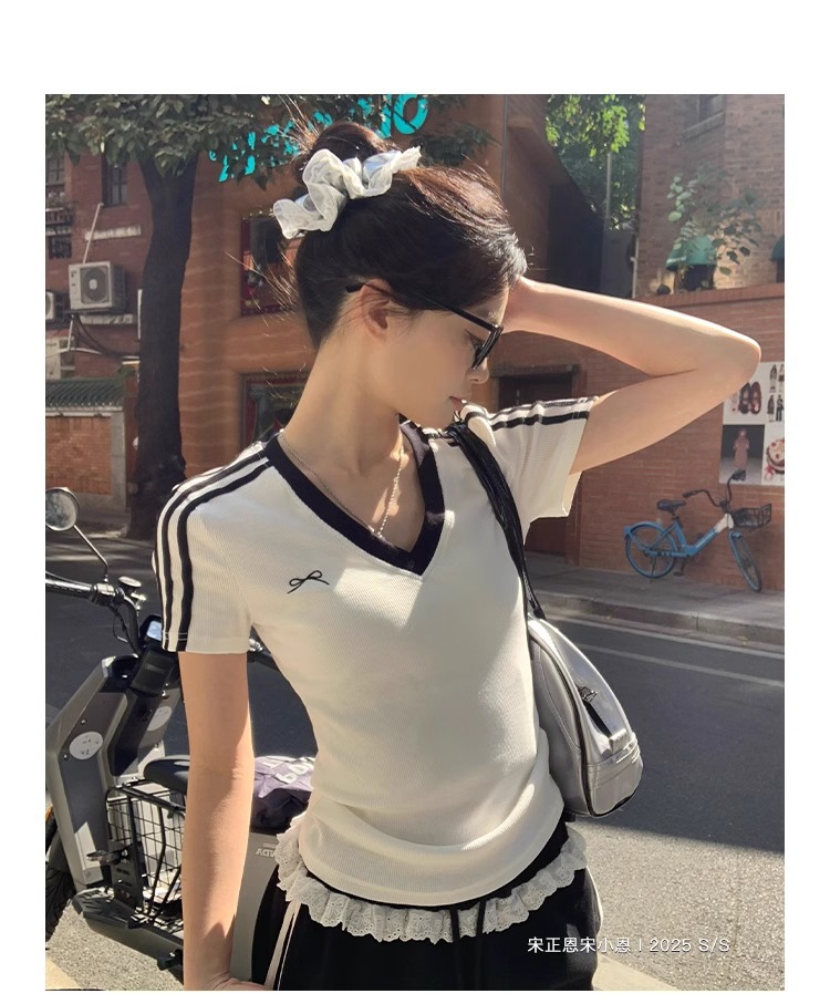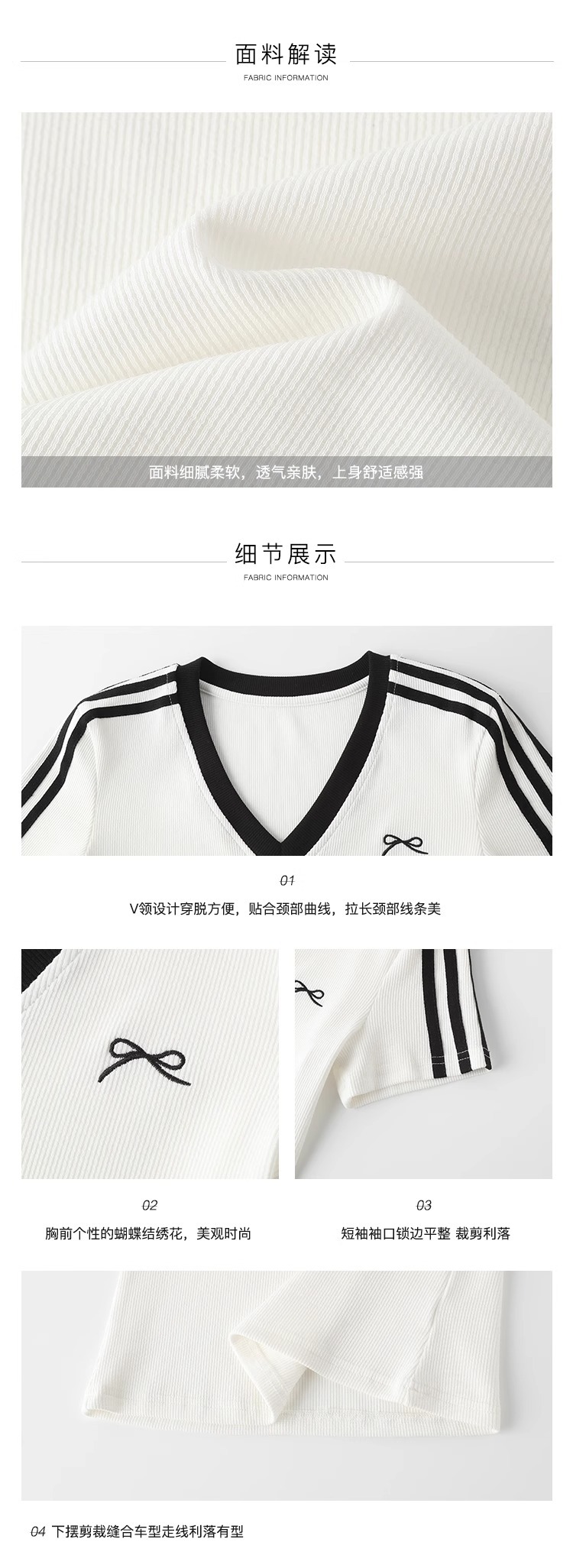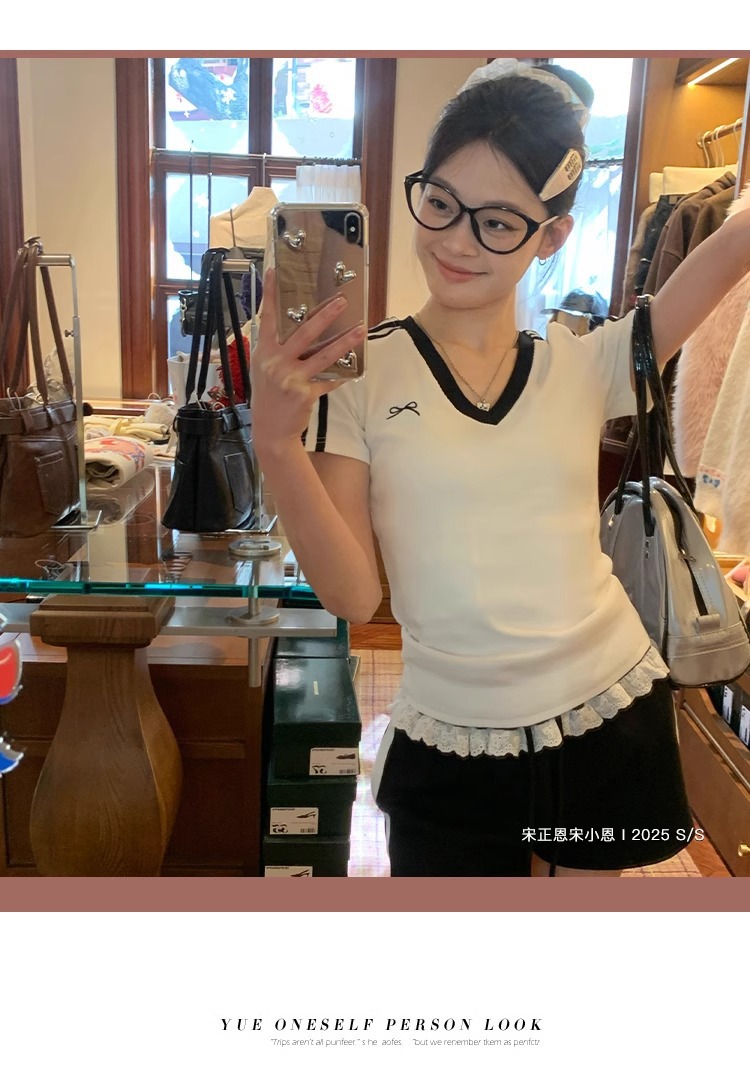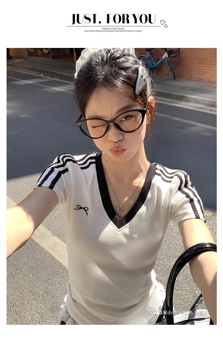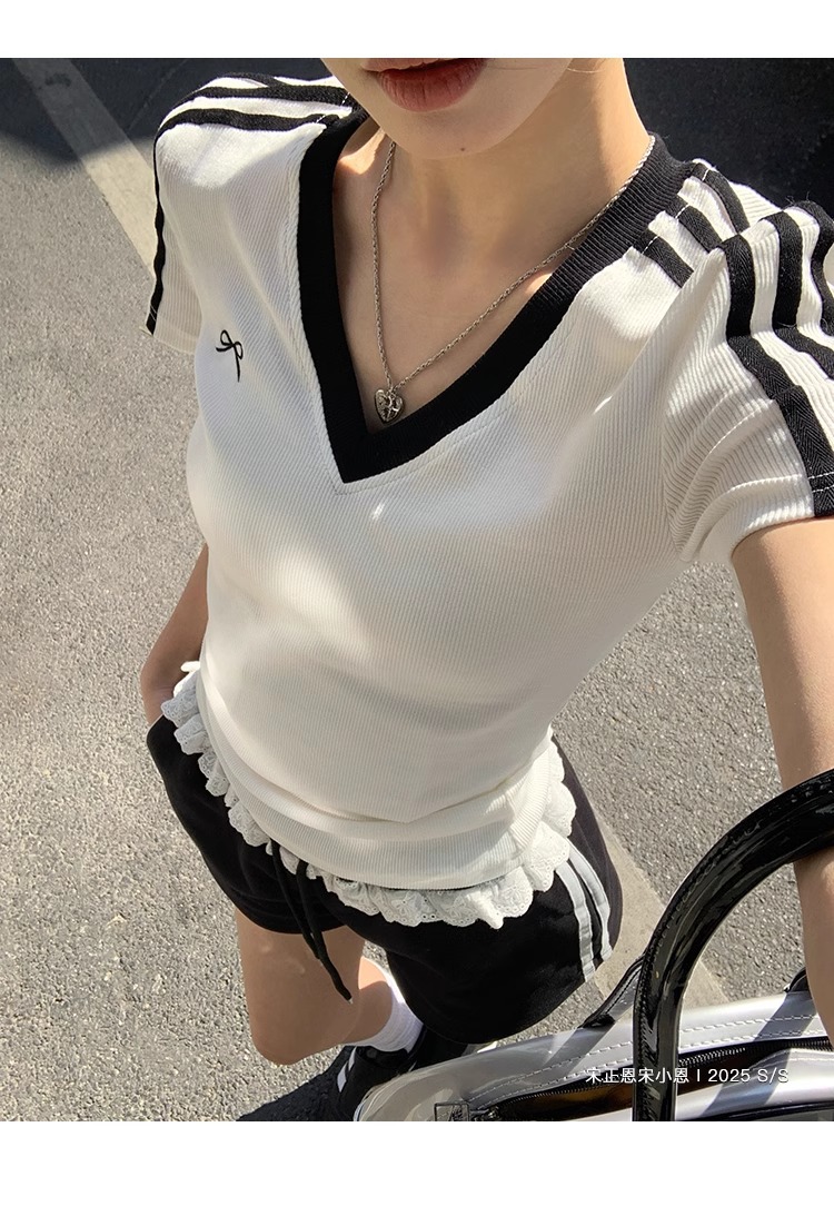 달콤한 쿨 활 V-Neck 대조 컬러 어깨 짧은 소매 티셔츠 여성의 여름 새로운 순수 면 라슬란 하프 슬리브 탑