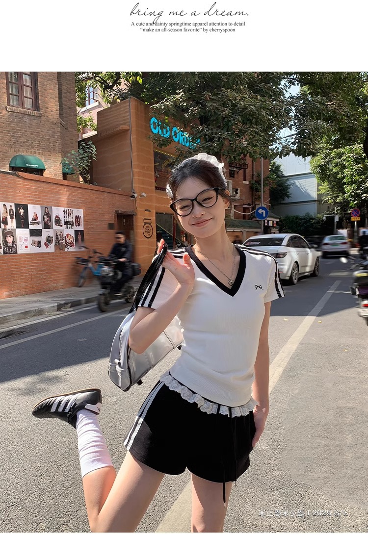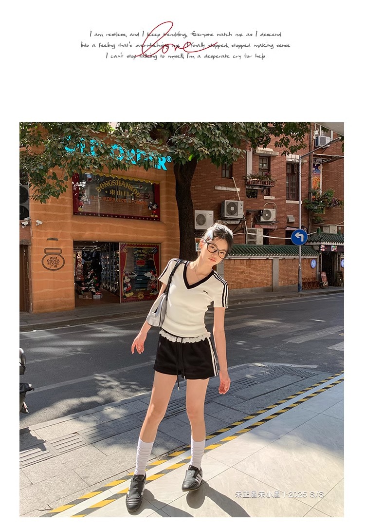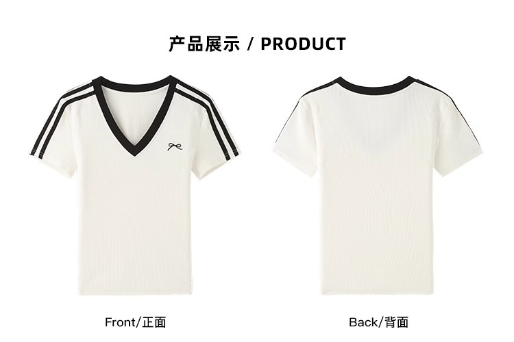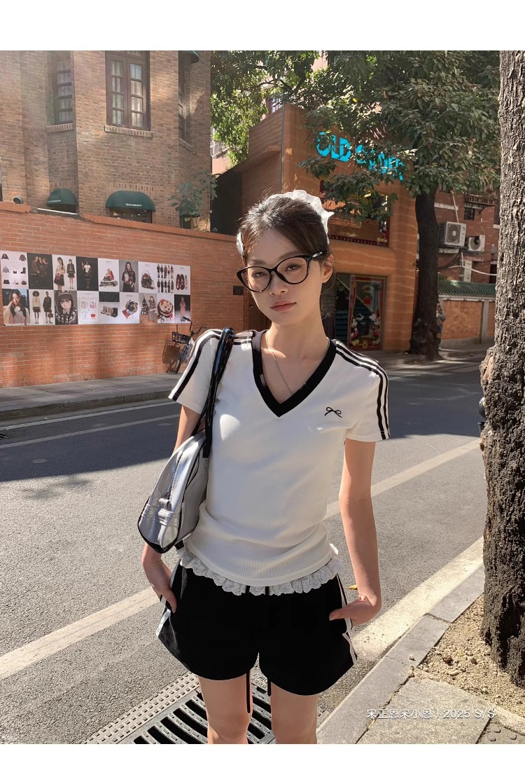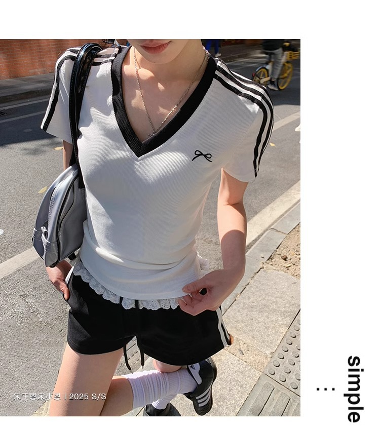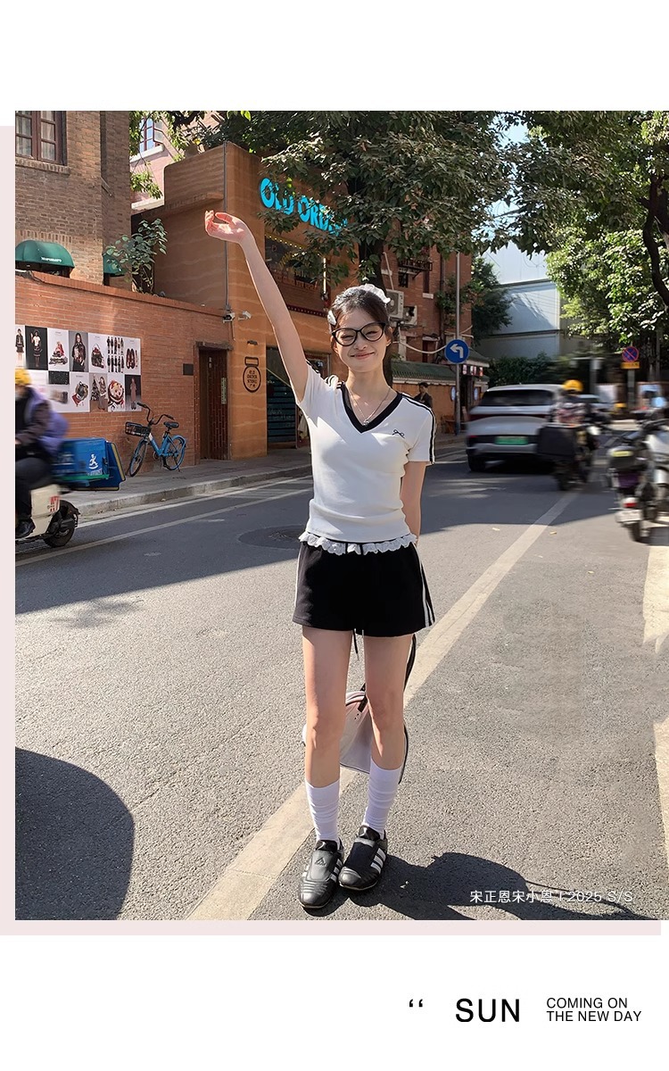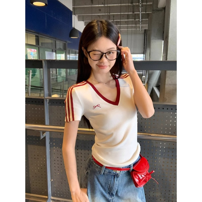 달콤한 쿨 활 V-Neck 대조 컬러 어깨 짧은 소매 티셔츠 여성의 여름 새로운 순수 면 라슬란 하프 슬리브 탑