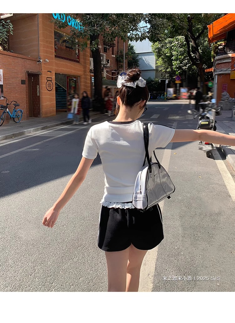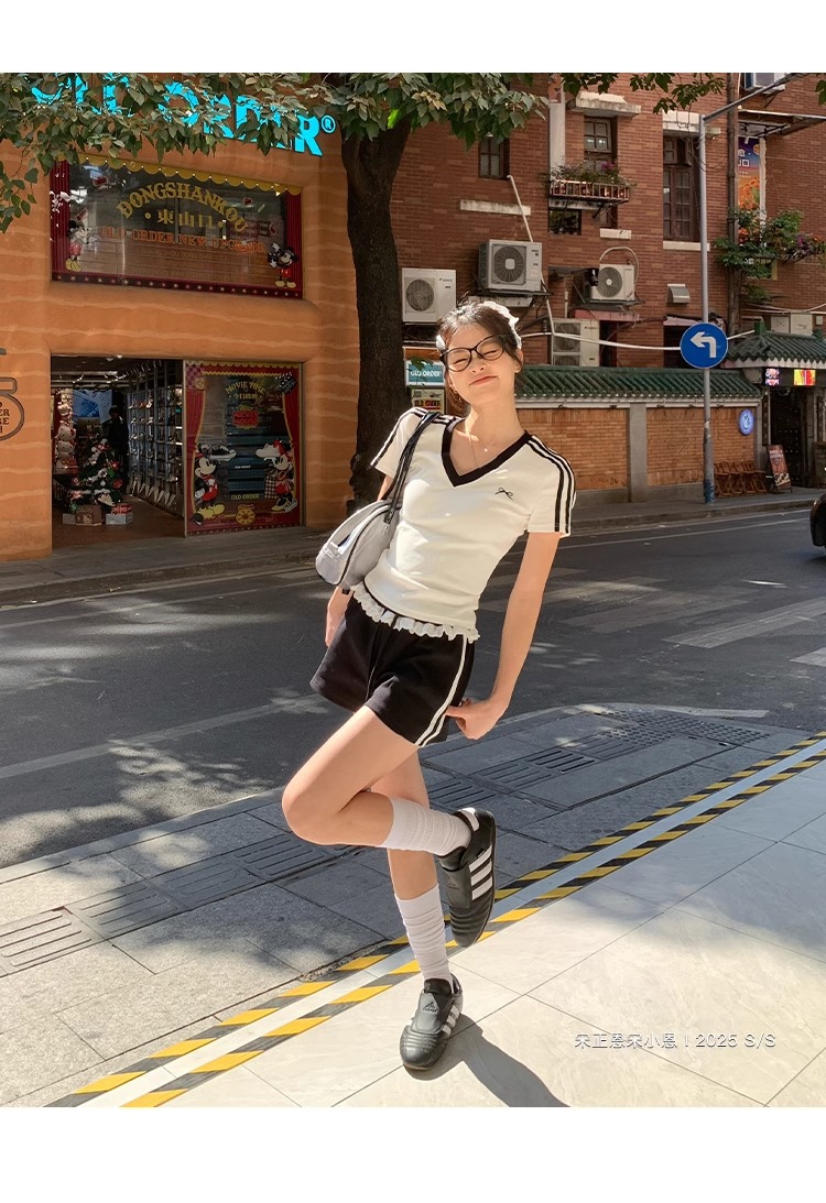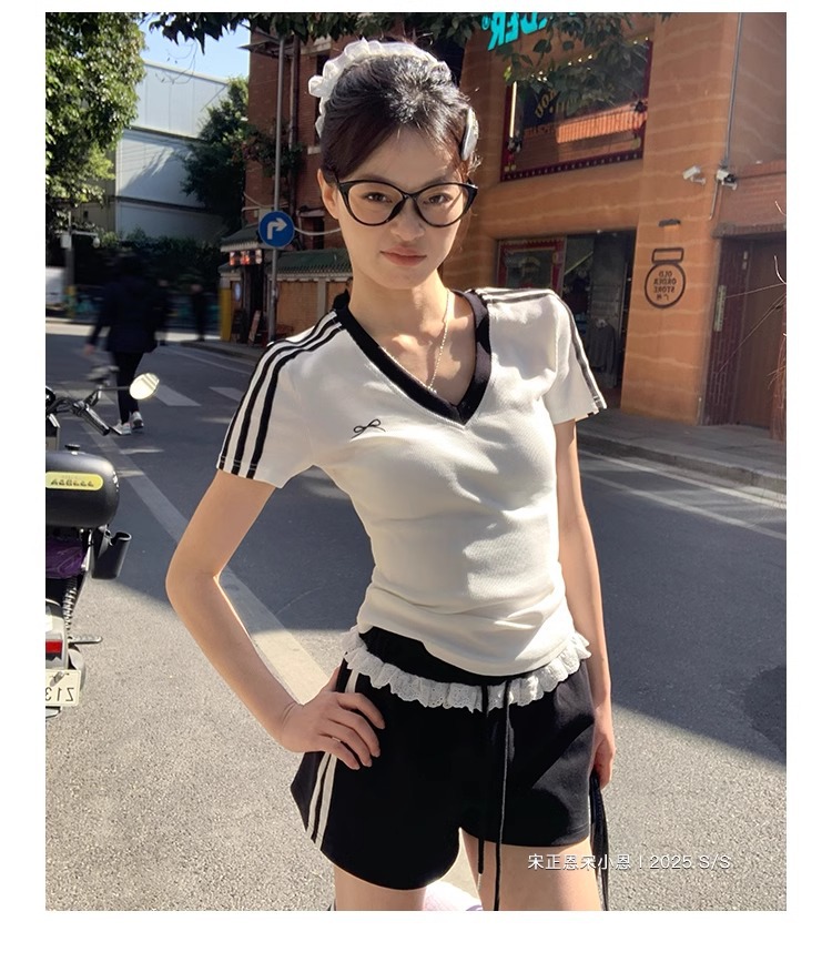 달콤한 쿨 활 V-Neck 대조 컬러 어깨 짧은 소매 티셔츠 여성의 여름 새로운 순수 면 라슬란 하프 슬리브 탑스토어 가기