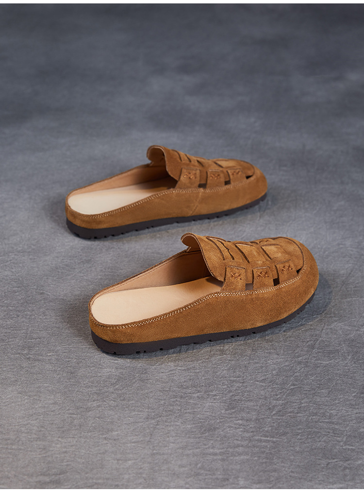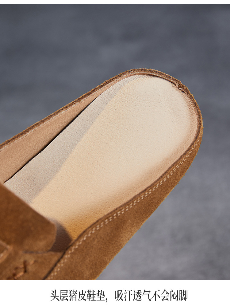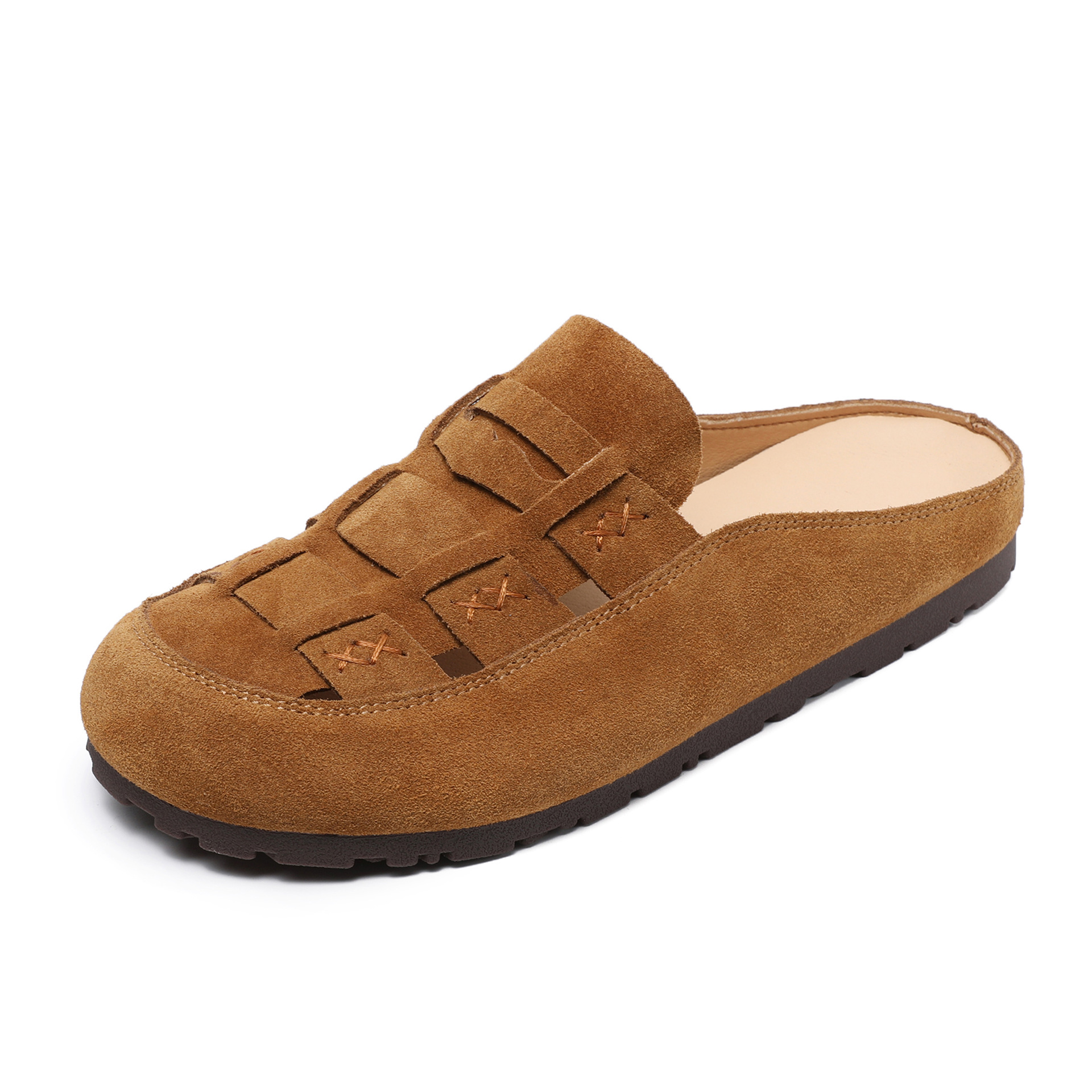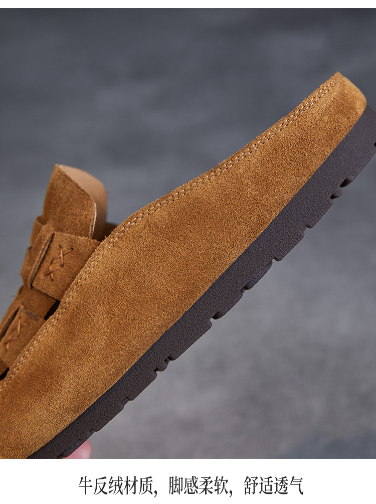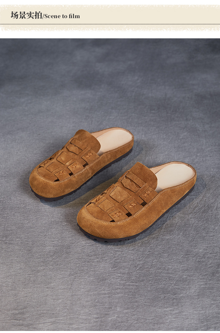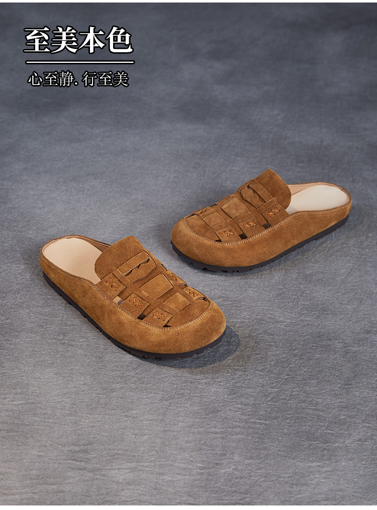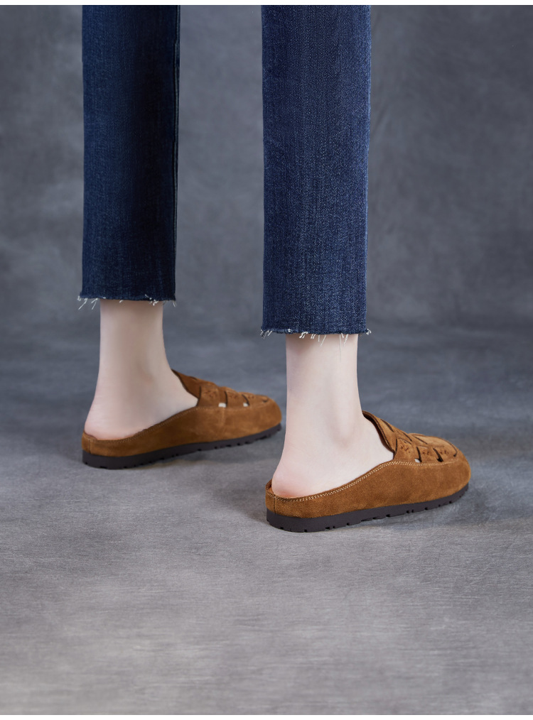 봄과 여름 2025 새로운 평면 진짜 Cowhide Birkenth 신발 여성용 로마 샌들과 슬리퍼 Baotou 통기성 짠 외부 슬리퍼