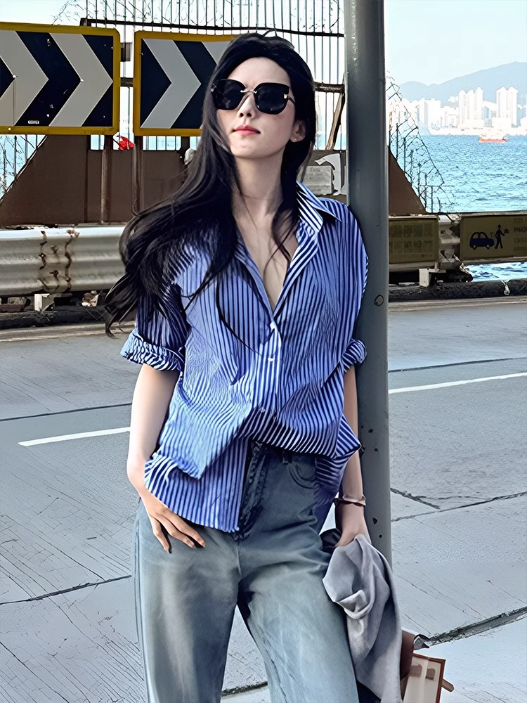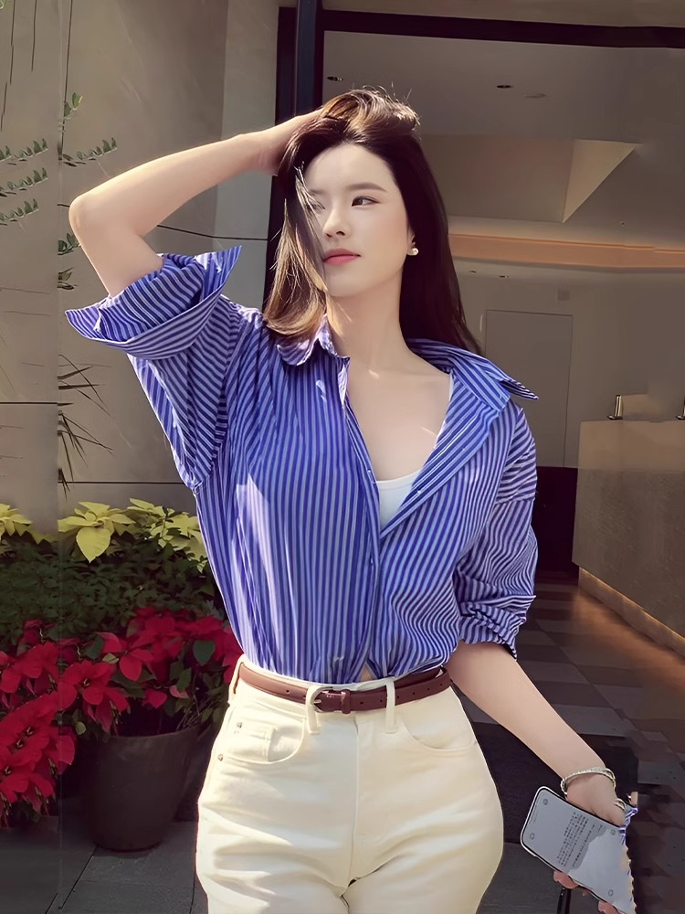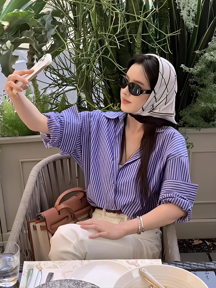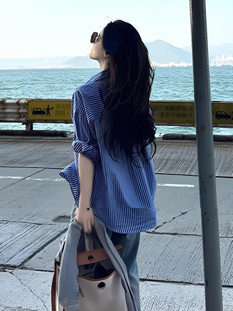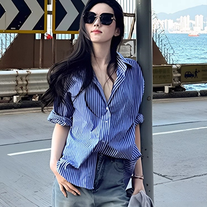 코튼 프렌치 블루 긴팔 줄무늬 선 스크린 셔츠 여성의 2025 년 봄과 가을 새로운 느슨한 한국 스타일 스택 탑