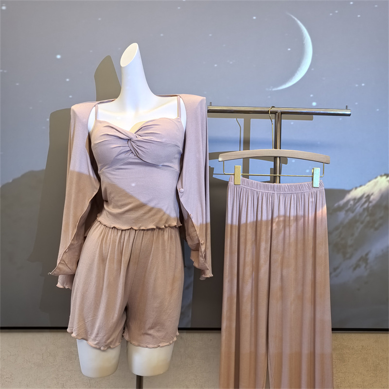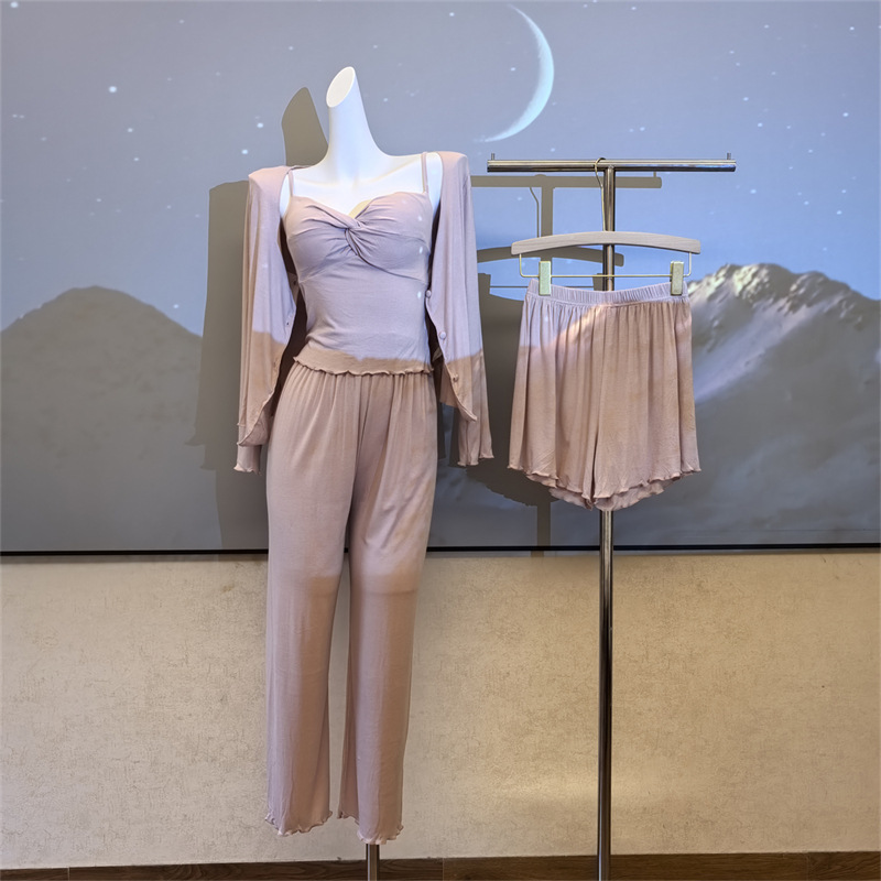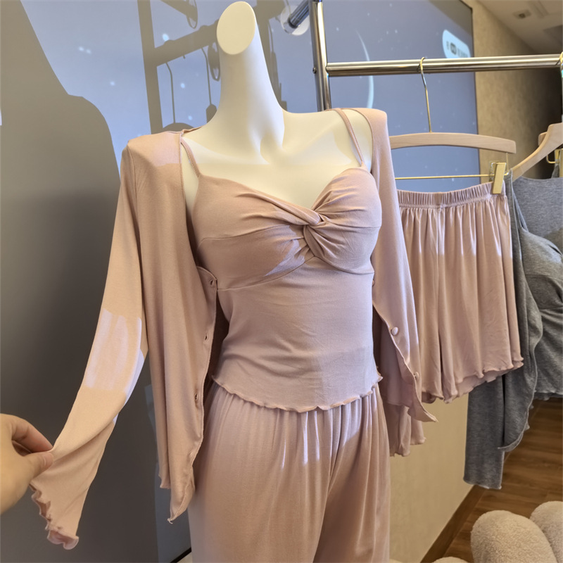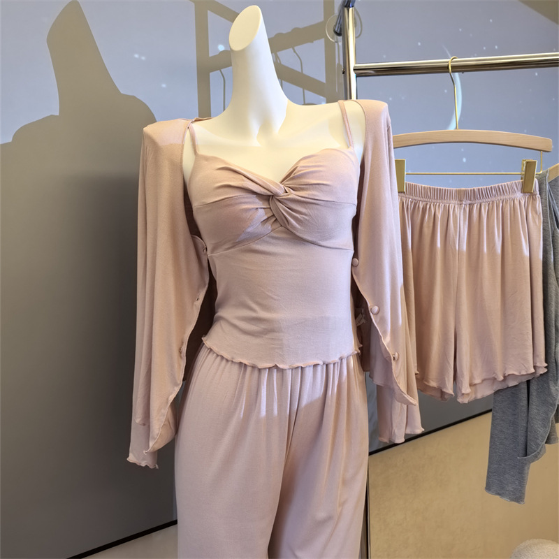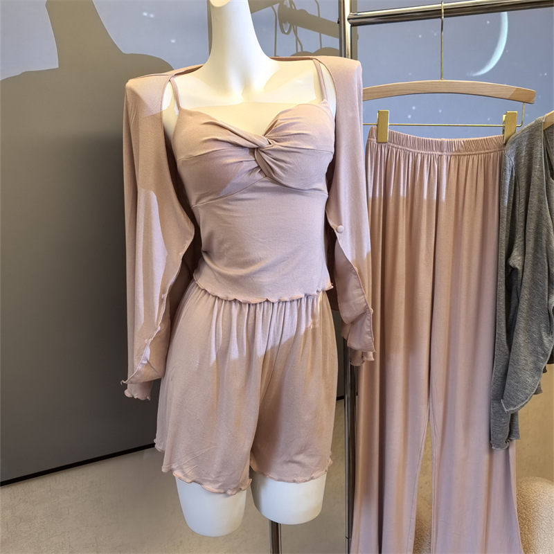 여성스러운 스타일의 파자마, 모달 4종 세트, 여성용 서스펜더 반바지, 봄 여름 시원한 긴팔 바지, 홈웨어, 달콤함