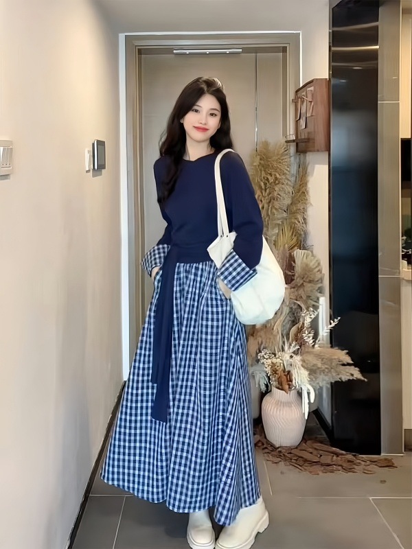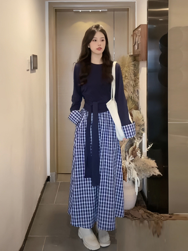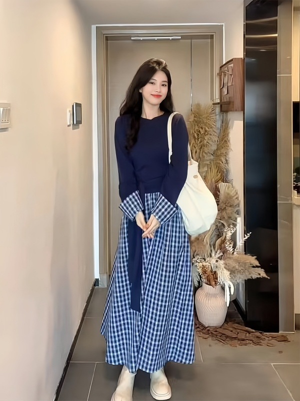 • 네이비 블루 니트 탑 + 체크 무늬 스커트