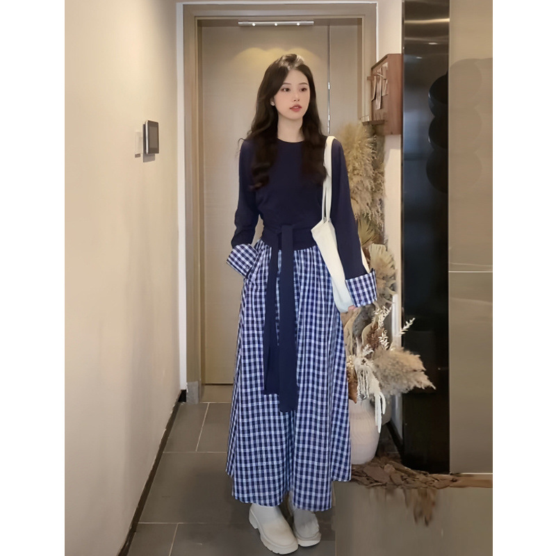 소금 형 빛 성숙한 투피스 원피스 여성의 봄과 가을 디자인 센스 틈새 스트랩 탑 A 자형 높은 허리 격자 무늬 스커트스토어 가기