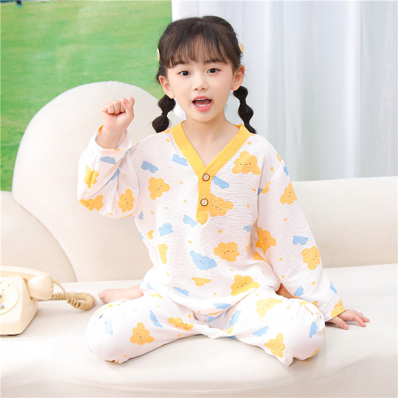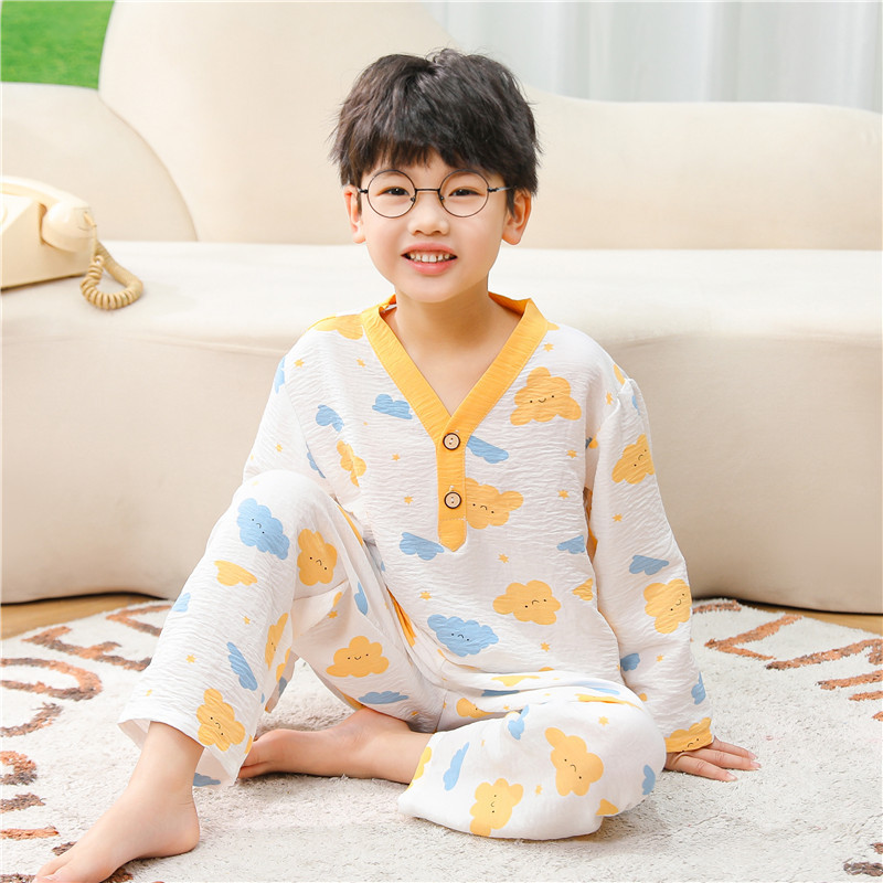 여름 얇은 어린이 면 실크 파자마 긴팔 바지 홈 의류 세트 아기 소년 소녀 중년 어린이