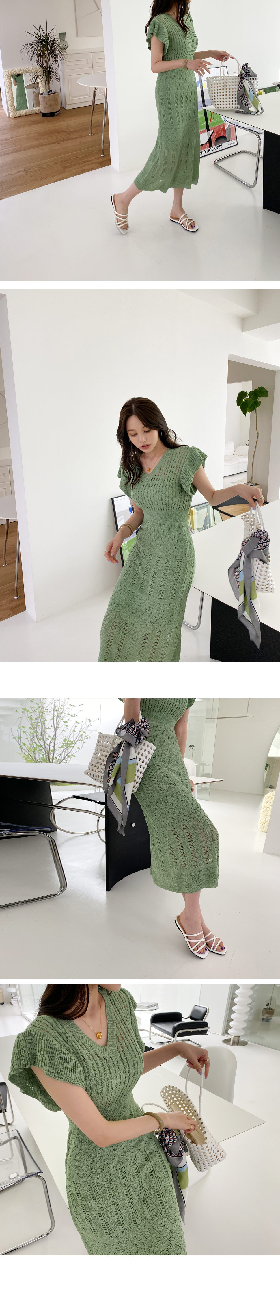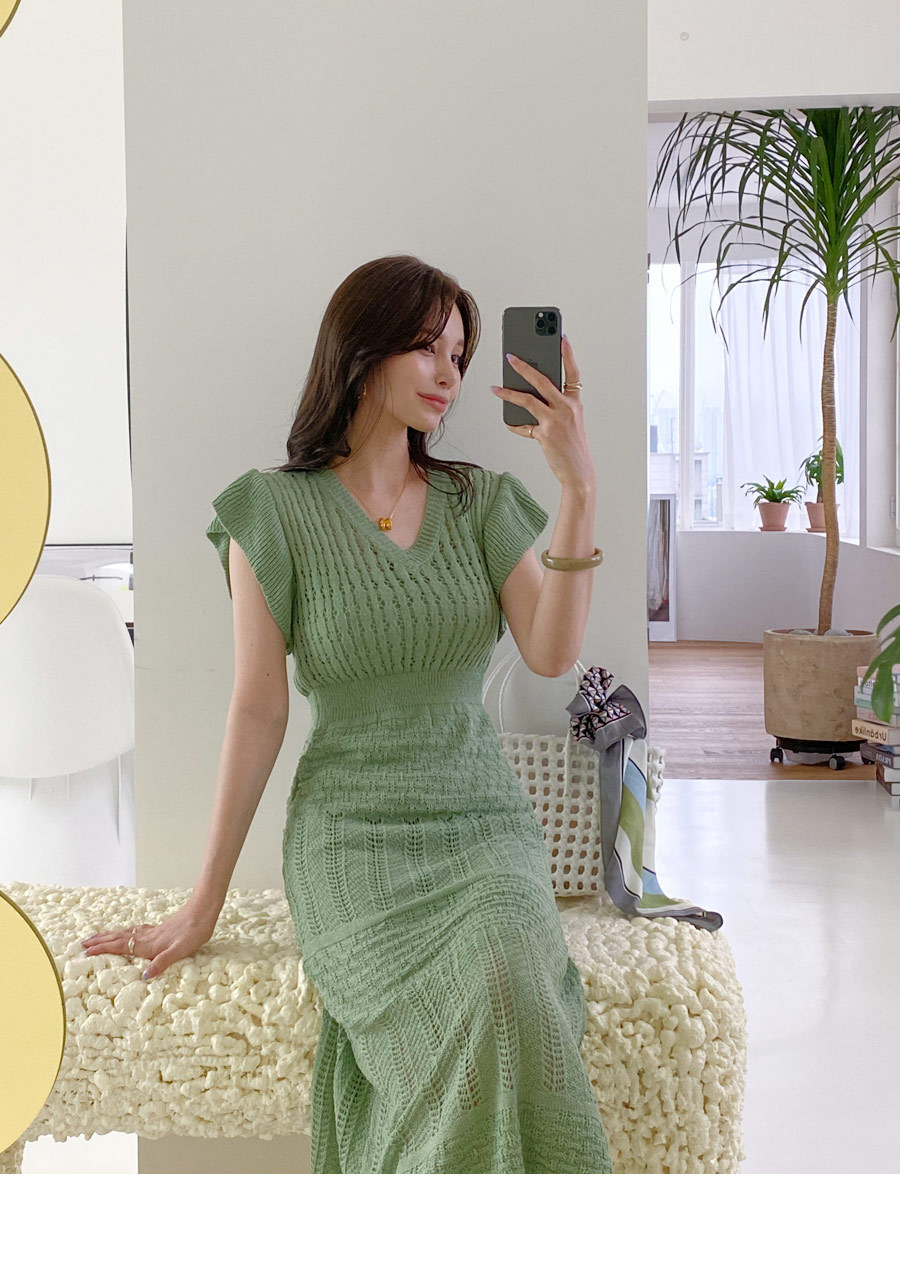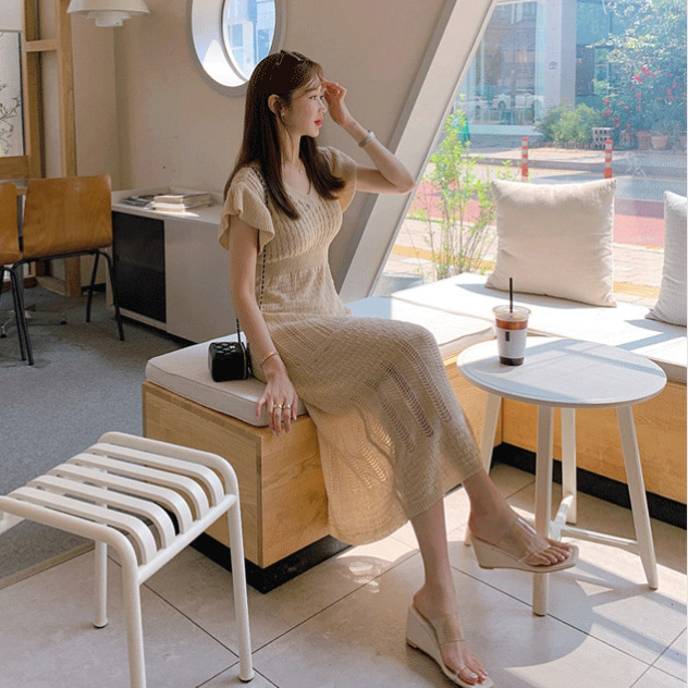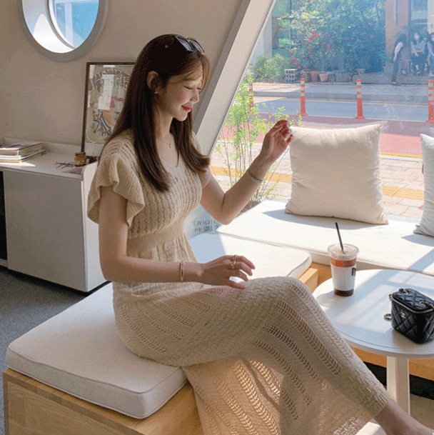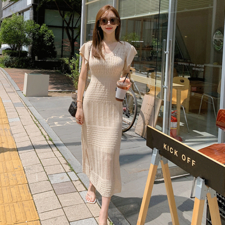 한국 여성용 여름 슬림 핏 젠틀 V 넥 러플 반팔 하이 웨이스트 롱 원피스 베이스 슬링스토어 가기