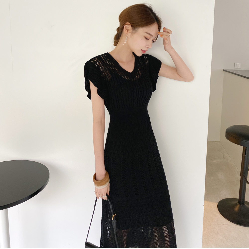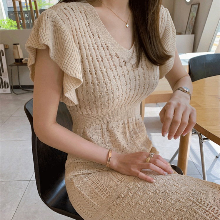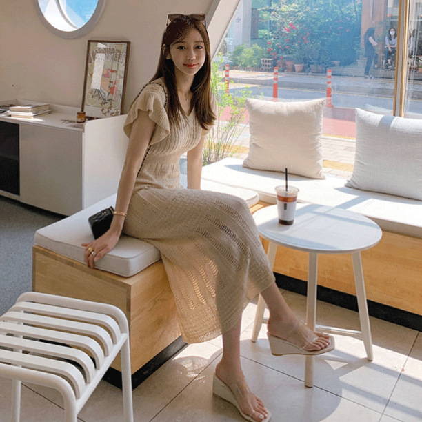 한국 여성용 여름 슬림 핏 젠틀 V 넥 러플 반팔 하이 웨이스트 롱 원피스 베이스 슬링