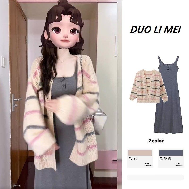 봄 한국 드라마 여성 착용 기질 여신 팬 프랑스 플라티코돈 줄무늬 니트 카디건 원피스 2 피스 세트스토어 가기