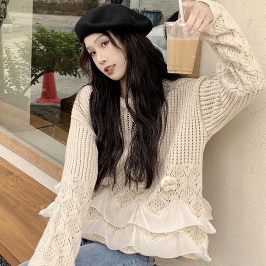 바느질 3 차원 꽃 세련된 스웨터 가을 2025 새로운 디자인 센스 패션 느슨한 긴 소매 니트 탑
