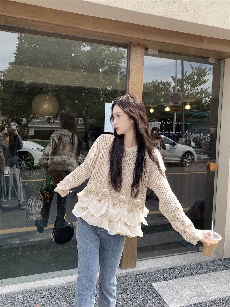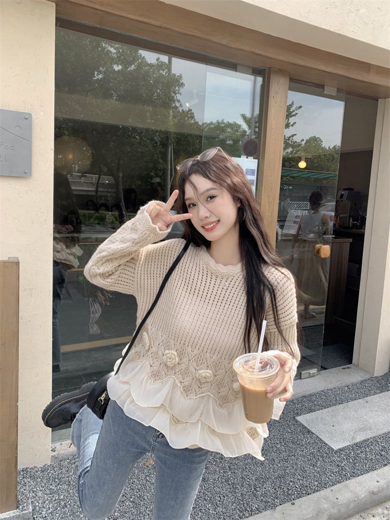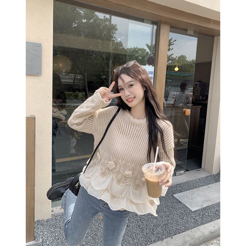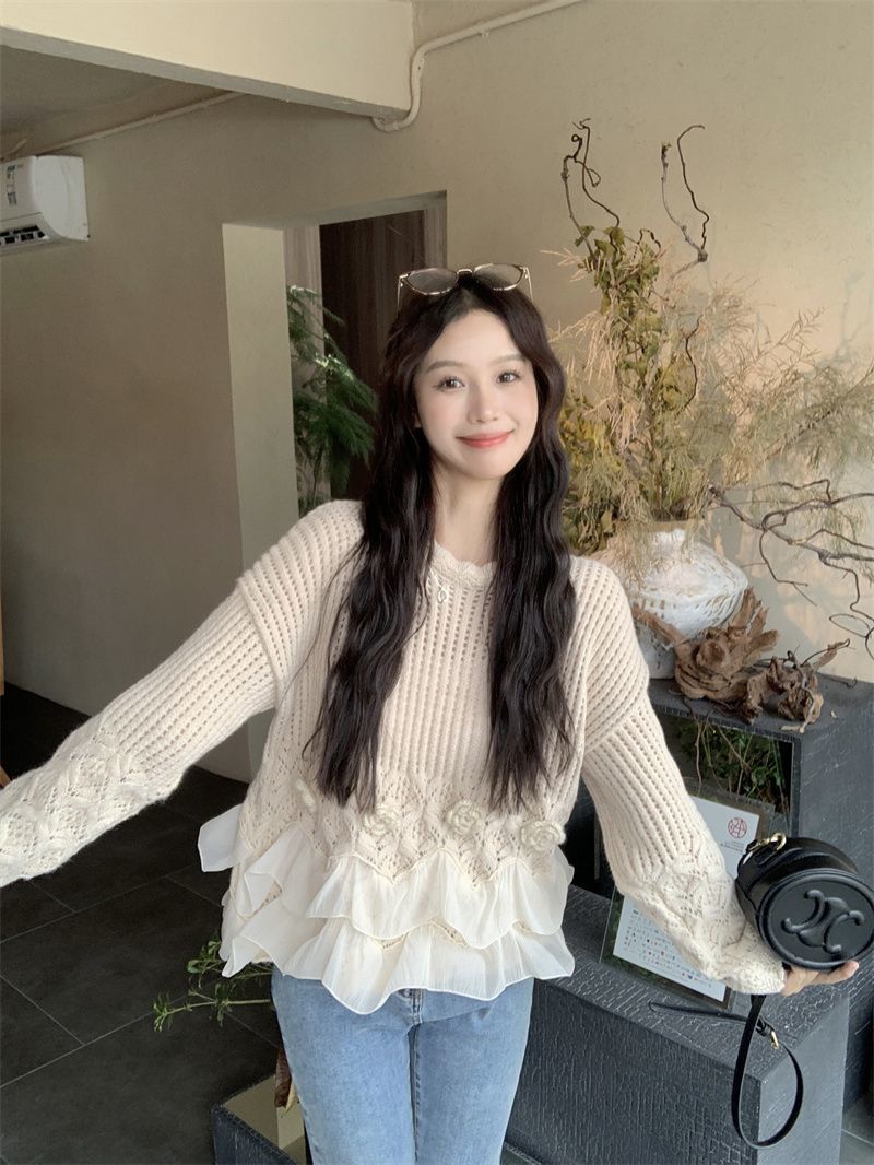 바느질 3 차원 꽃 세련된 스웨터 가을 2025 새로운 디자인 센스 패션 느슨한 긴 소매 니트 탑스토어 가기