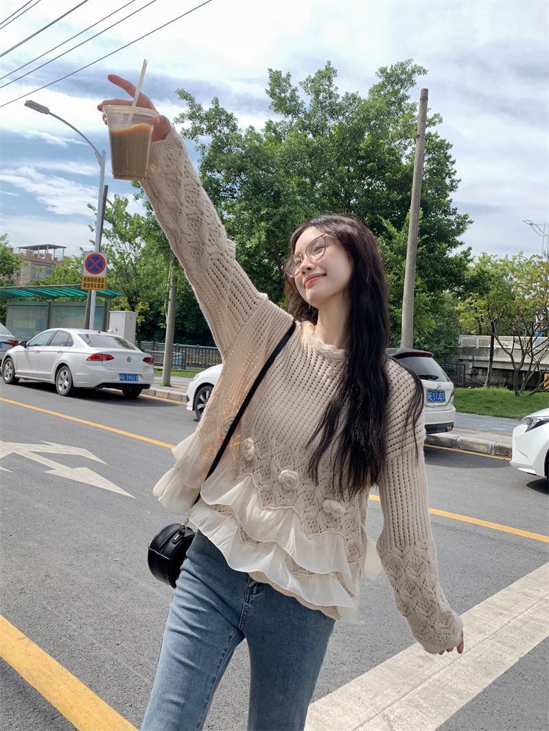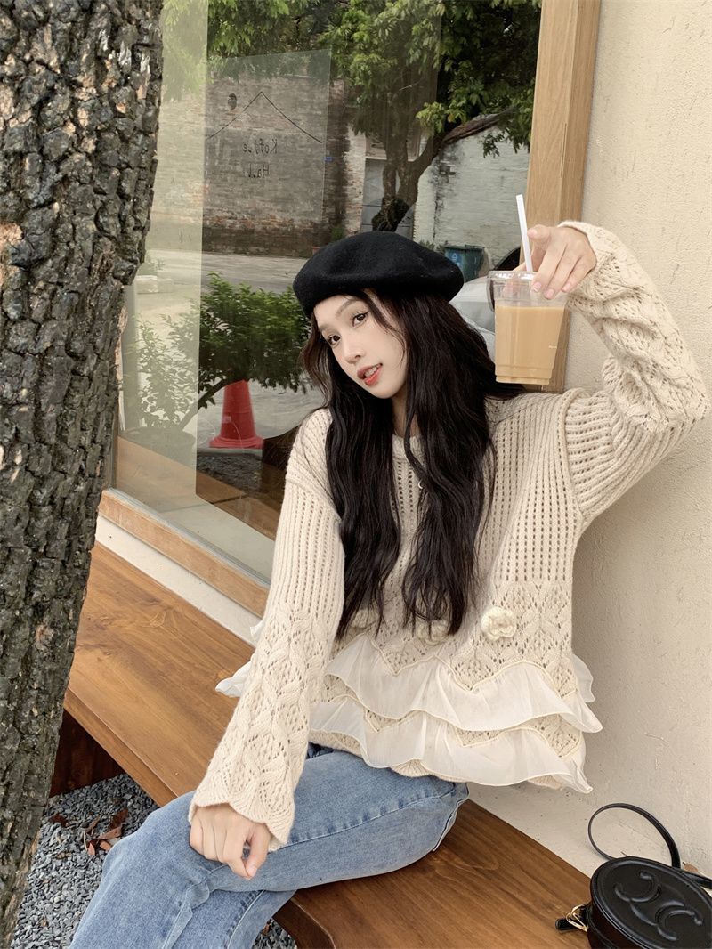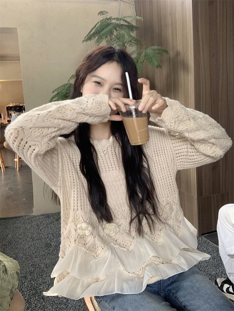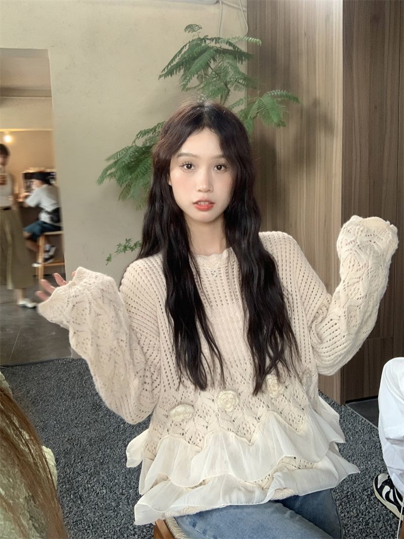 바느질 3 차원 꽃 세련된 스웨터 가을 2025 새로운 디자인 센스 패션 느슨한 긴 소매 니트 탑스토어 가기