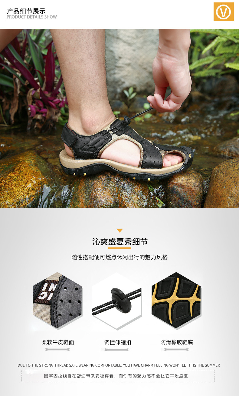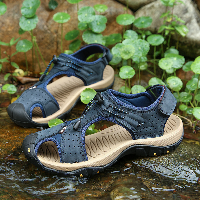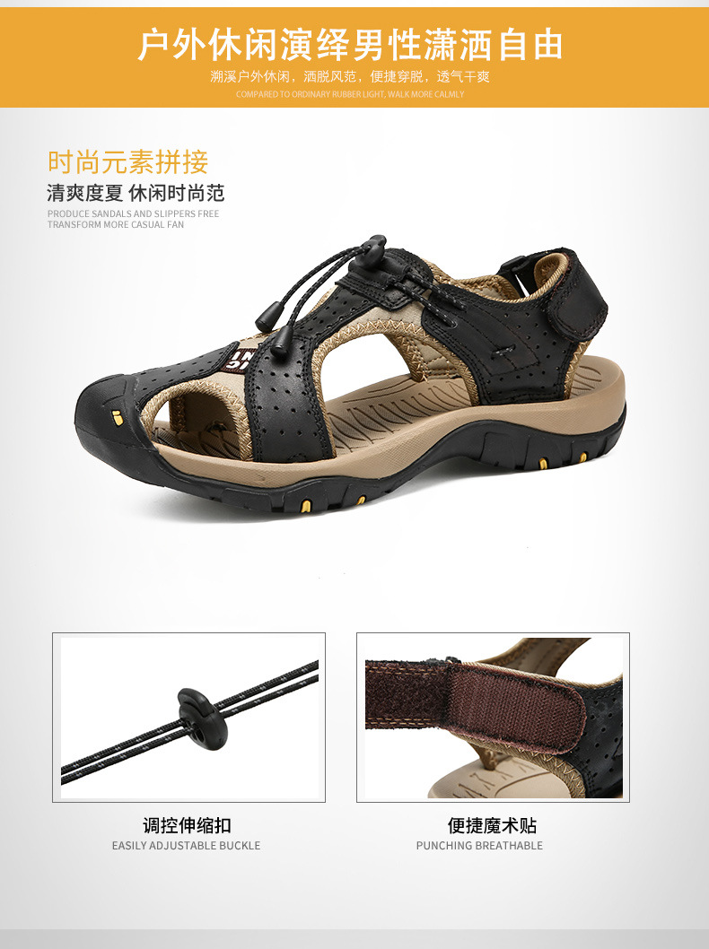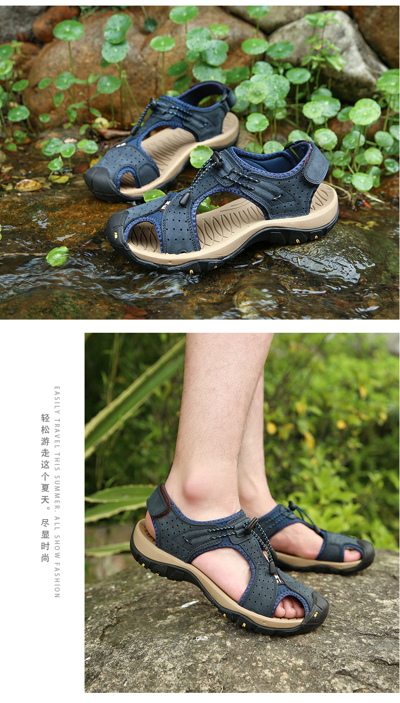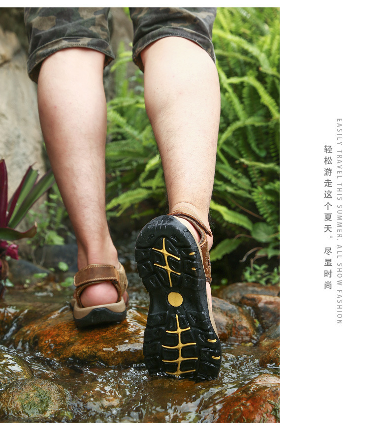 국경 간 폭발 남자 슬리퍼 탑 레이어 진짜 소 가죽 여름 속이 빈 샌들 야외 통기성 비치 슈즈 남성용 아웃도어
