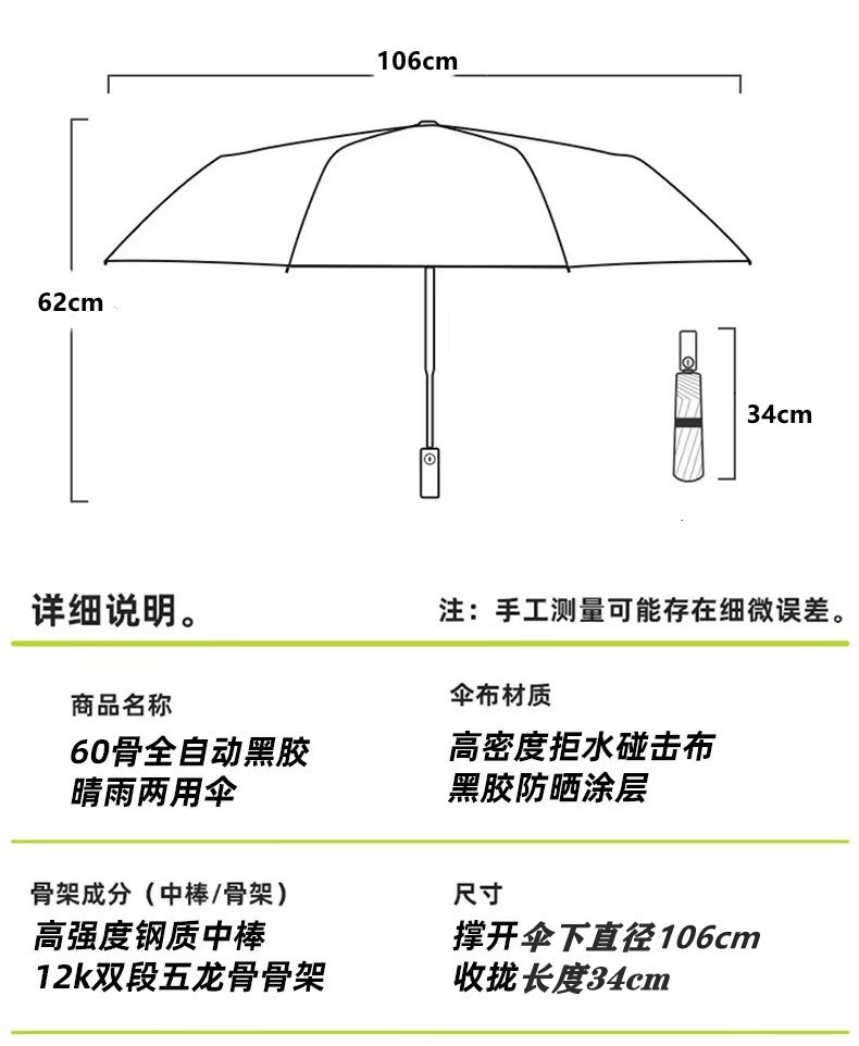 60-뼈 우산 대형 자동 접히는 우산 블랙 고무 태양 보호 및 비 보호 이중 사용 양산 우산 광고 우산 모리 여성 학생스토어 가기
