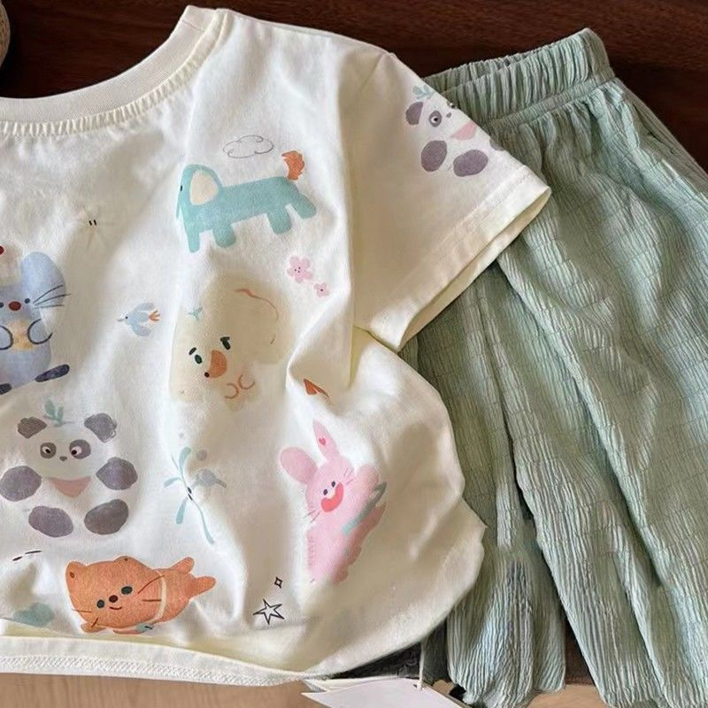 한국 아동복 소녀 세트 여름 어린이 귀여운 만화 반팔 티셔츠 캐주얼 그린 안티 모기 바지 투피스 세트