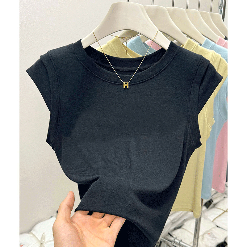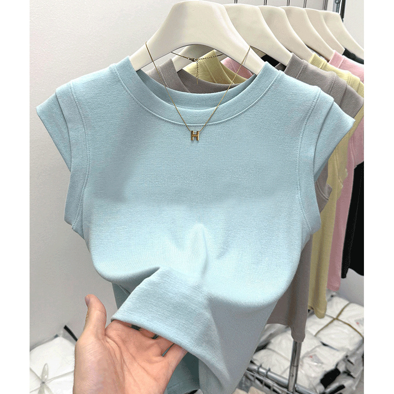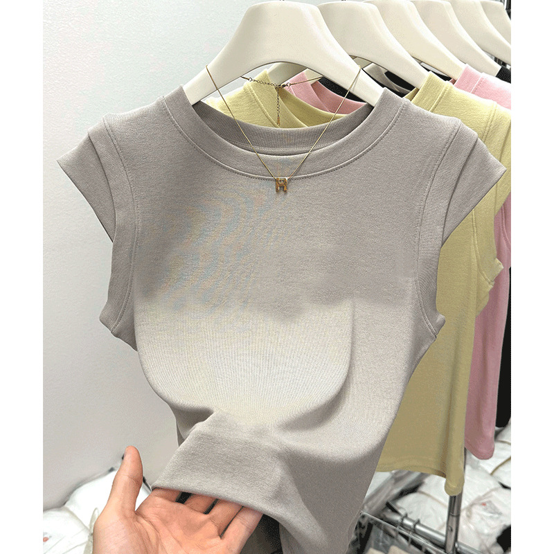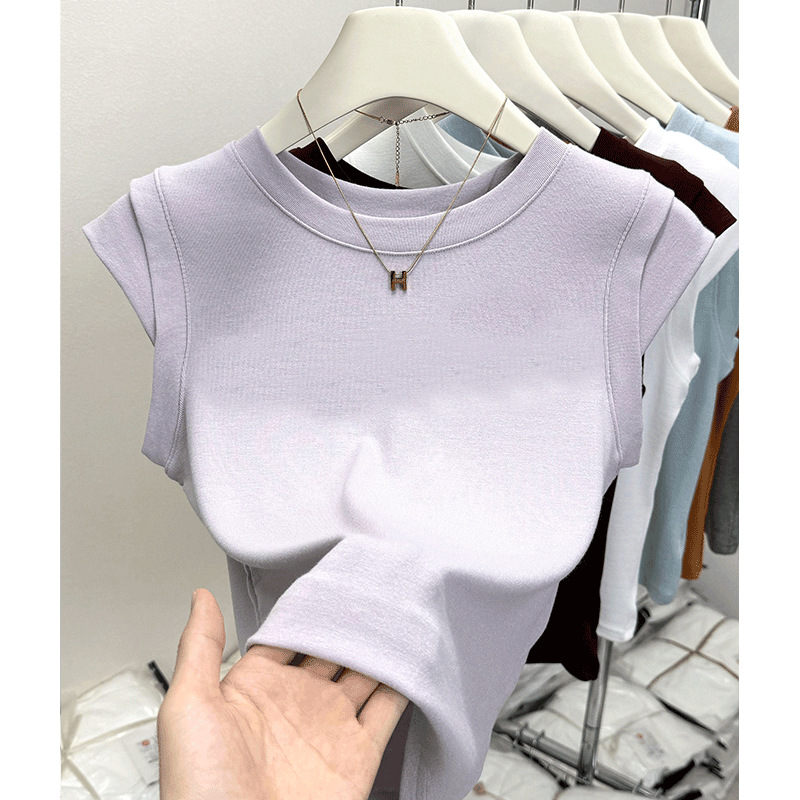 2025 여름 새로운 작은 비행 소매 라운드 넥 타이트 반팔 티셔츠 여성용 슬림 핏 짧은 간단한 우아한 매일 탑