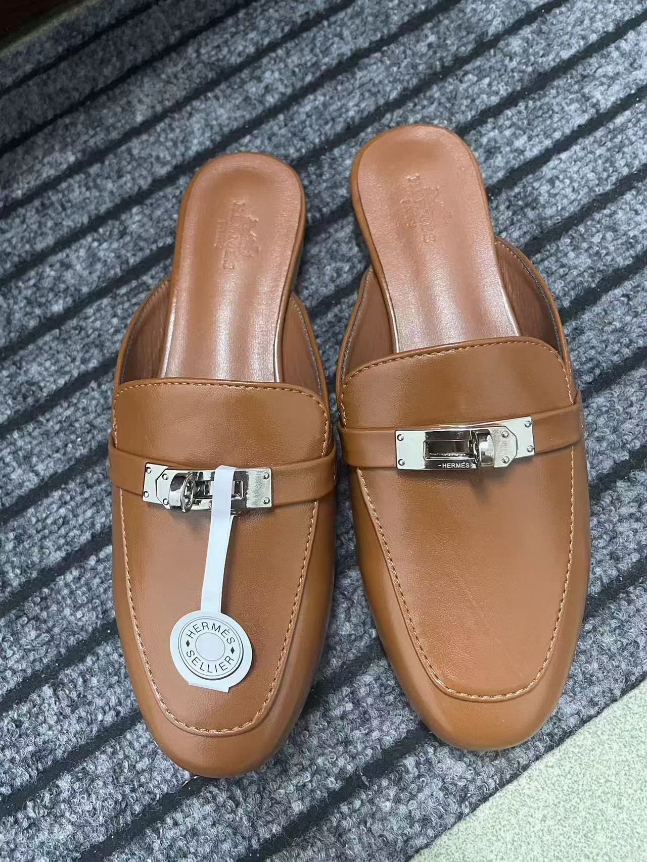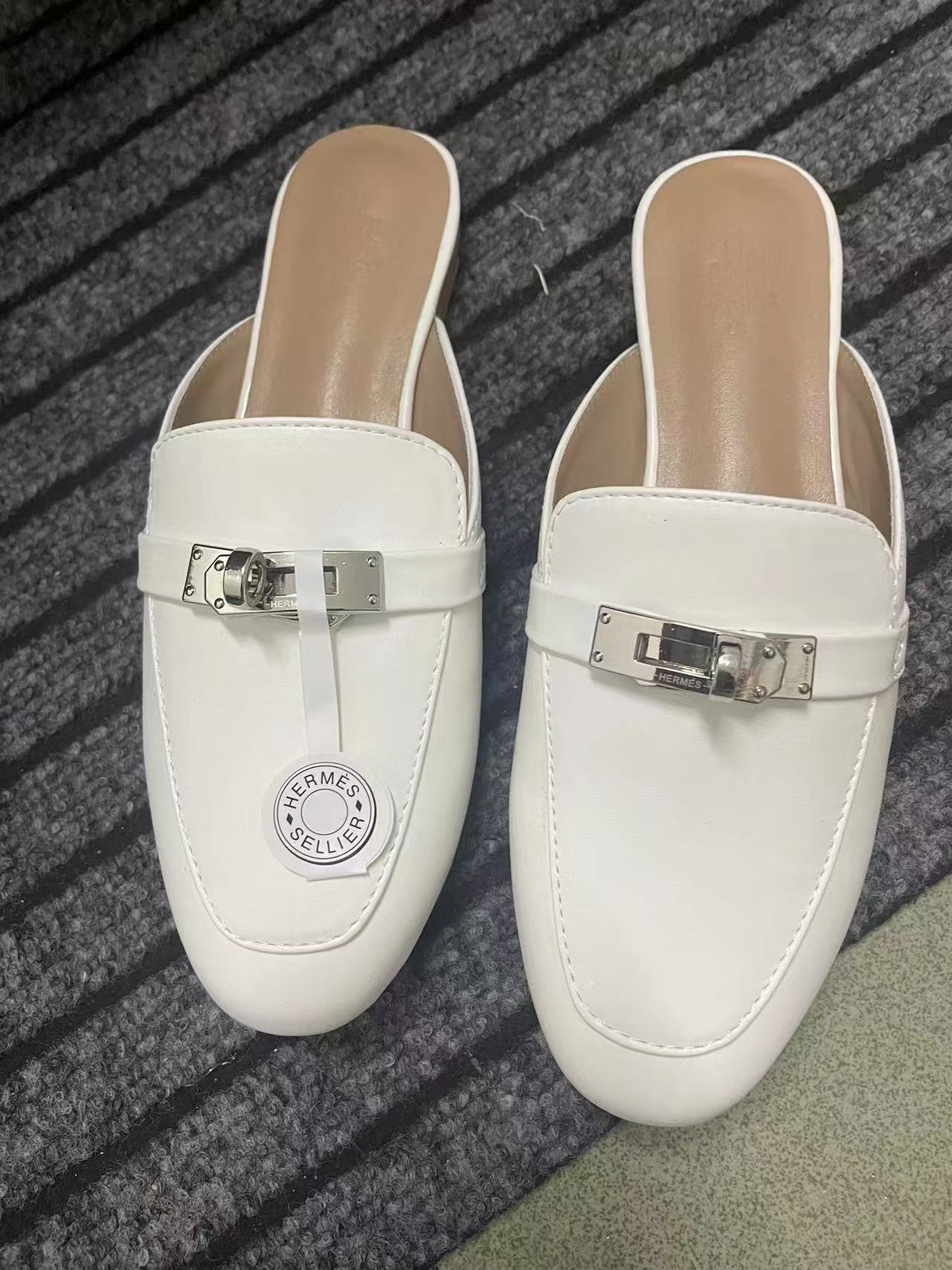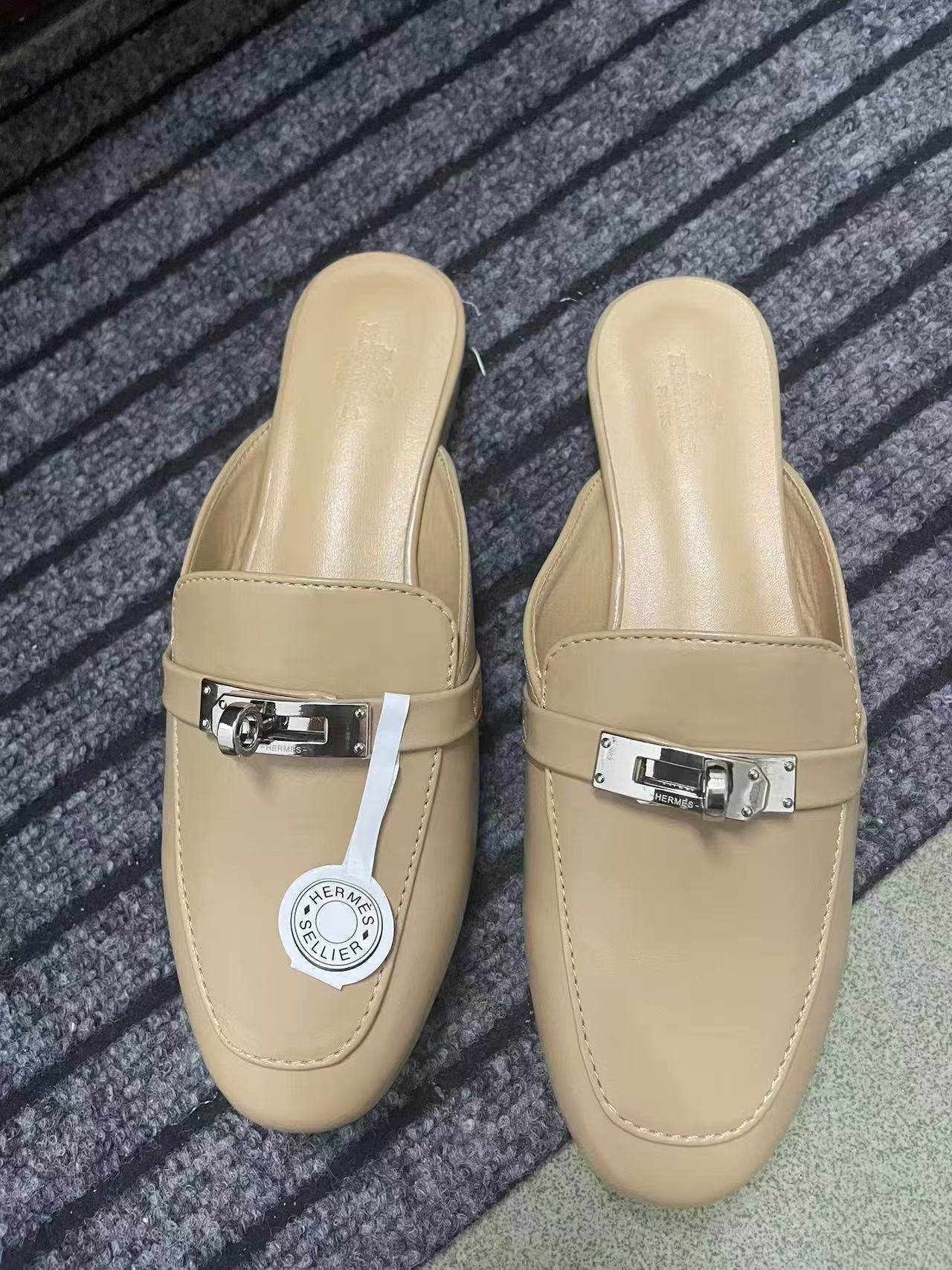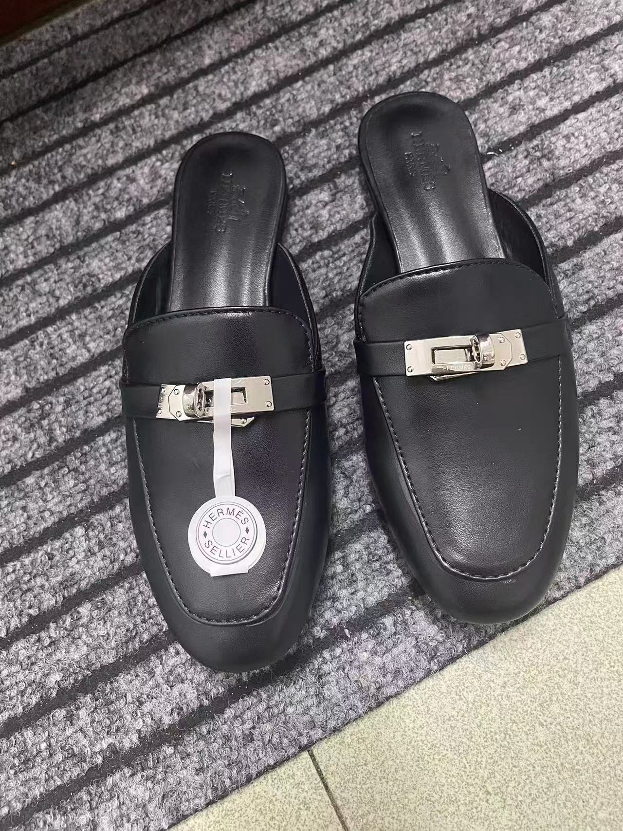 재고 있음! 하이 버전 2025 새로운 Baotou 슬리퍼 여성 플랫 금속 버클 H 가족 게으른 슬립 온 하프 슬리퍼