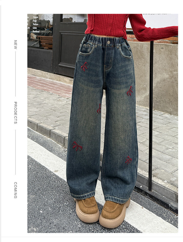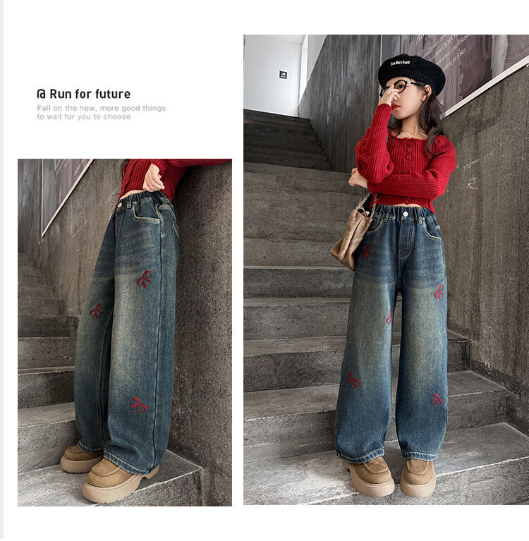 봄과 가을 새로운 스타일 여아 청바지 스트레이트 팬츠 와이드 팬츠 중대형 아동 루즈한 데님 스트레이트 팬츠 여아 봄과 가을 의류