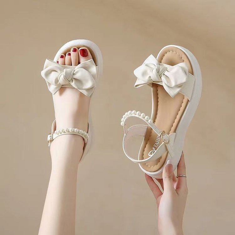 페어리 스타일 활 샌들 여성 여름 새로운 두꺼운 밑창 진주 탄성 오픈 발가락 로마 비치 슈즈스토어 가기