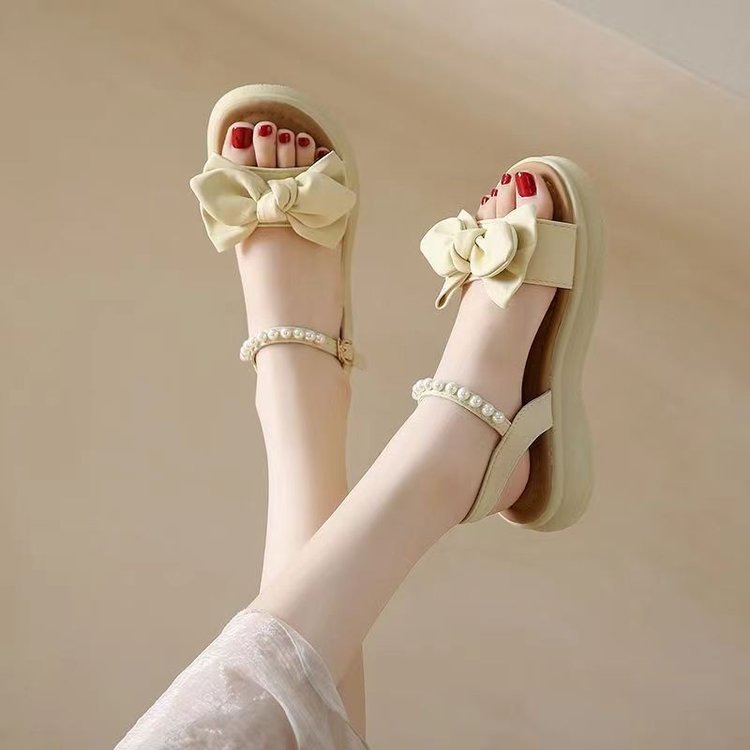 페어리 스타일 활 샌들 여성 여름 새로운 두꺼운 밑창 진주 탄성 오픈 발가락 로마 비치 슈즈