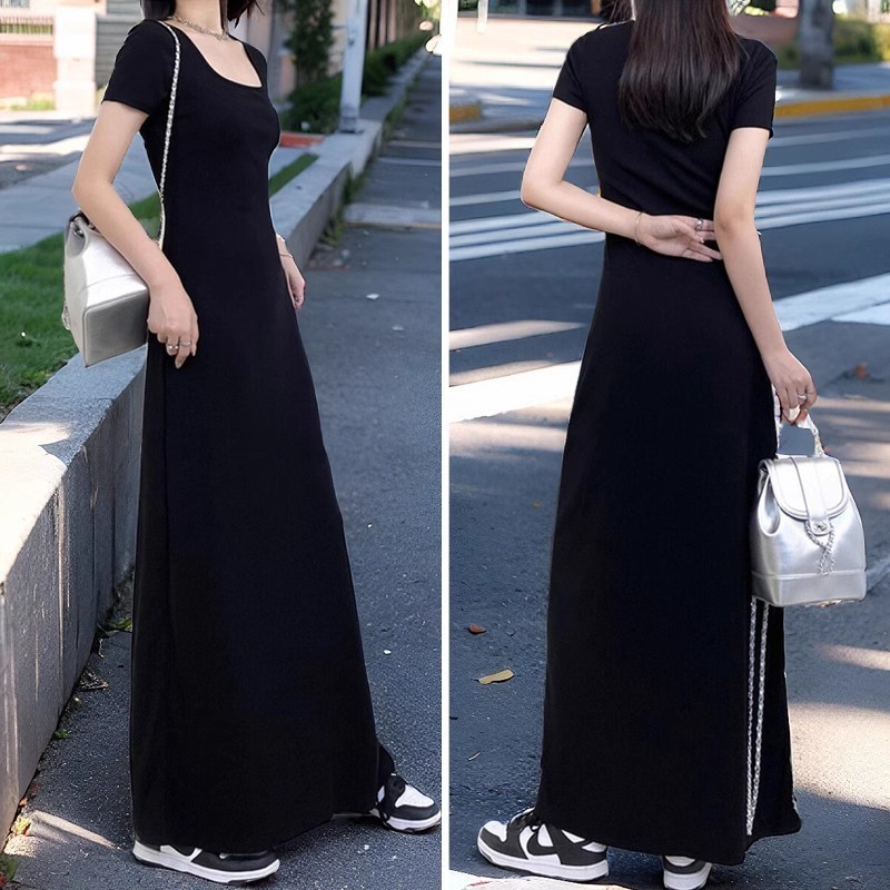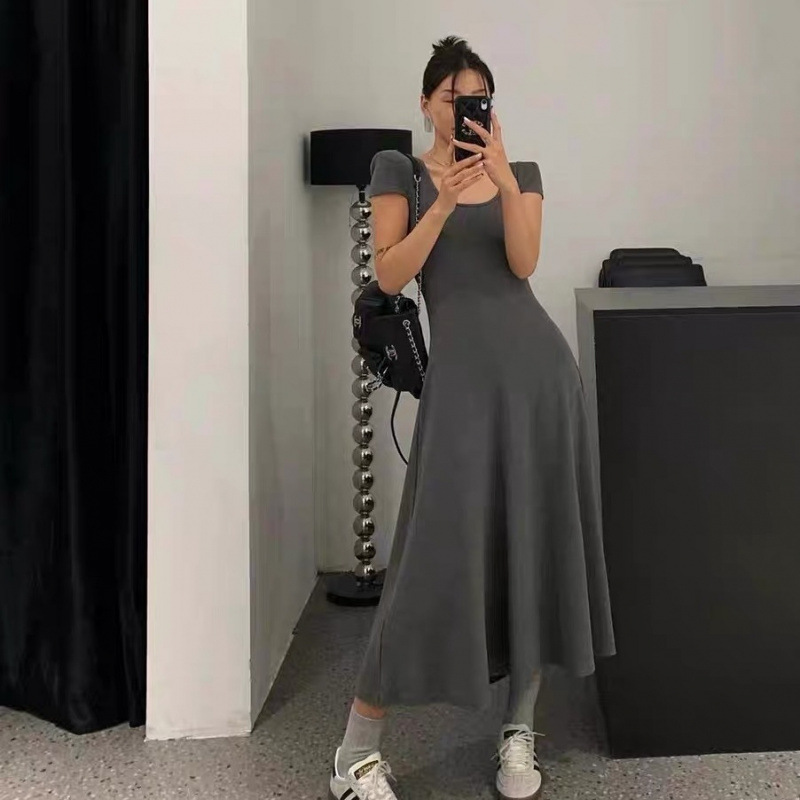 여름 하이 엔드 원피스 육체 덮음 긴 원피스 순수한 욕망 허리-꽉 끼는 슬림-둥근 목 엉덩이 반팔 대형 스커트스토어 가기