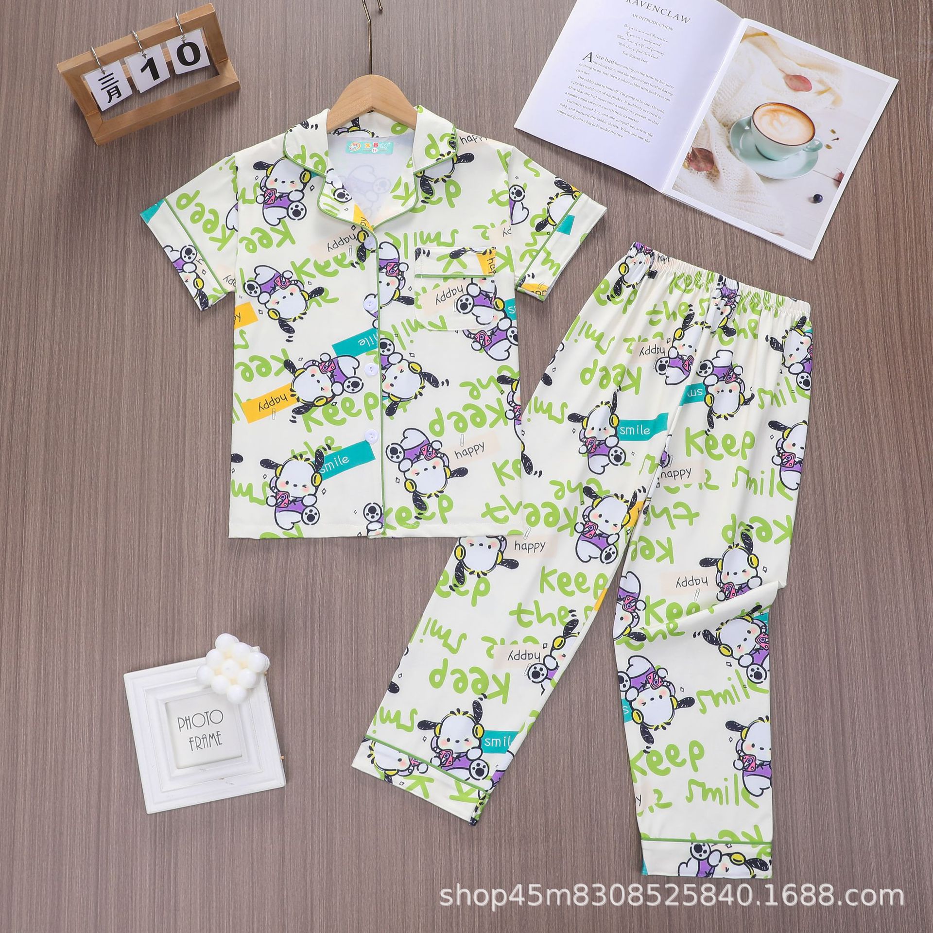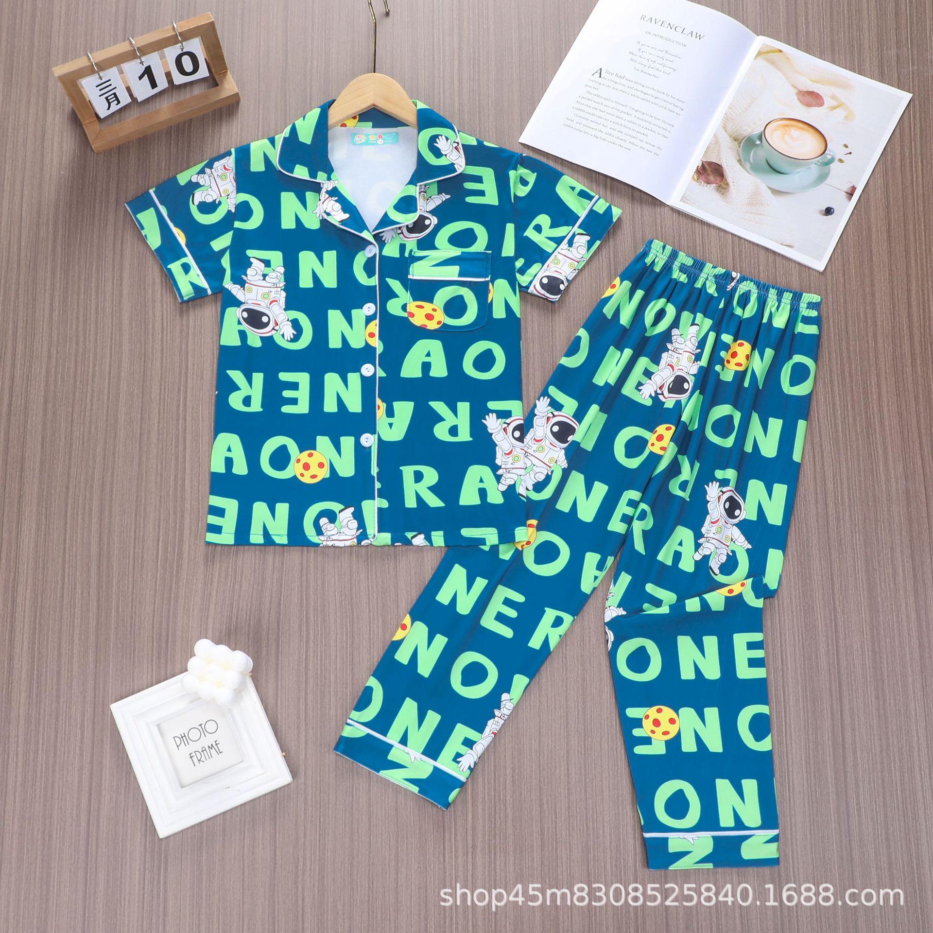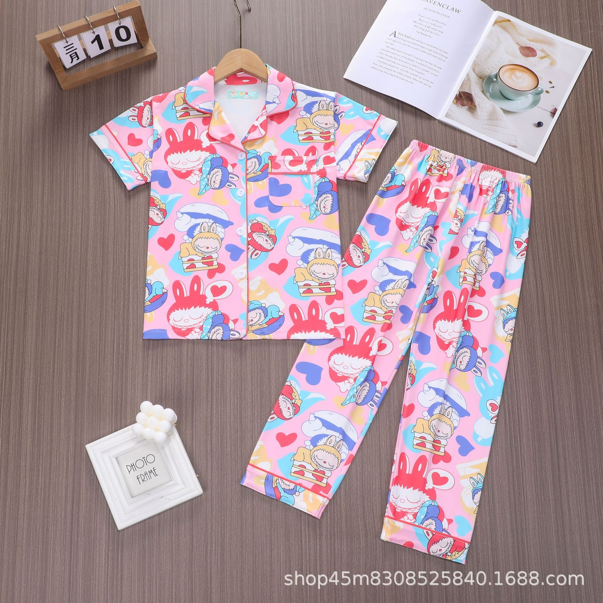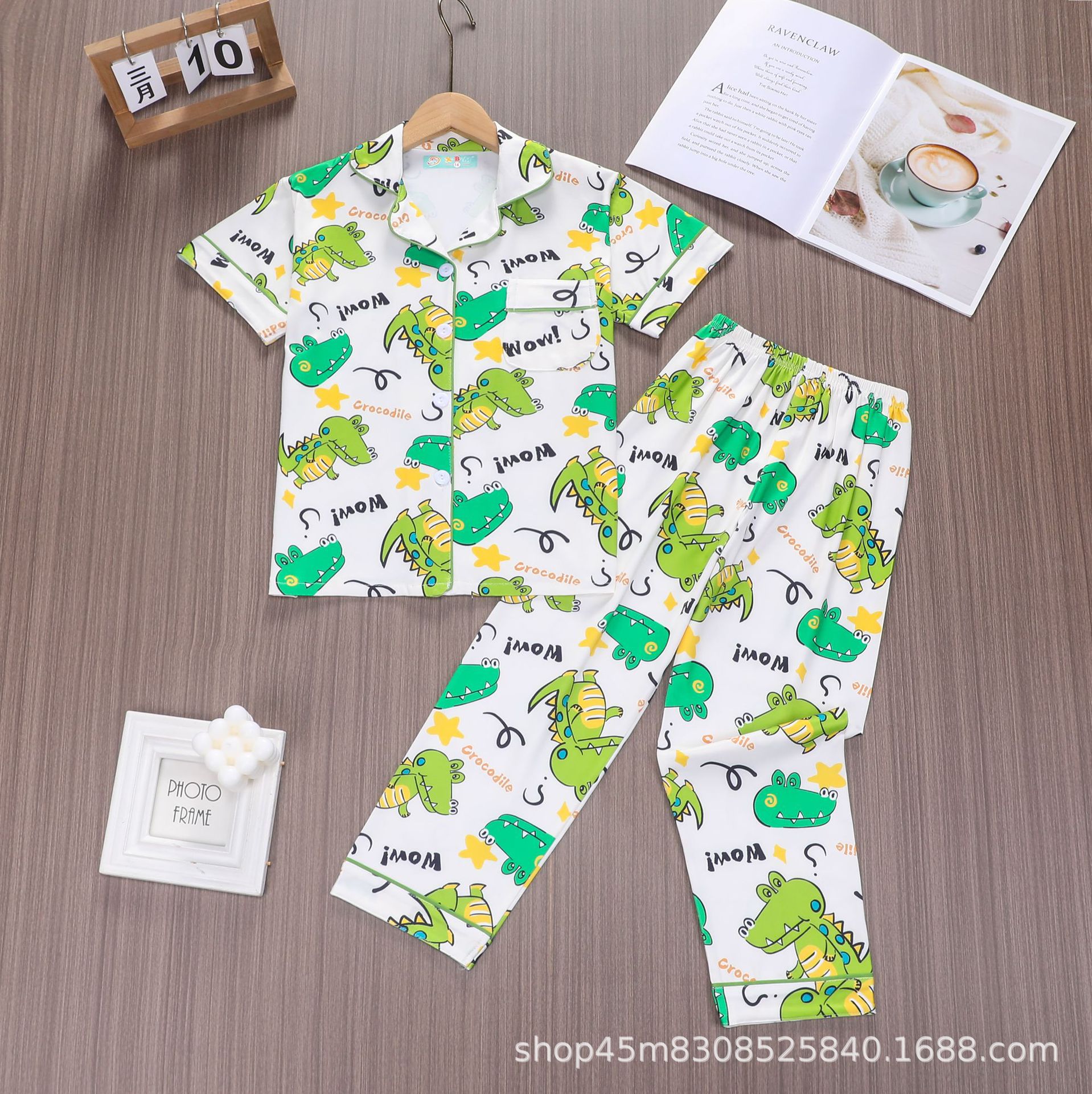 대외 무역 소년 카디건 홈웨어 세트 새로운 반팔 만화 옷깃 바지 여름 모조 면 우유 실크 재고 있음스토어 가기