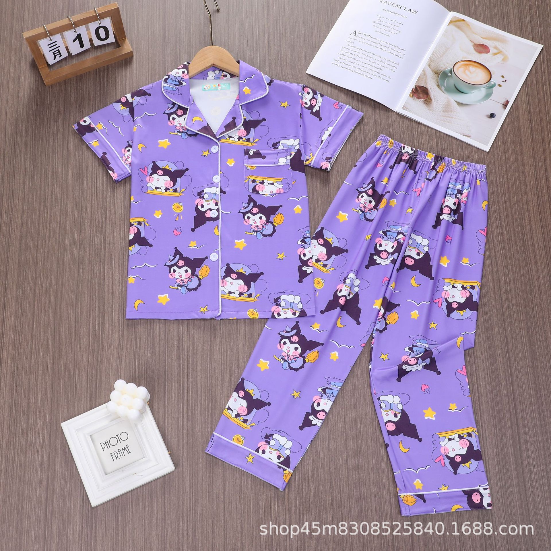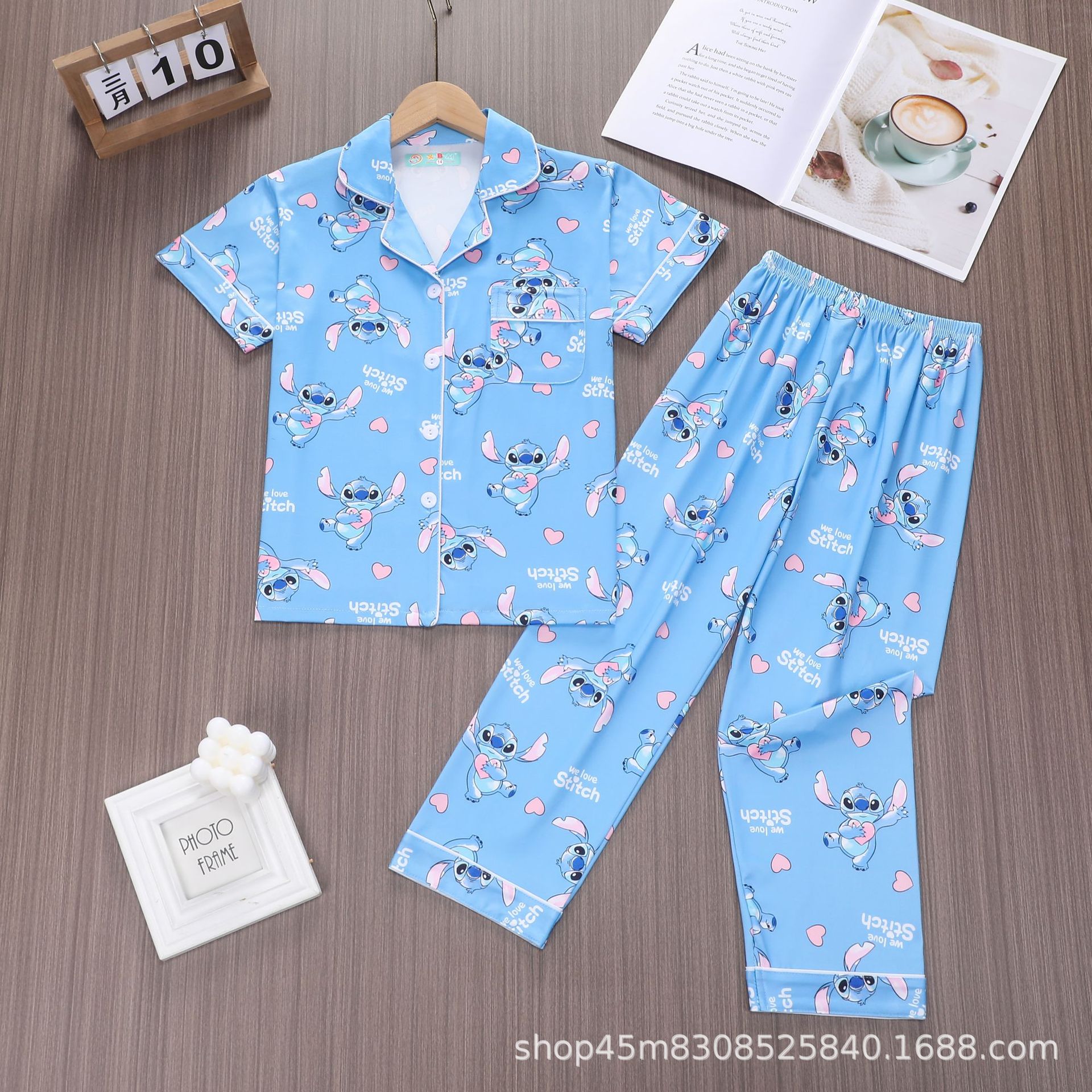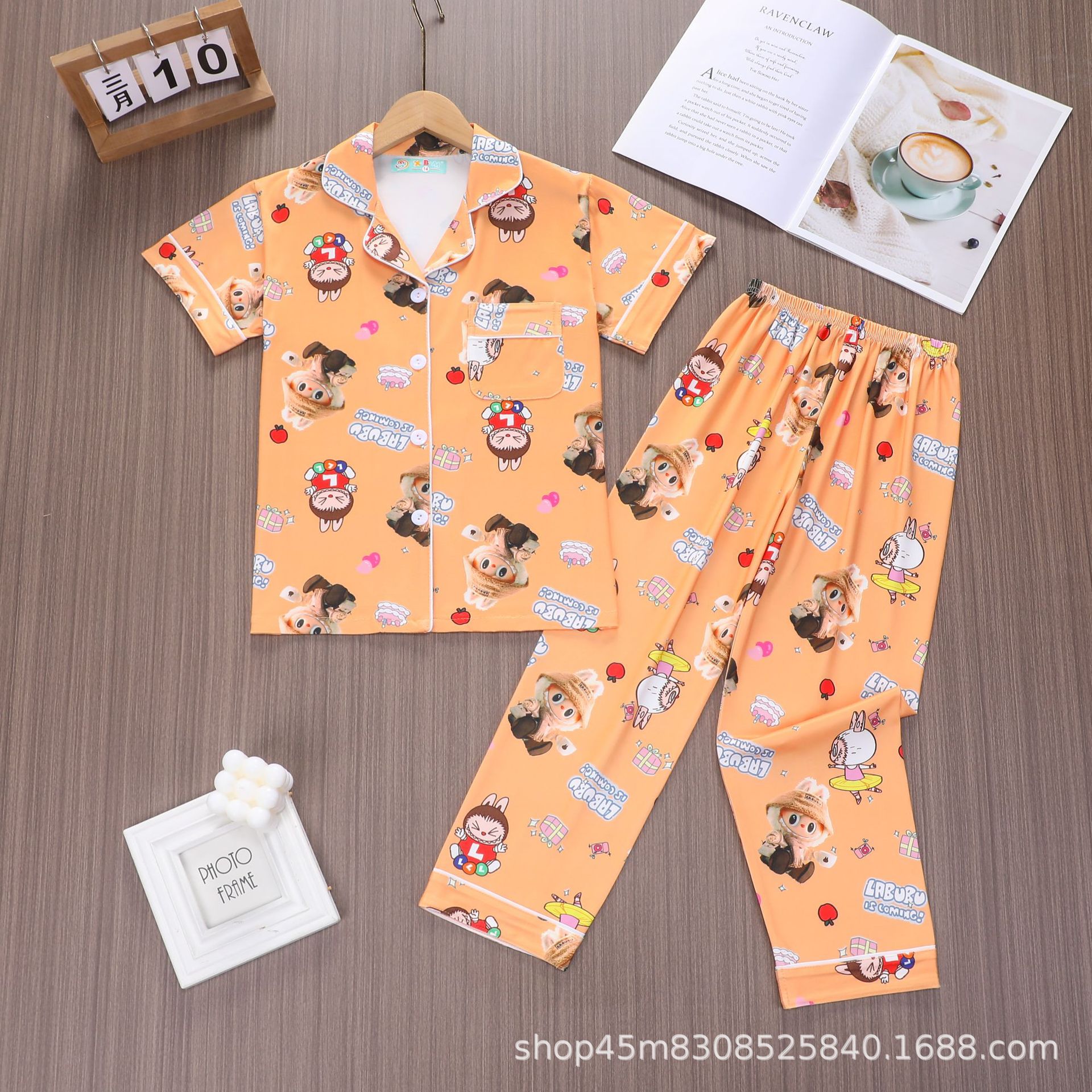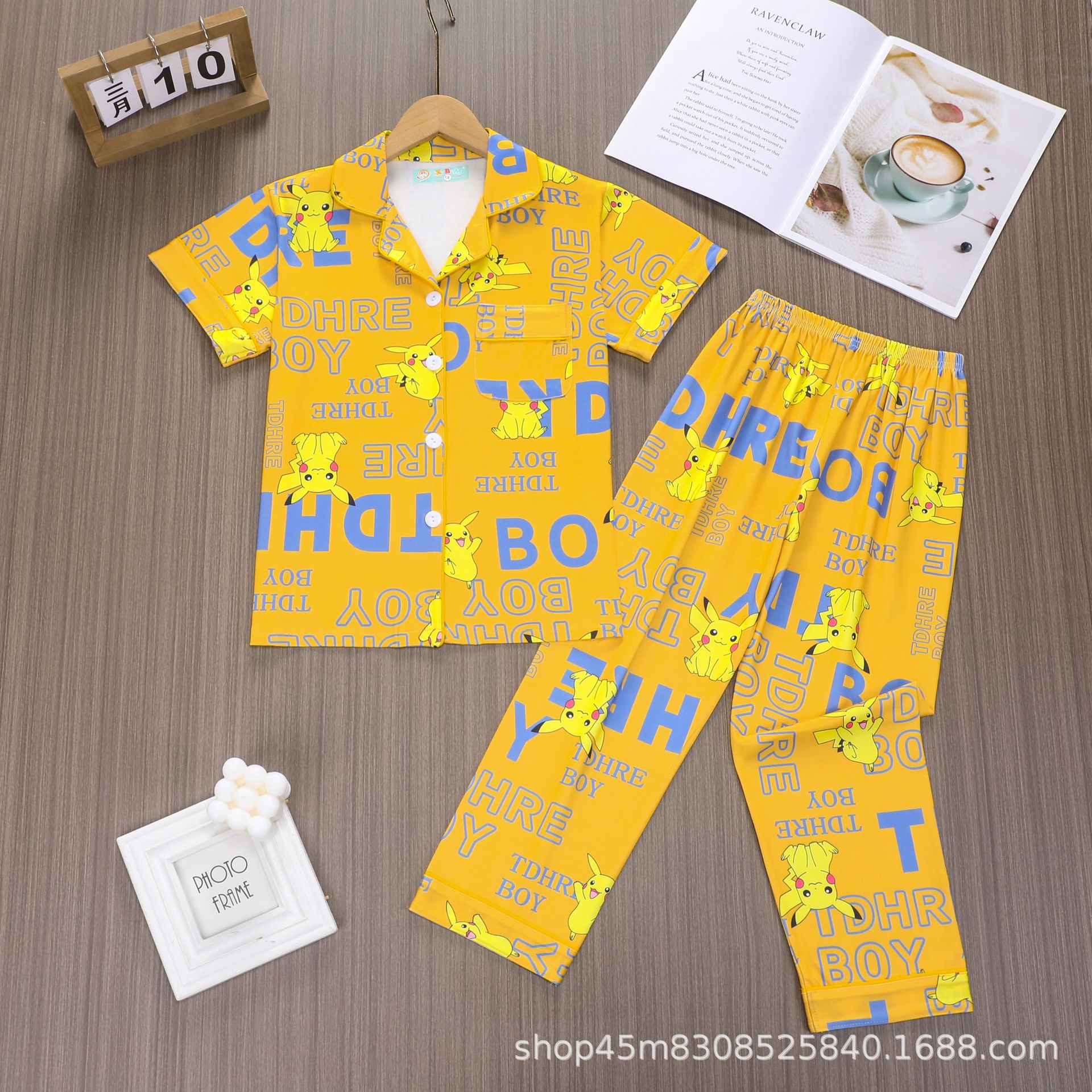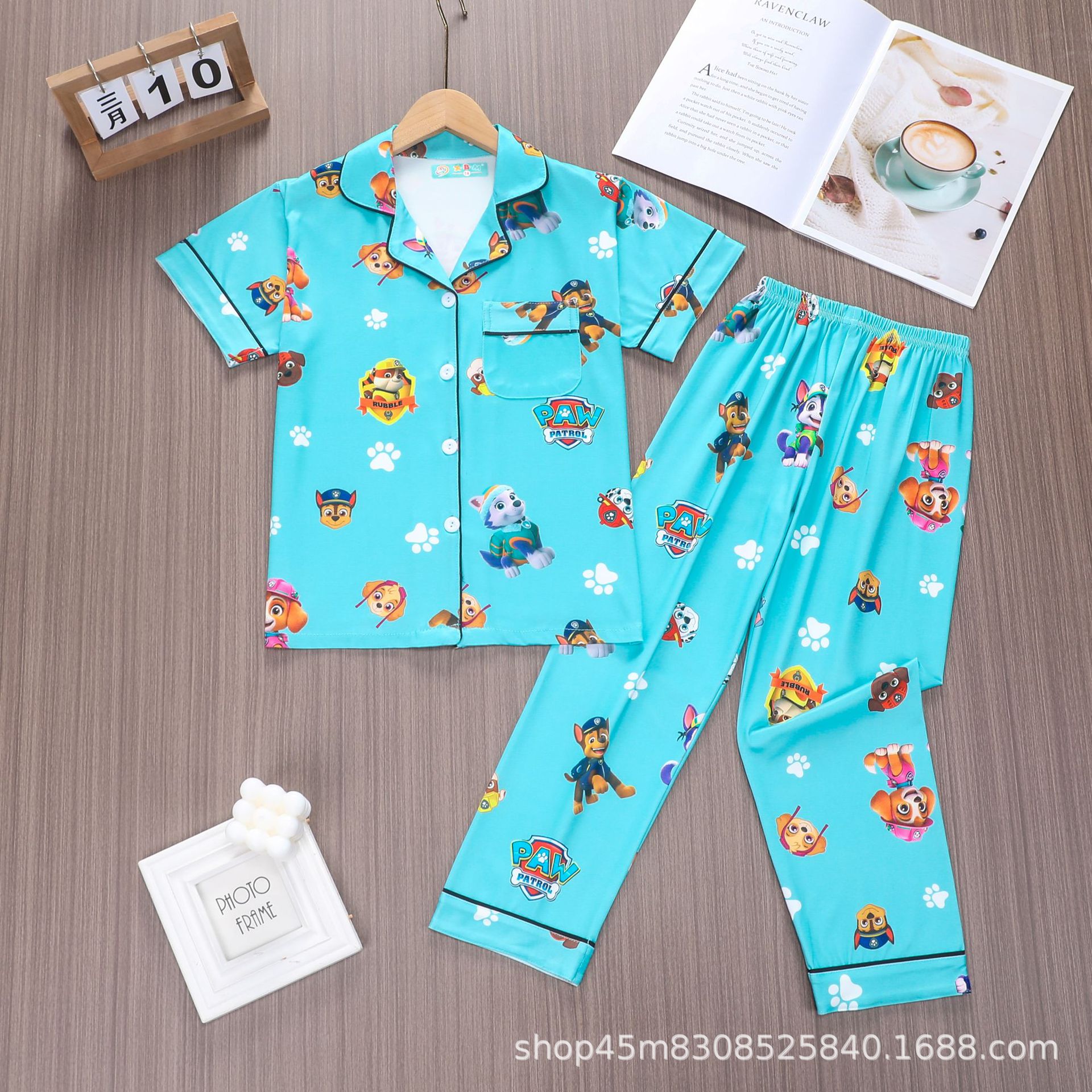 대외 무역 소년 카디건 홈웨어 세트 새로운 반팔 만화 옷깃 바지 여름 모조 면 우유 실크 재고 있음스토어 가기