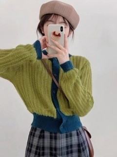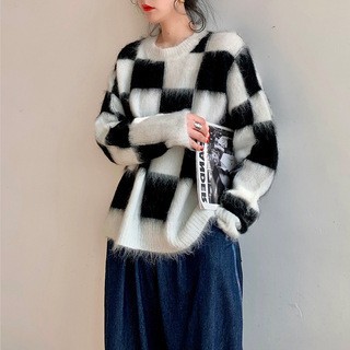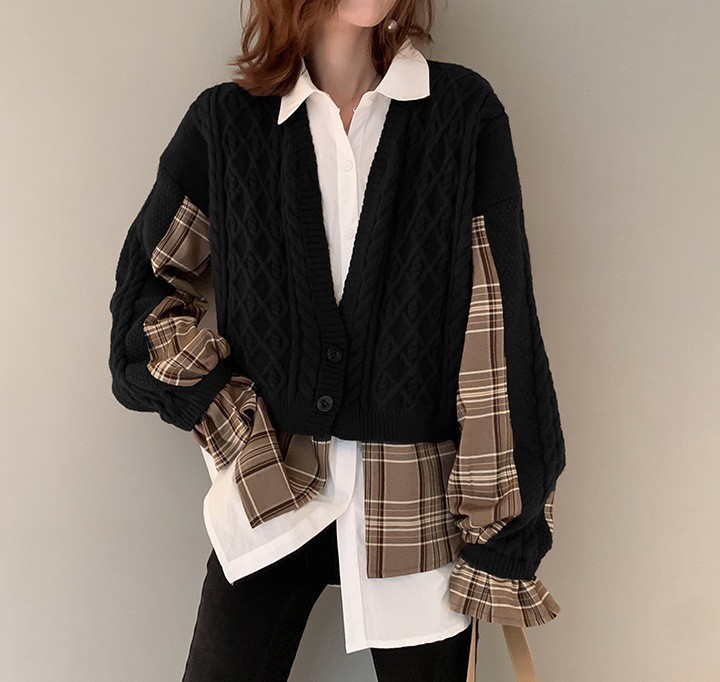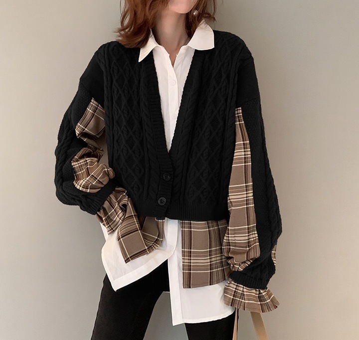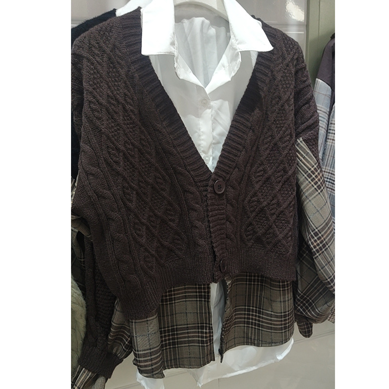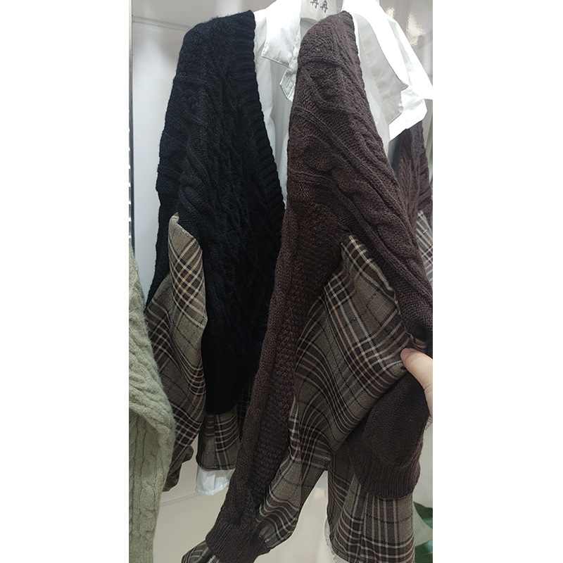 여성을위한 크로스 보더 가짜 투피스 니트 탑 봄, 가을 유럽 스타일의 새로운 유럽 스웨터 격자 무늬 스플 라이스 카디건 재킷스토어 가기