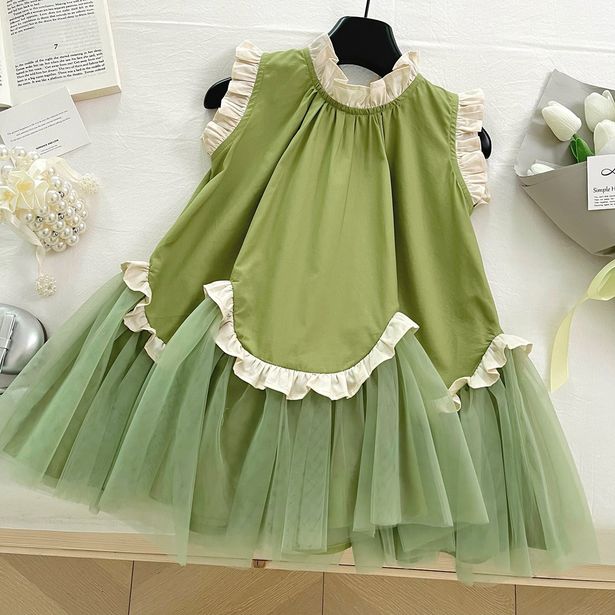 여름 2025 새로운 한국 스타일 소녀의 레이스 민소매 메쉬 원피스 소녀의 공주 원피스
