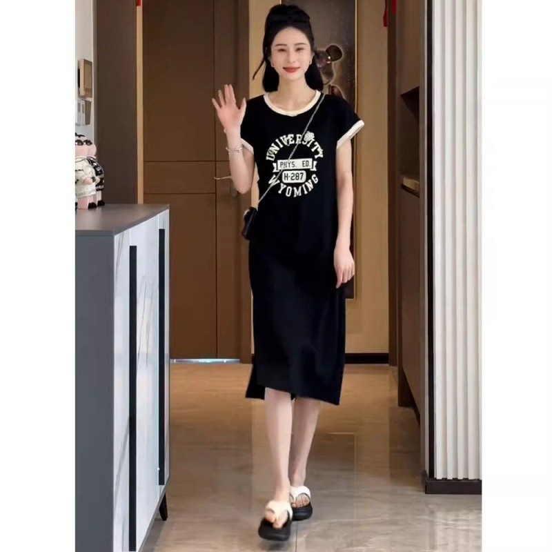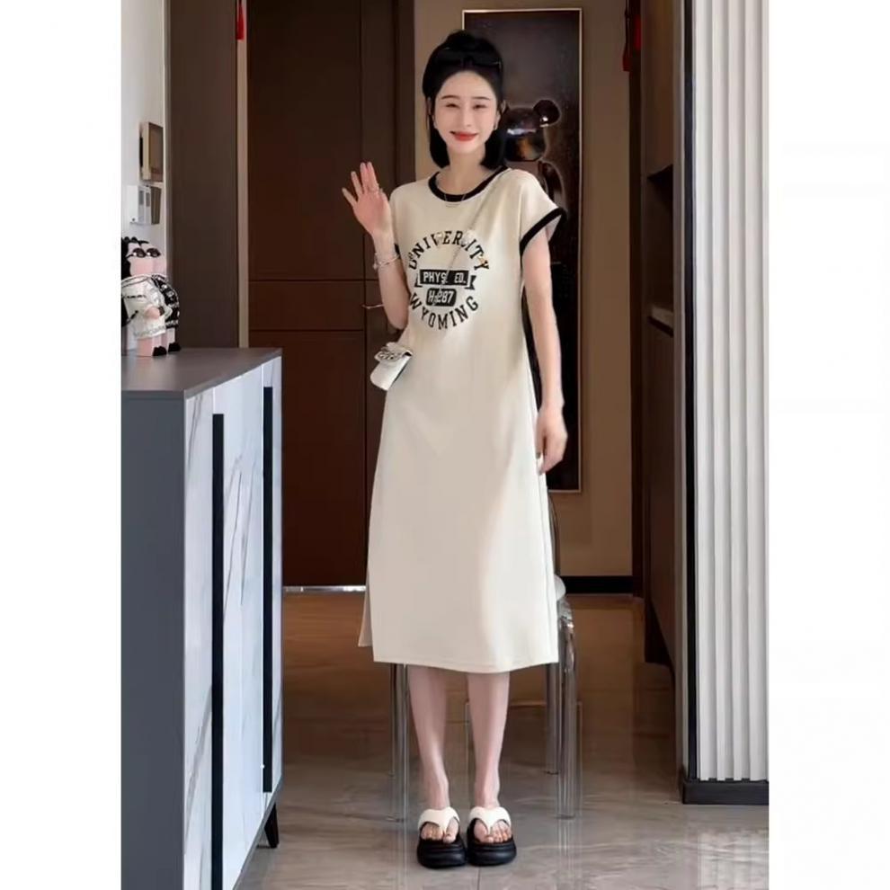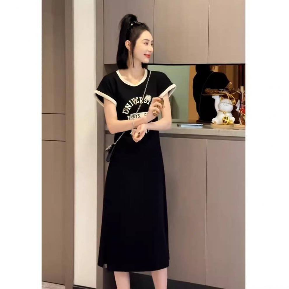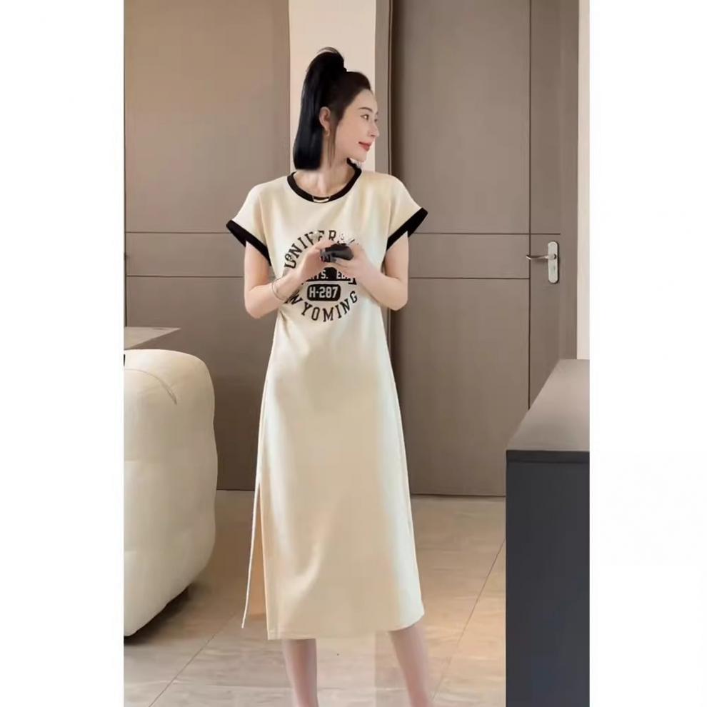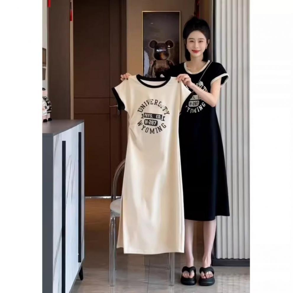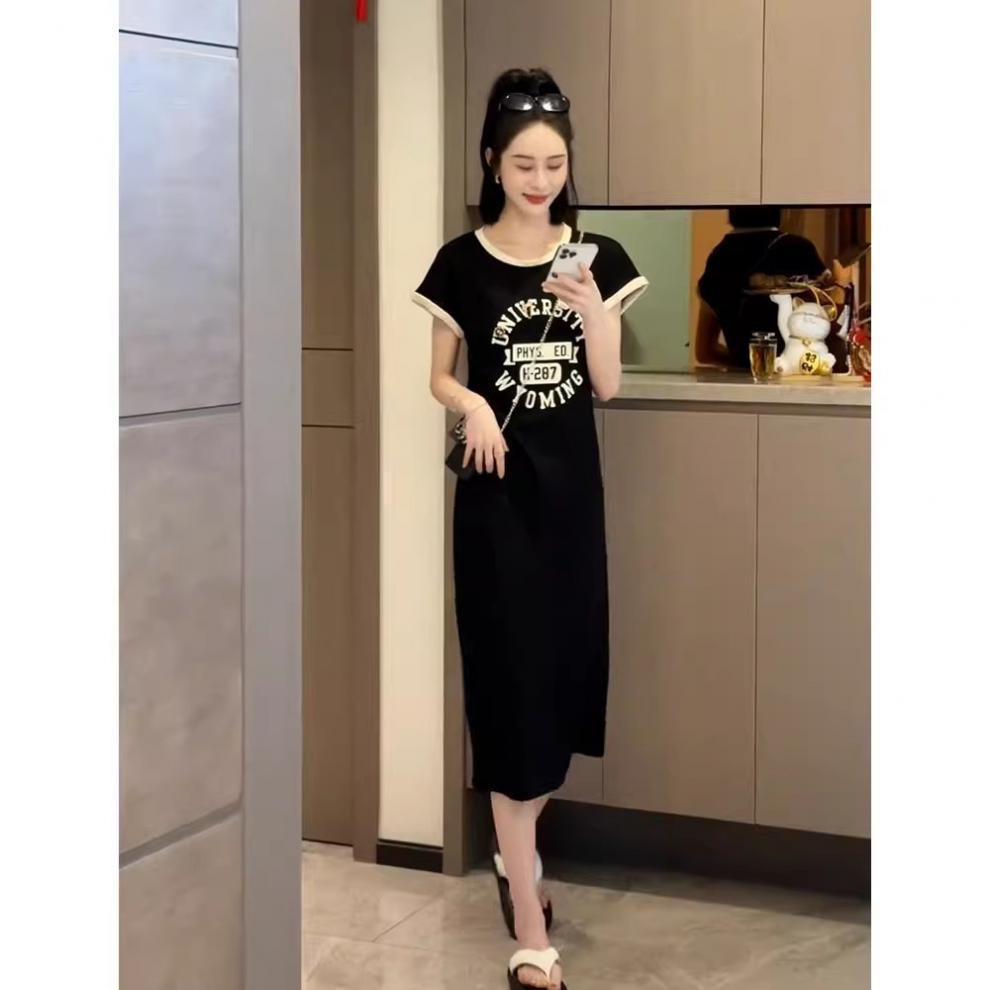 한국 스타일 여름 새로운 유행 세련된 스몰 사이즈 편지 타이트 허리 인쇄 슬림 룩 짧은 소매 분할 니트 원피스스토어 가기