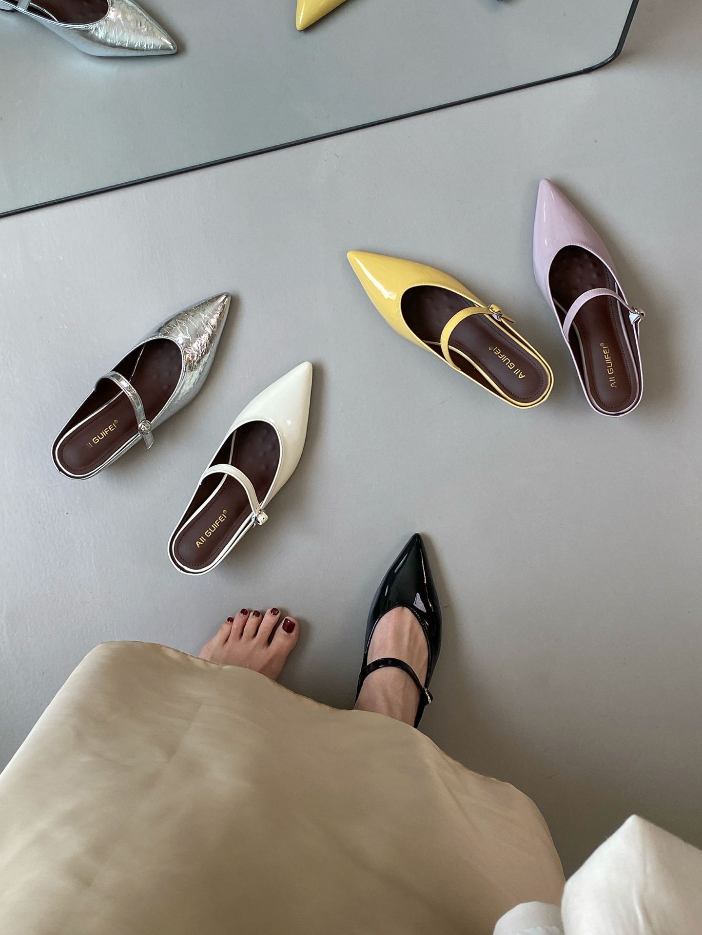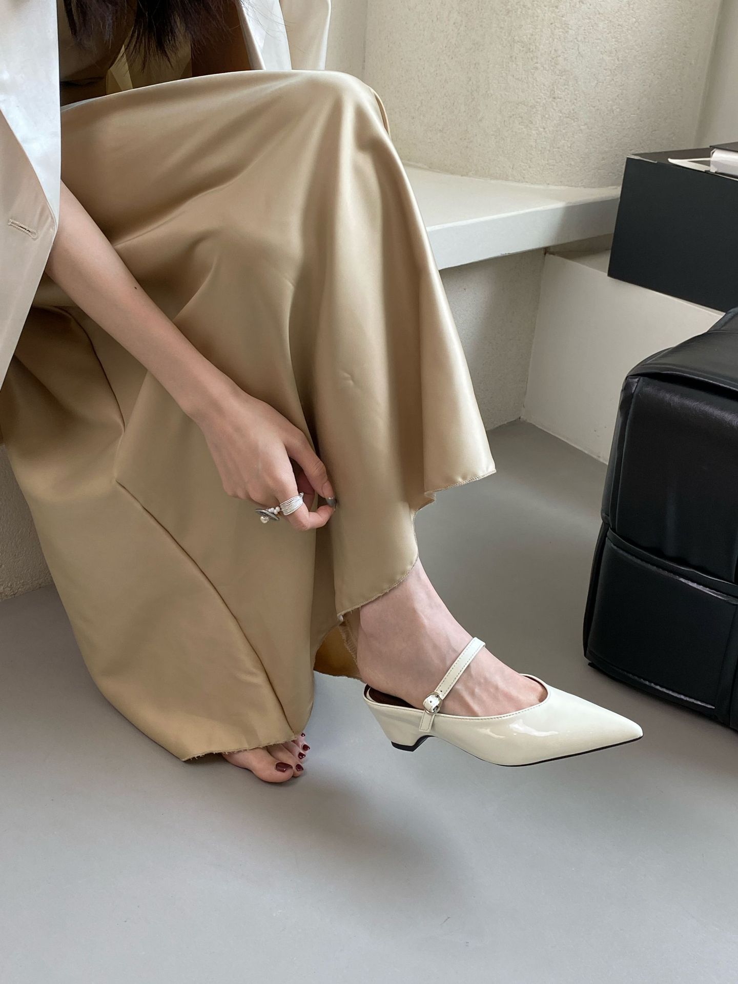 뾰족한 두꺼운 힐 Baotou 하프 슬리퍼 로우 힐 2025 여름 새로운 로우 입 우아한 올 매치 소프트 가죽 로우 힐 샌들스토어 가기