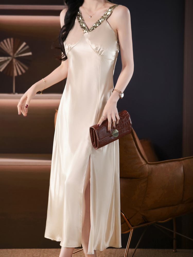 2025 새로운 고급 수제 Sequins 섹시한 우아한 스트랩 원피스 솔리드 컬러 슬림핏 슬리밍 스플릿 바이스 원피스