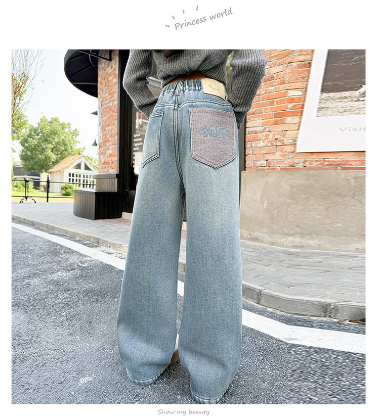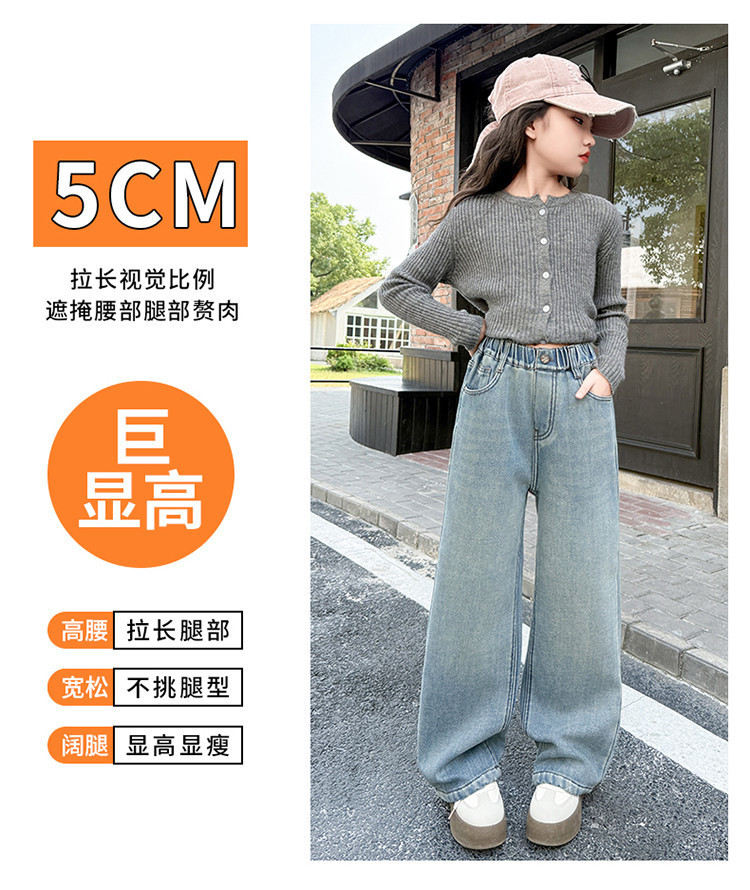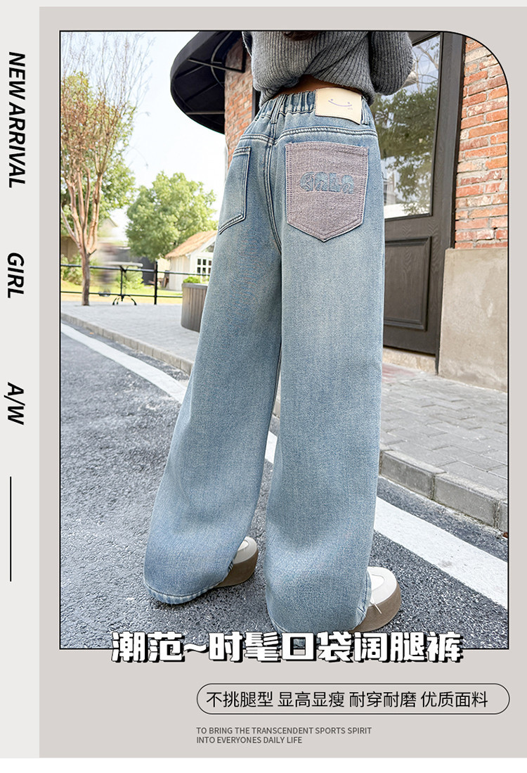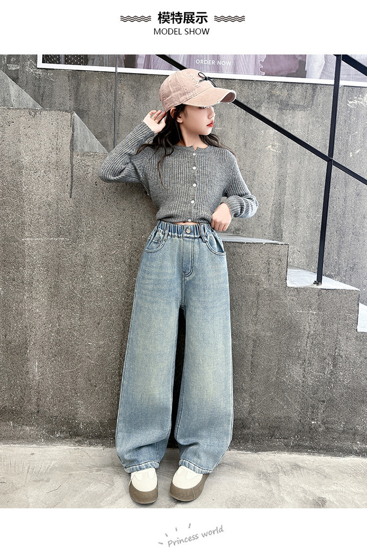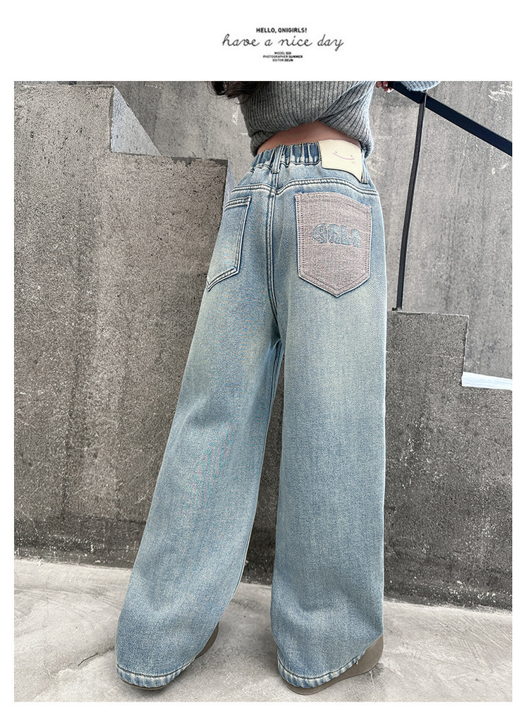봄과 가을 여아 청바지, 아동 패셔너블 루즈 와이드 팬츠, 중대형 아동 바지, 스트레이트 팬츠, 와이드 팬츠, 아동 바지