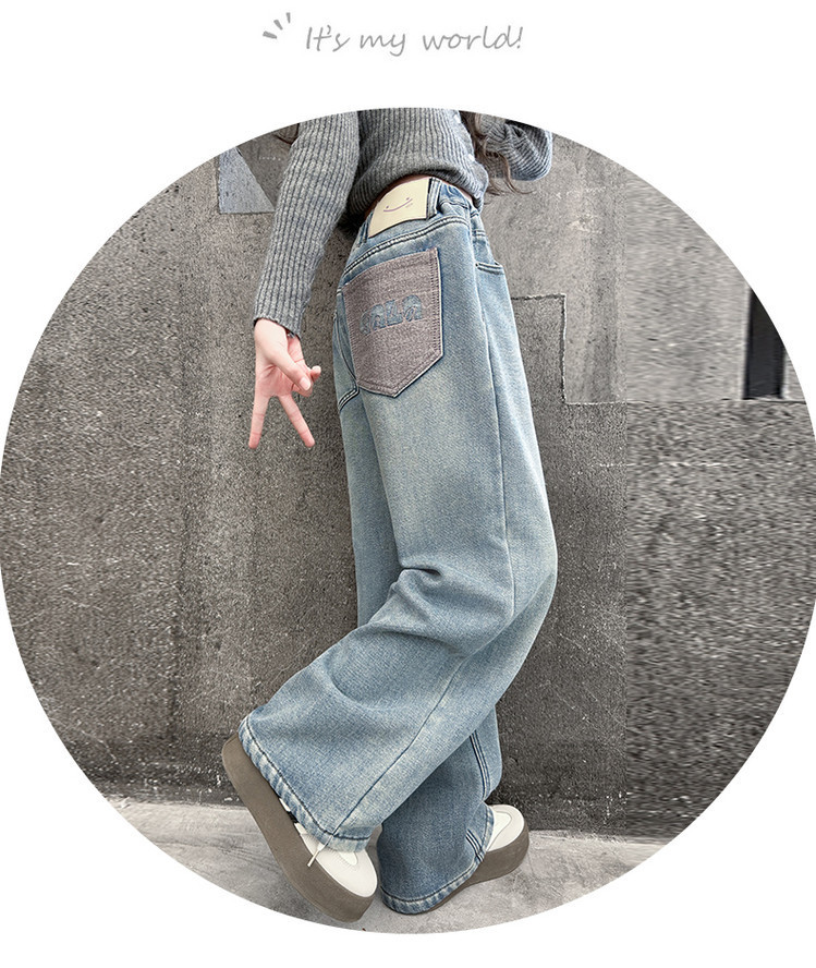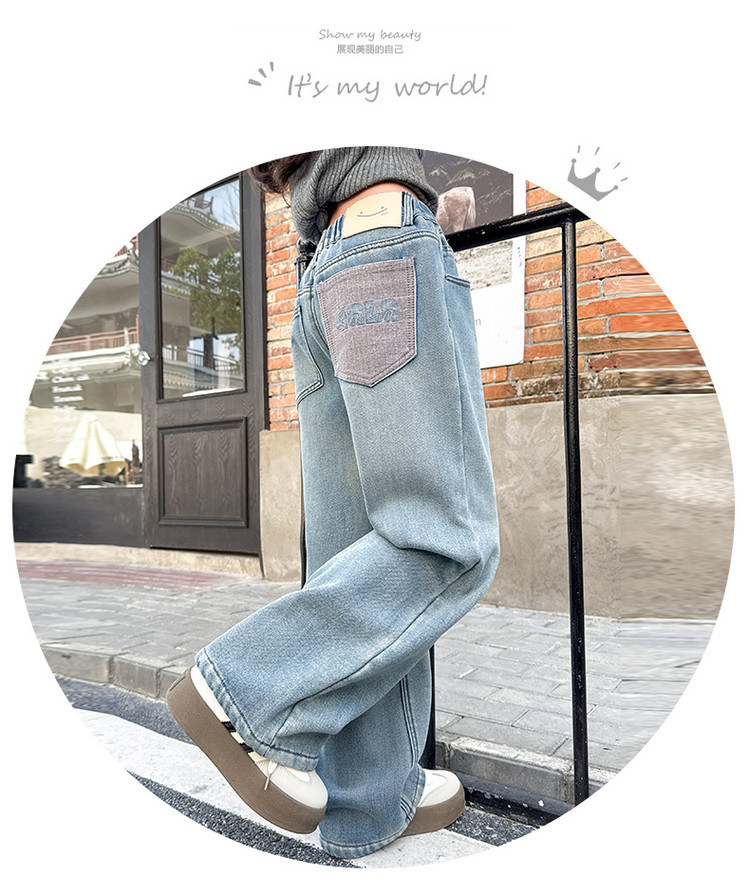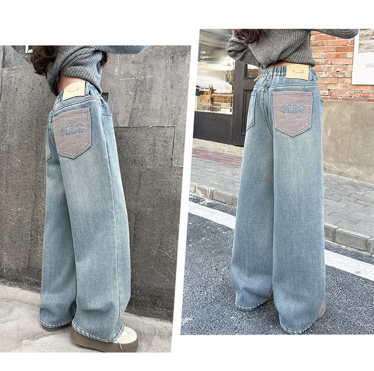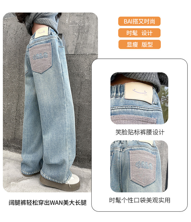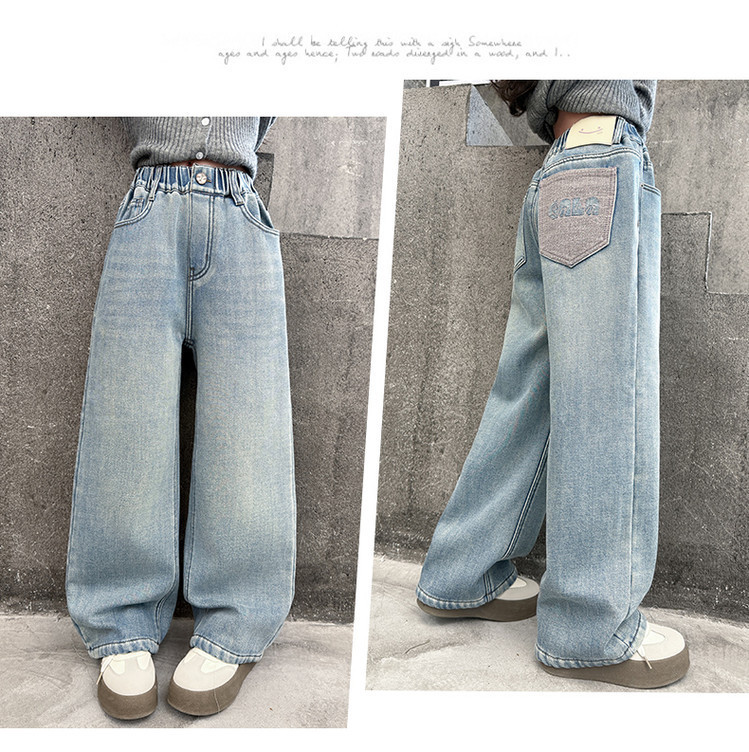 봄과 가을 여아 청바지, 아동 패셔너블 루즈 와이드 팬츠, 중대형 아동 바지, 스트레이트 팬츠, 와이드 팬츠, 아동 바지