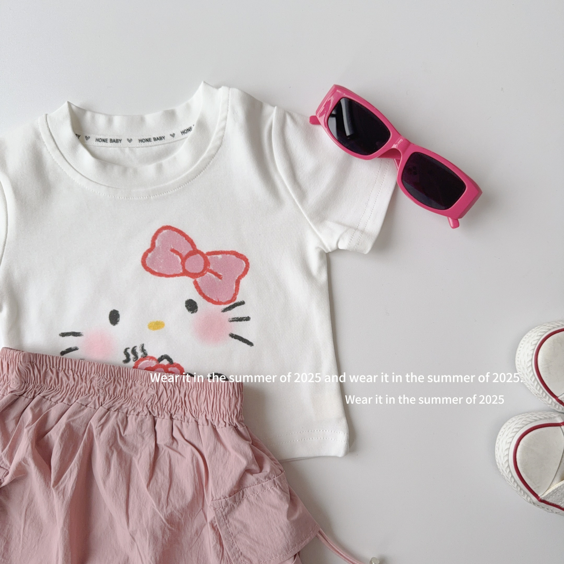 소녀 어깨 스트레치 티셔츠 반바지 여름 소녀 운동복 귀여운 핑크 공주 어린이 옷 서양식스토어 가기