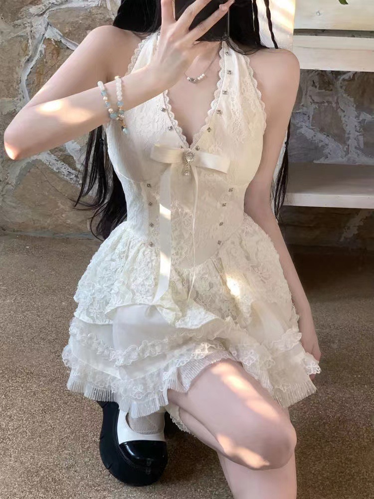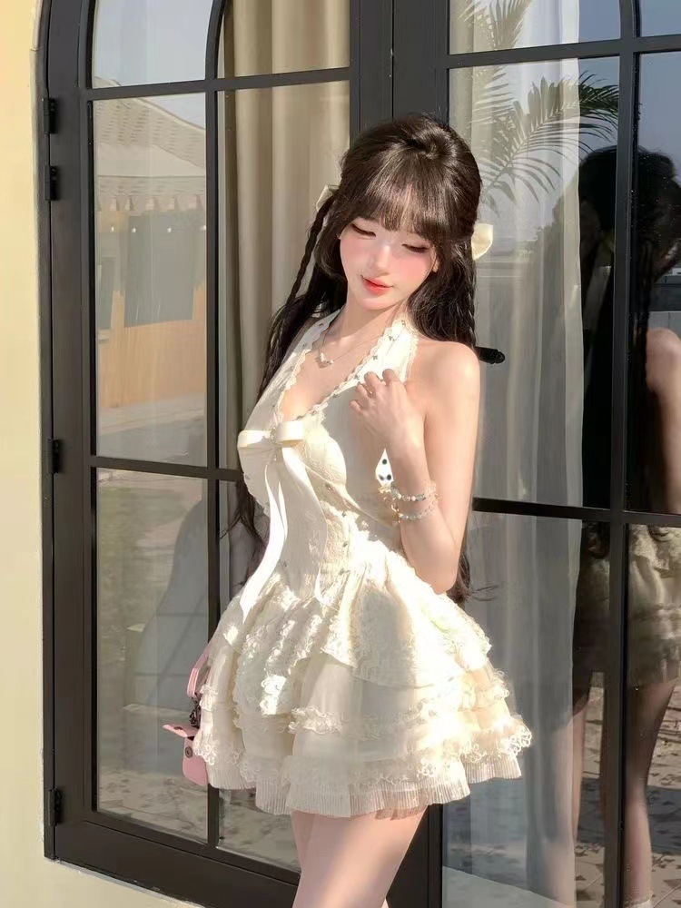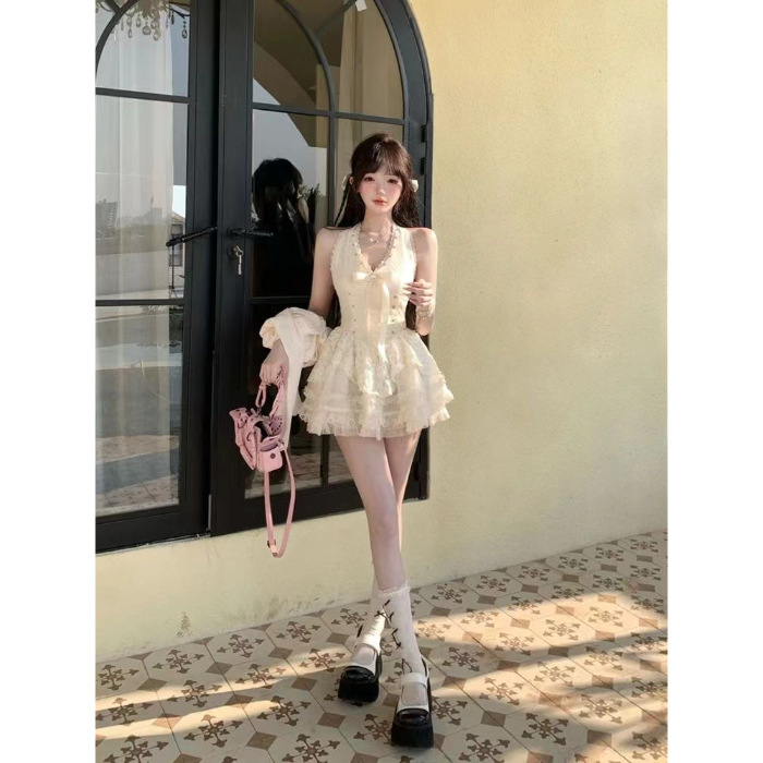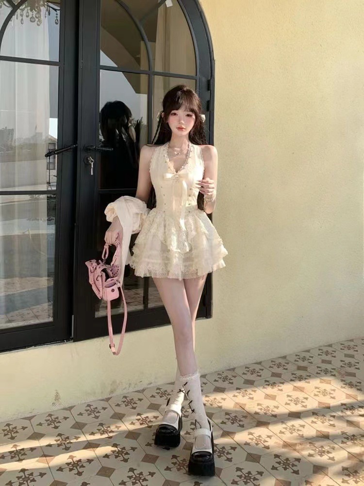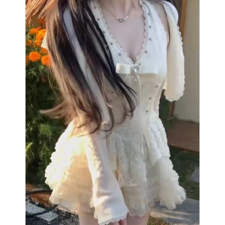봄 새로운 프랑스 틈새 타이트 허리 공주 원피스 살구색 카디건 세트 여성 목 살구색 보여