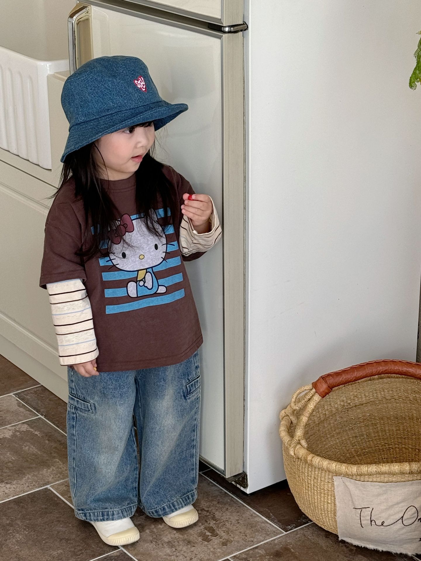 한국 스타일 봄과 여름 어린이 캐주얼 만화 인쇄 줄무늬 접합 슬리브 티셔츠 루즈 탑스토어 가기