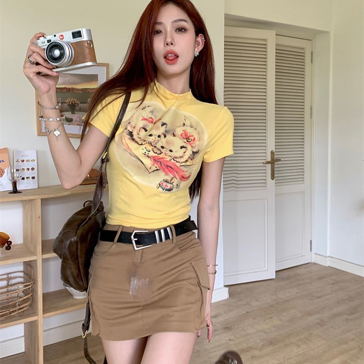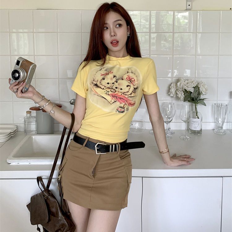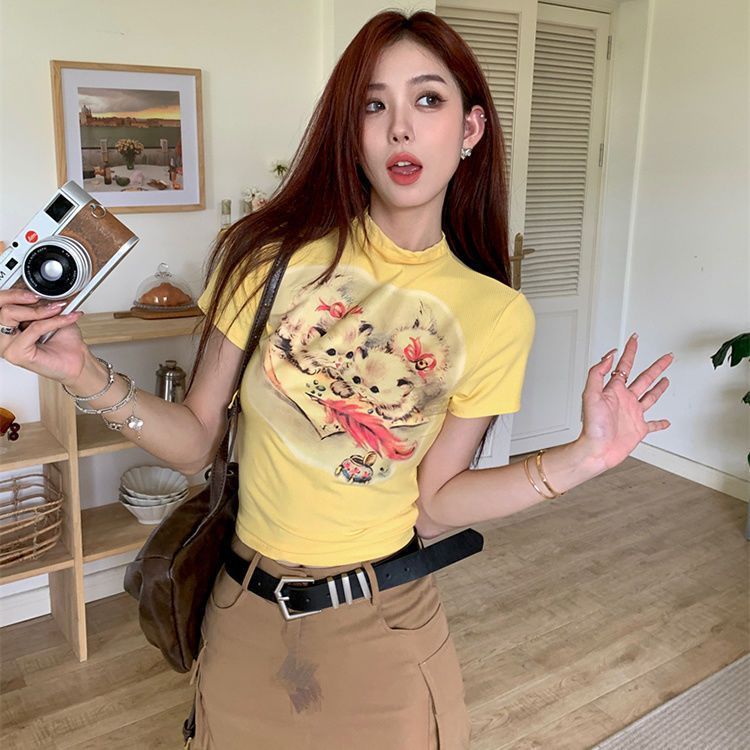 뜨거운 소녀 만화 고양이 인쇄 노란색 반팔 티셔츠 여성의 여름 짧은 슬림 도파민 착용 탑스토어 가기