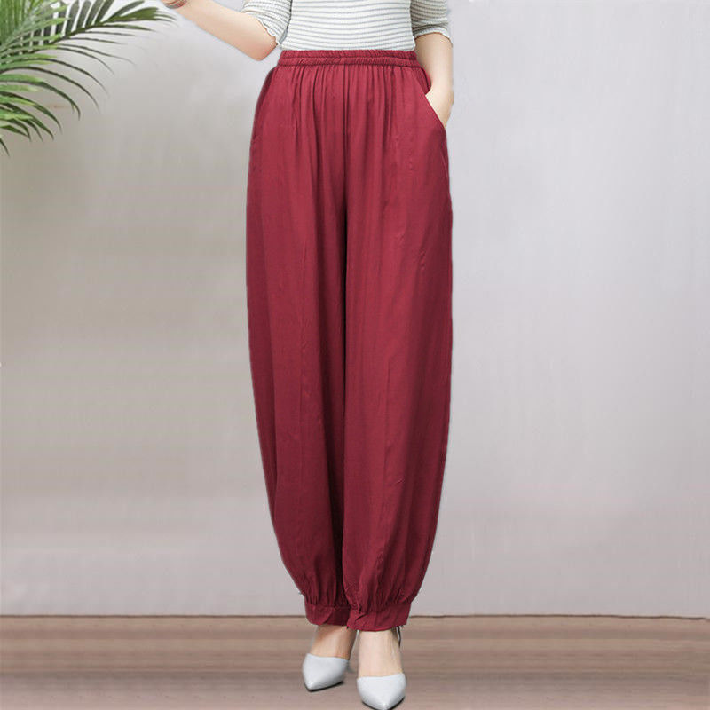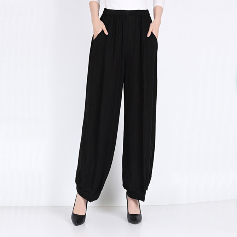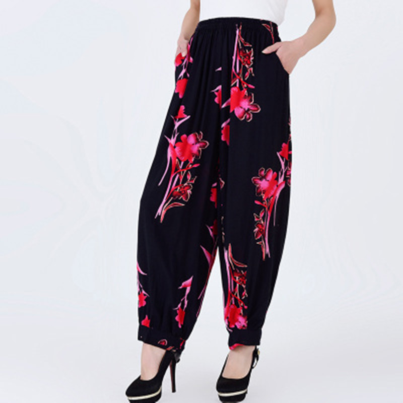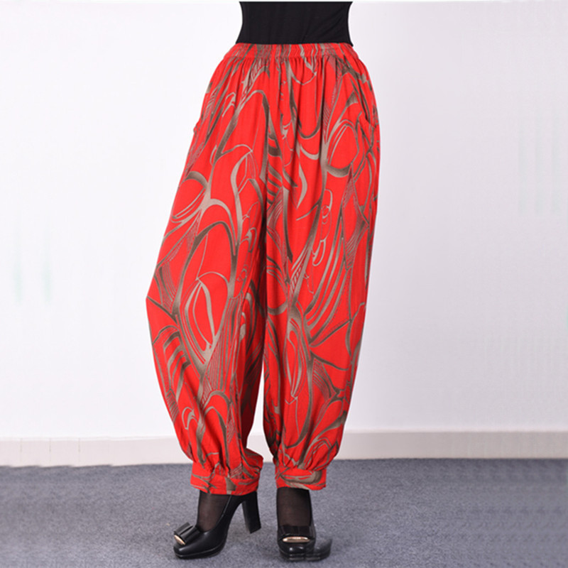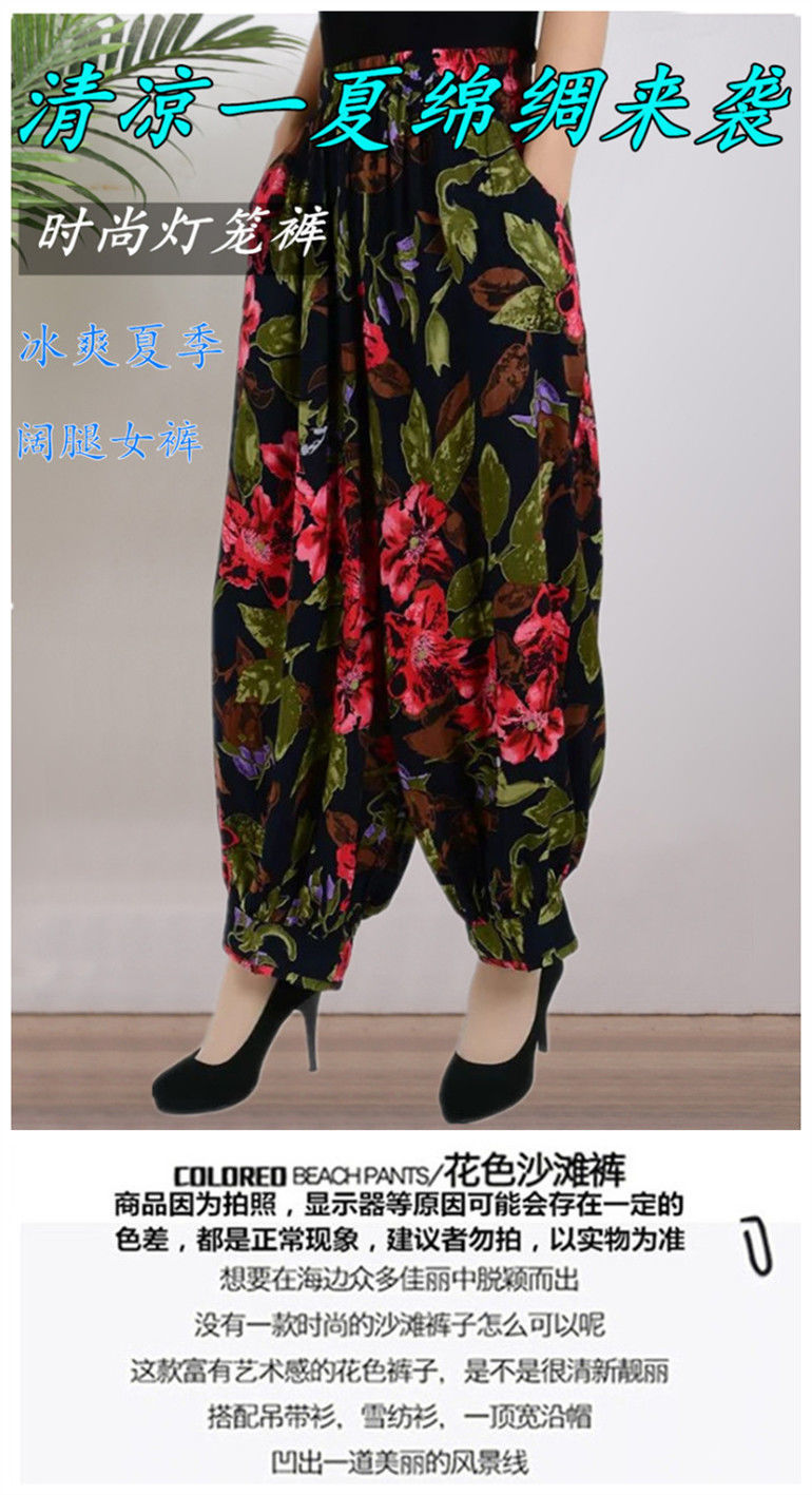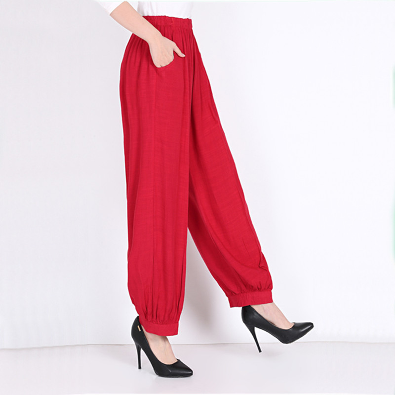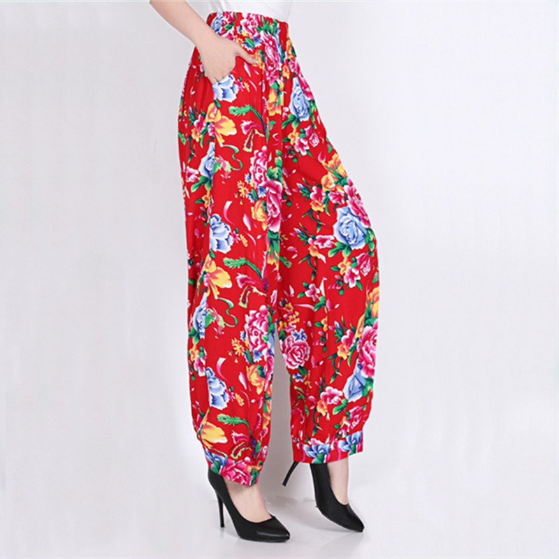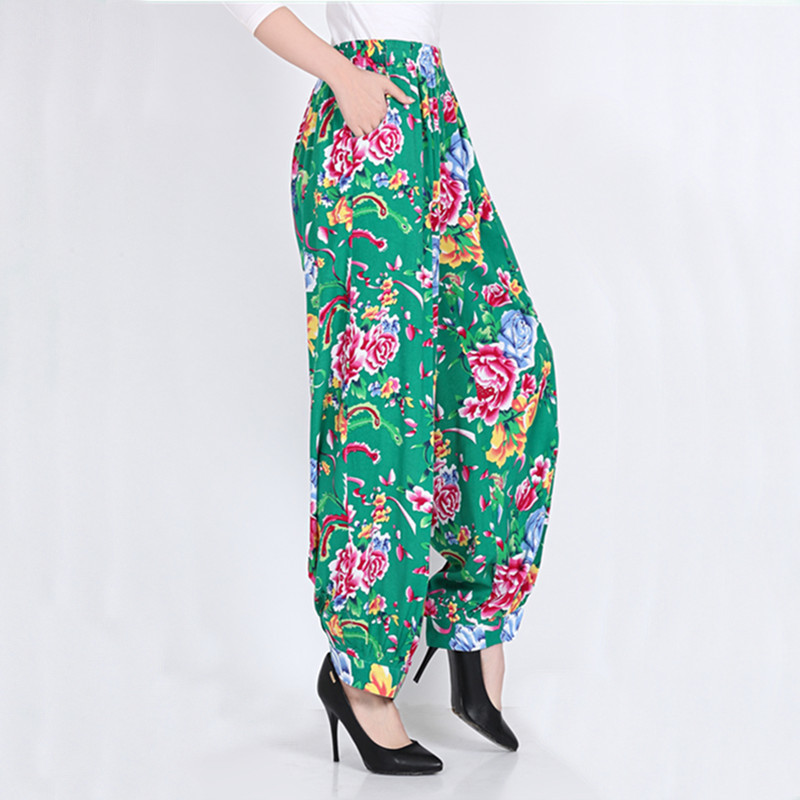 봄과 여름 광장 댄스 랜턴 바지 플러스 사이즈 윈난 넓은 다리 민족 스타일 캐주얼 어머니 코튼 실크 여성을위한 높은 허리 바지