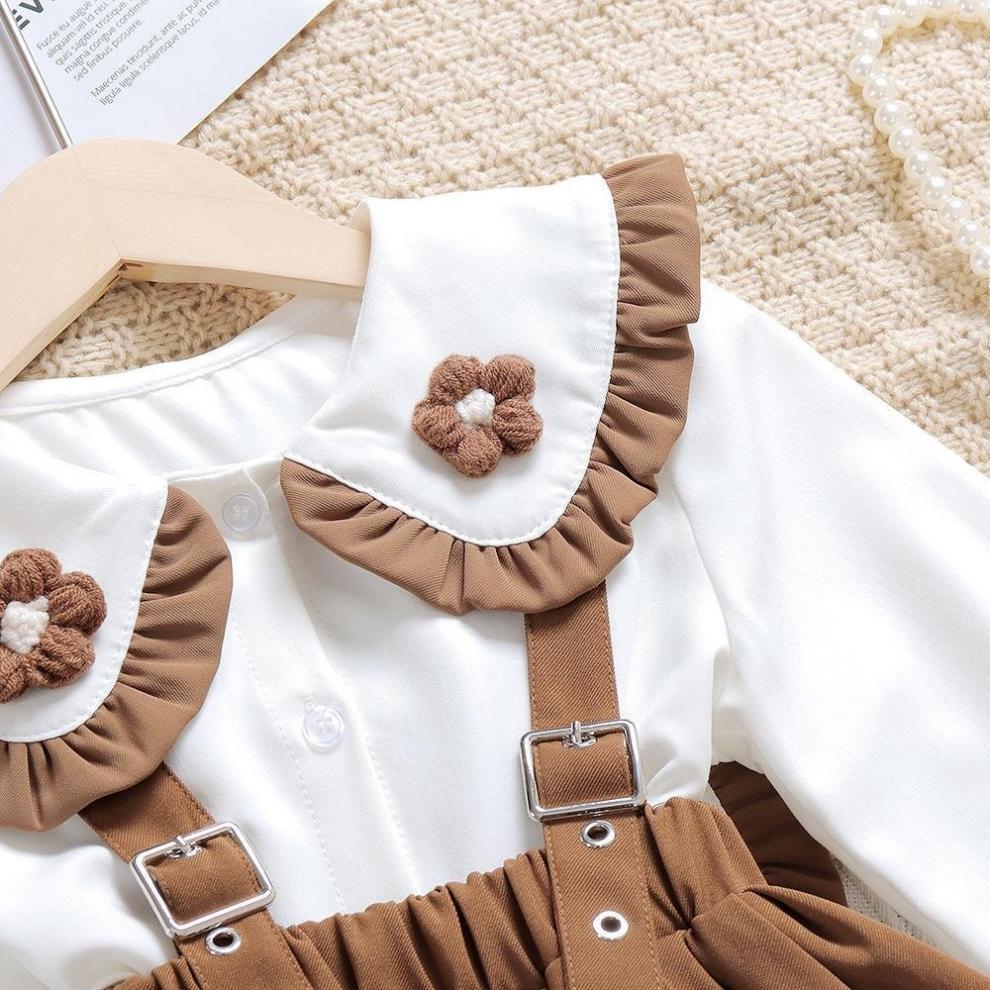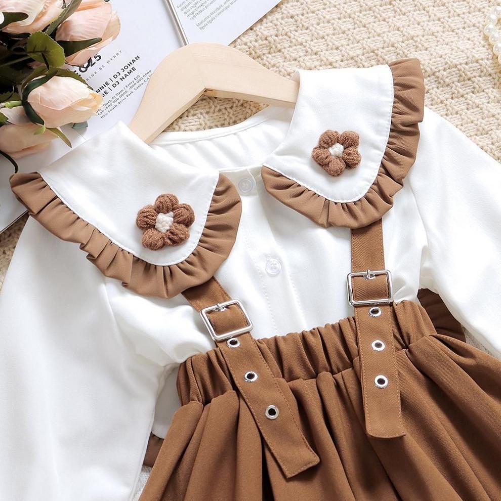 소녀 세트 봄과 가을 2025 새로운 세련된 패션 바느질 올 매치 스트랜드 원피스 꽃 셔츠 인터넷 축하 투피스 세트