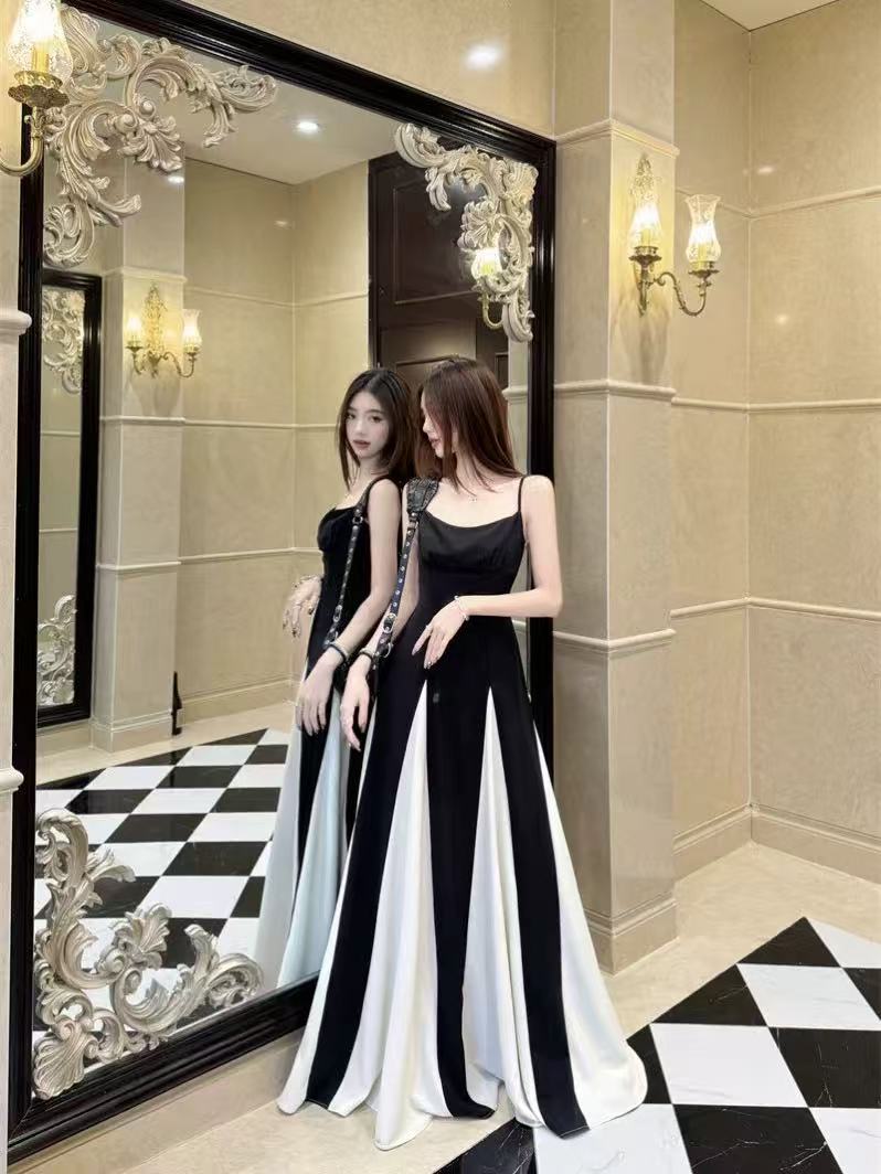 프랑스 스티칭 색상 대비 슬링 원피스 여성 여름 디자인 센스 타이트 허리 A 라인 스커트 대형 스윙 원피스스토어 가기