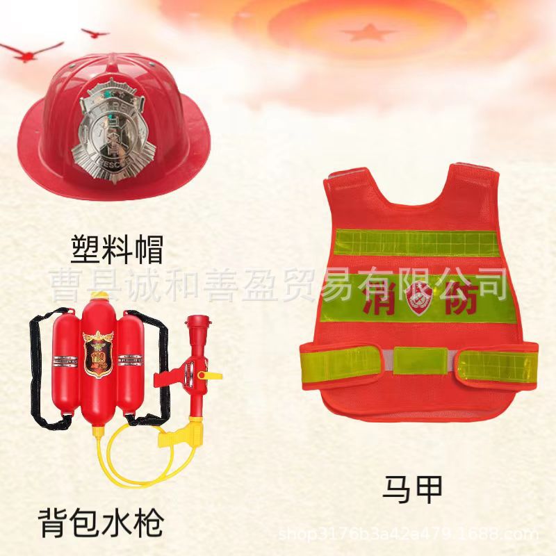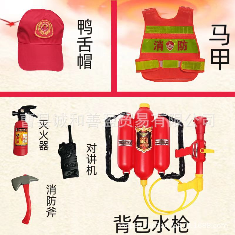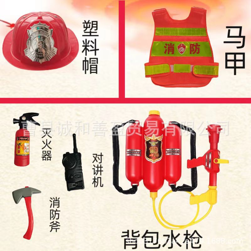 • 플라스틱 모자 + 소방 조끼 + 소화기 소방 도끼 무전기 + 배낭 물총
