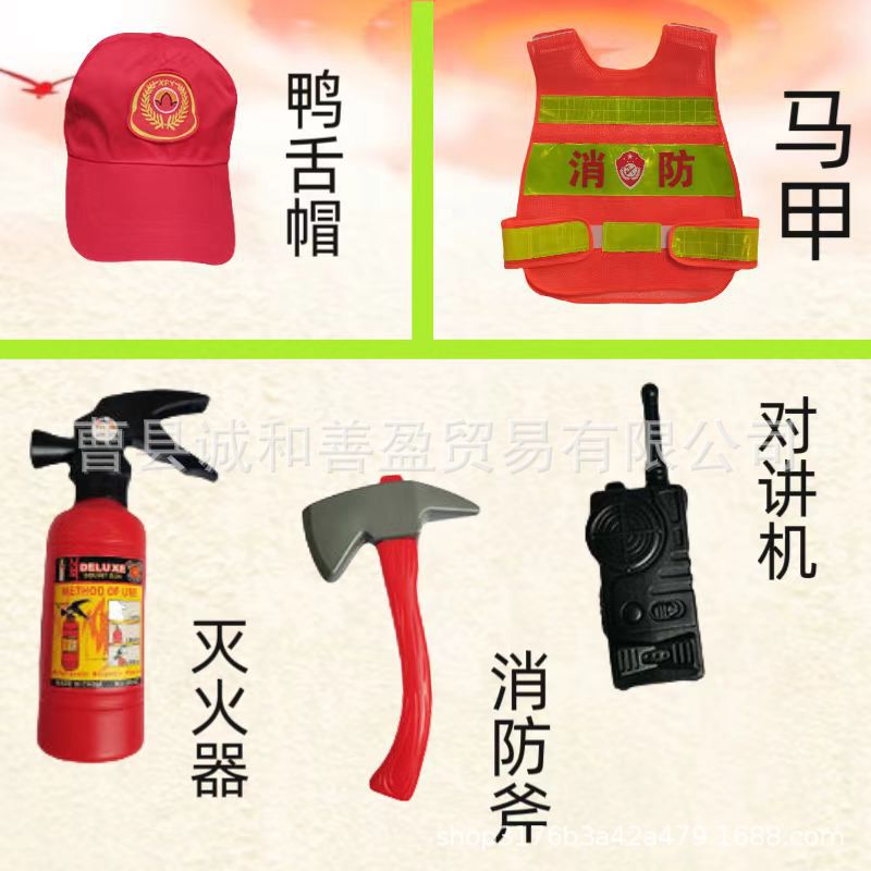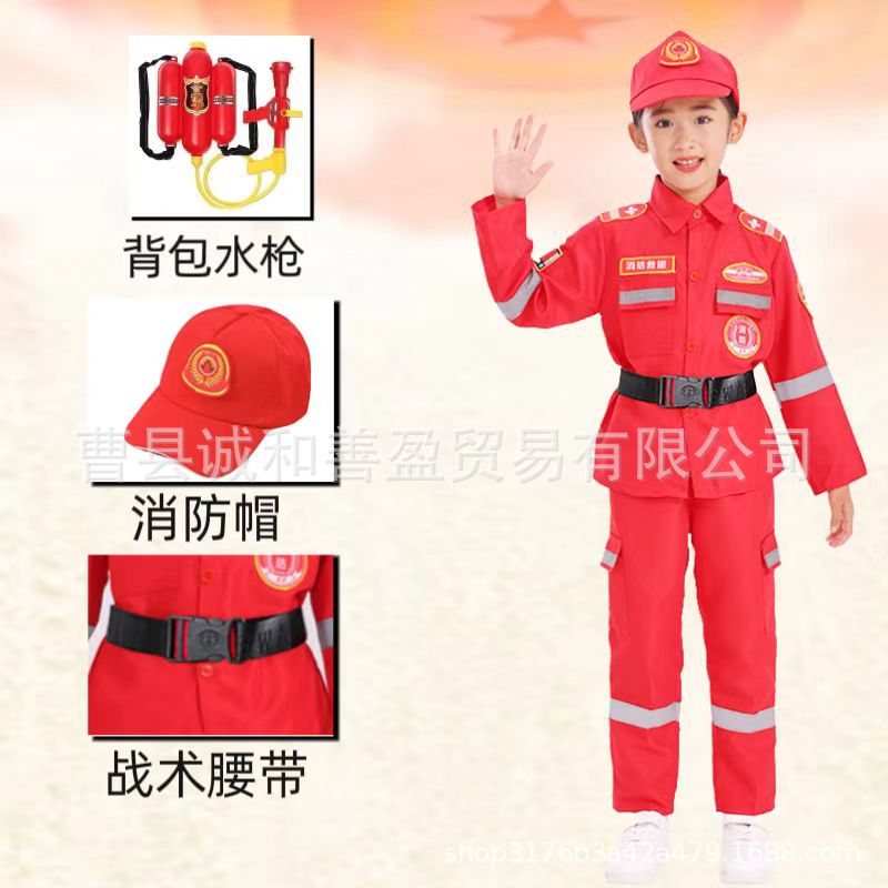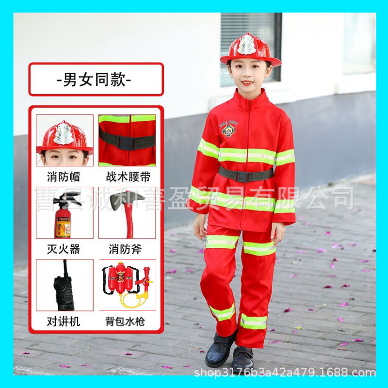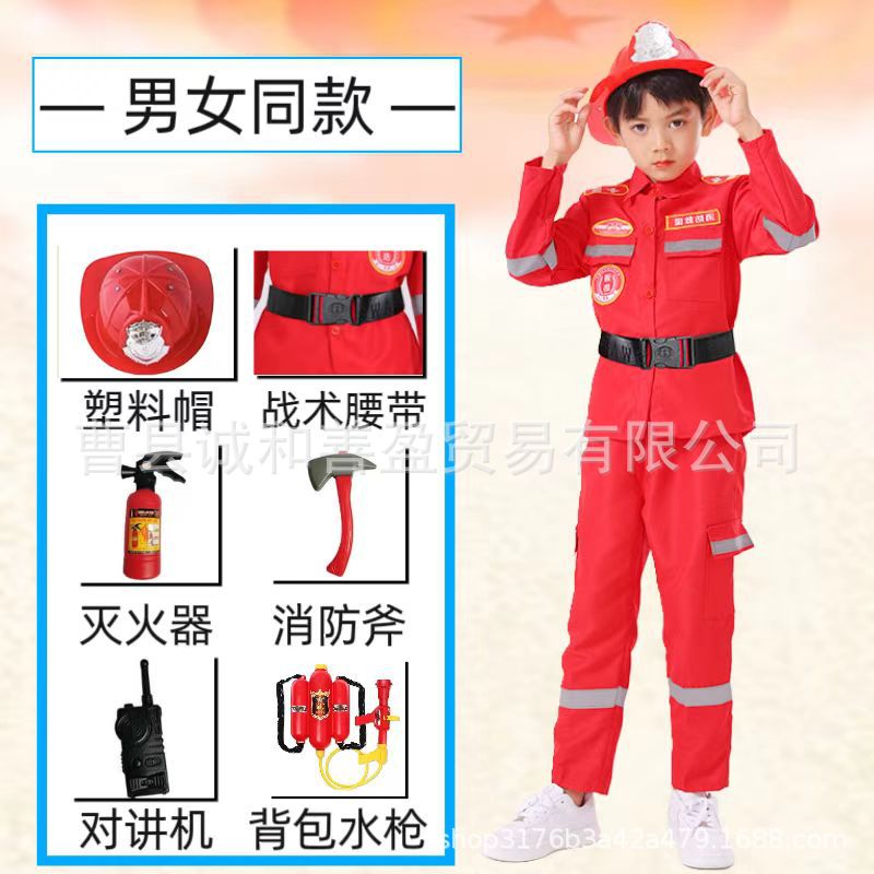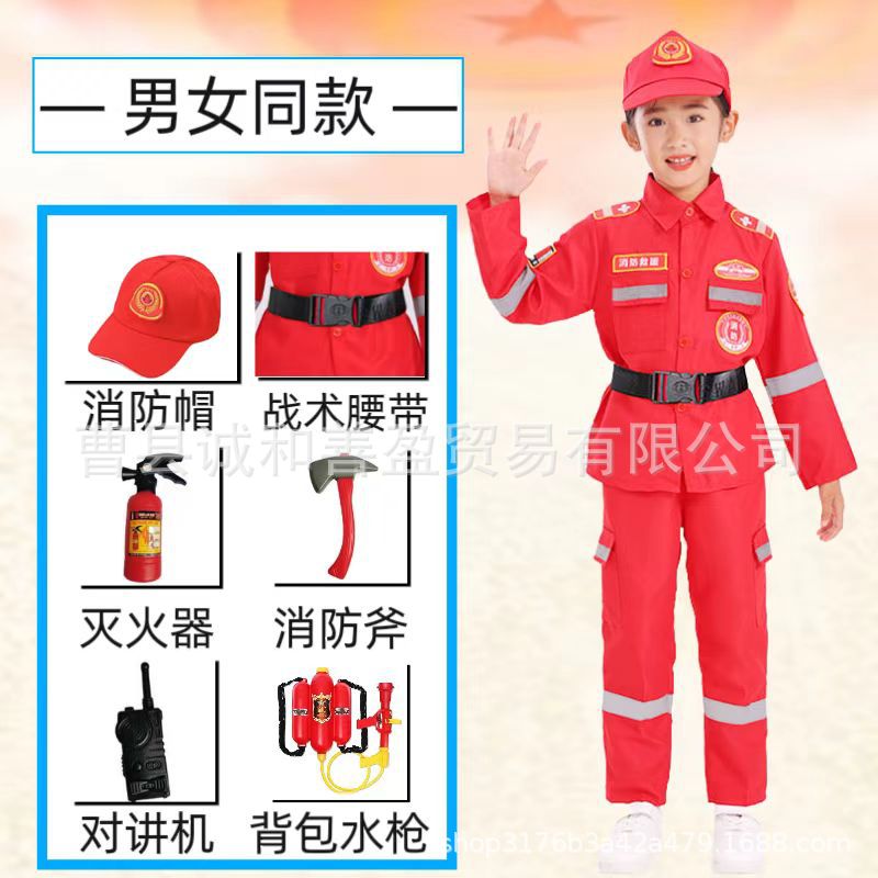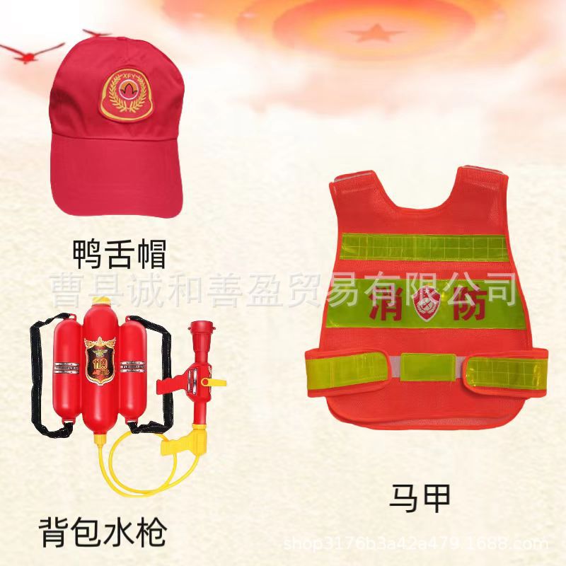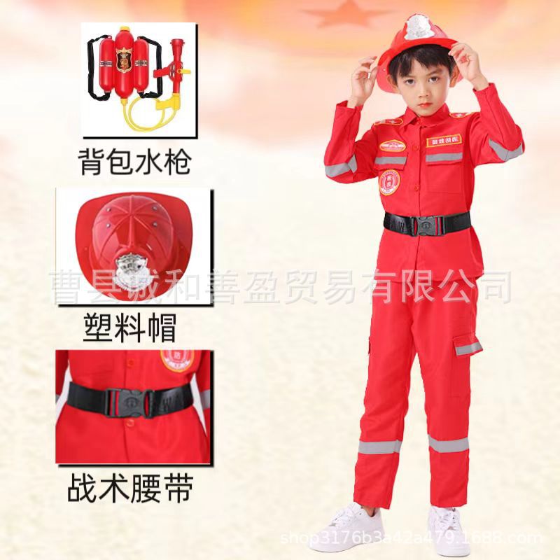 • 소방복 + 플라스틱 모자 + 소화기 소방도끼 무전기 + 배낭 물총 + 벨트