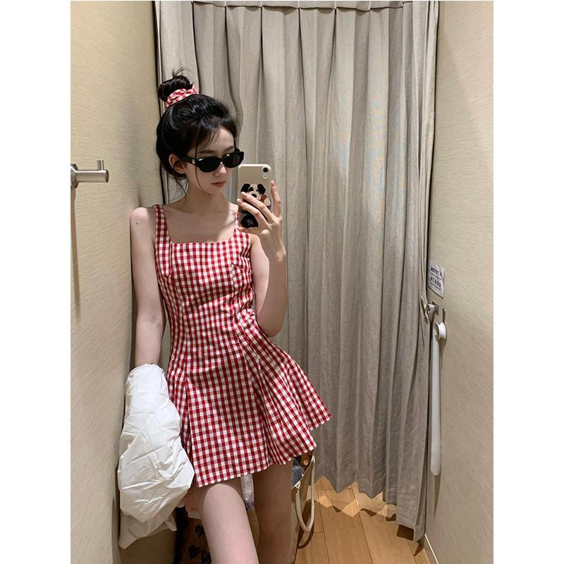 달콤하고 뜨거운 대학 스타일 한국 스타일 빨간 격자 무늬 민소매 허리-타이트 이른 여름 슬립 스커트 여성의 여름 우아한 첫 사랑 스커트