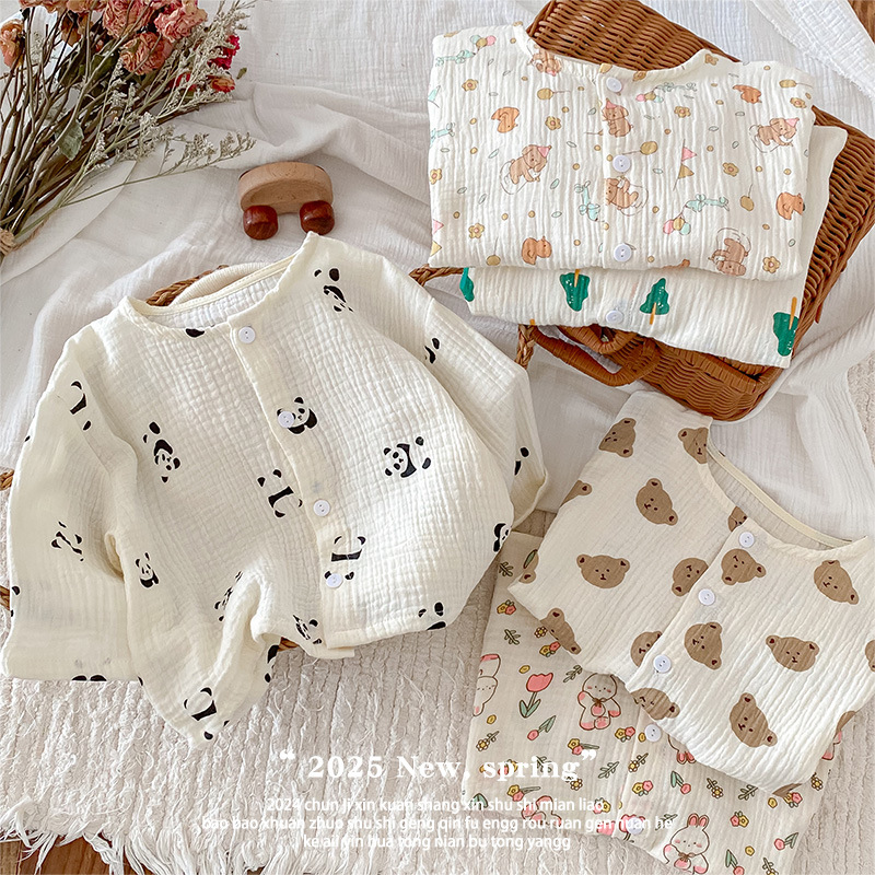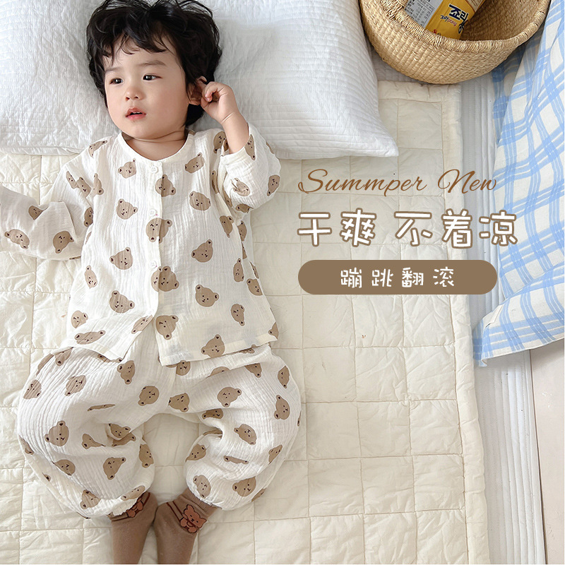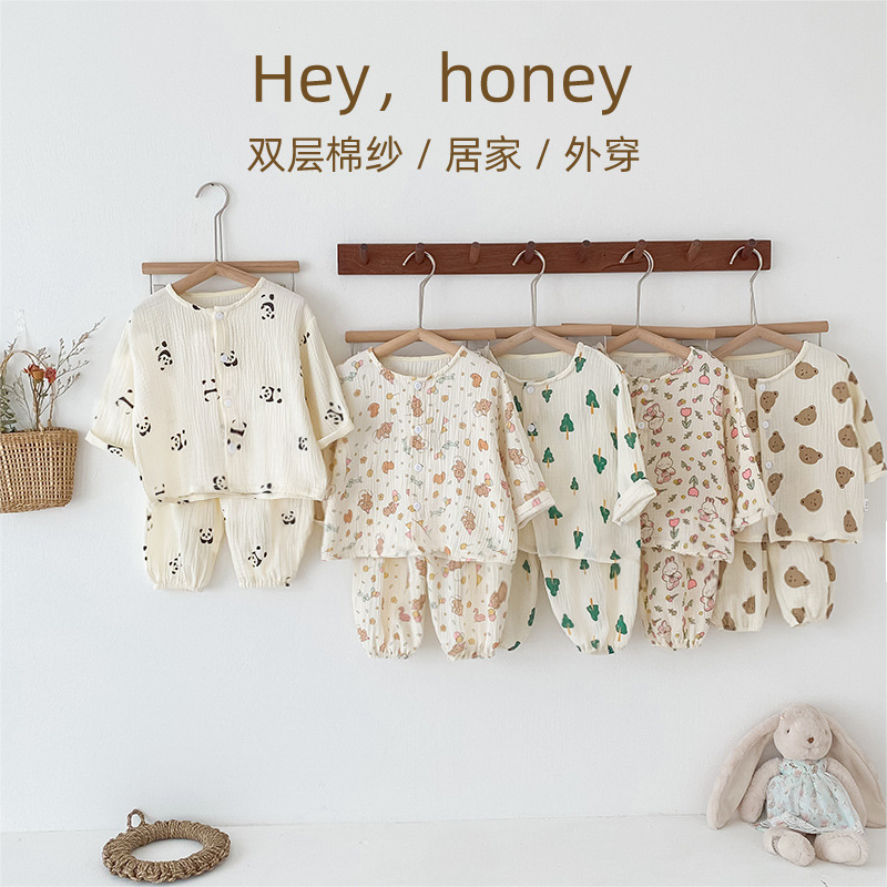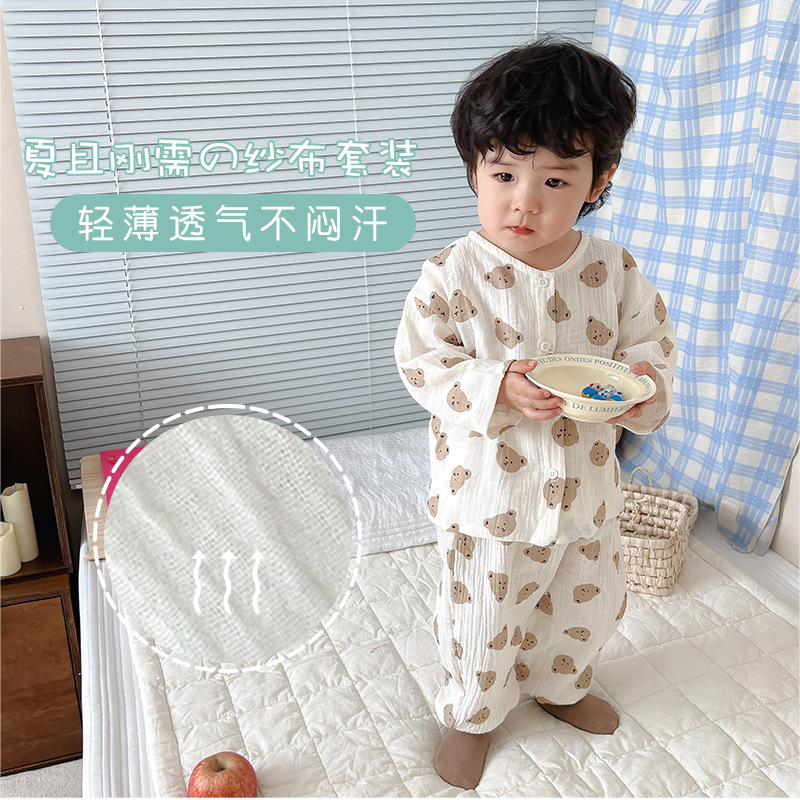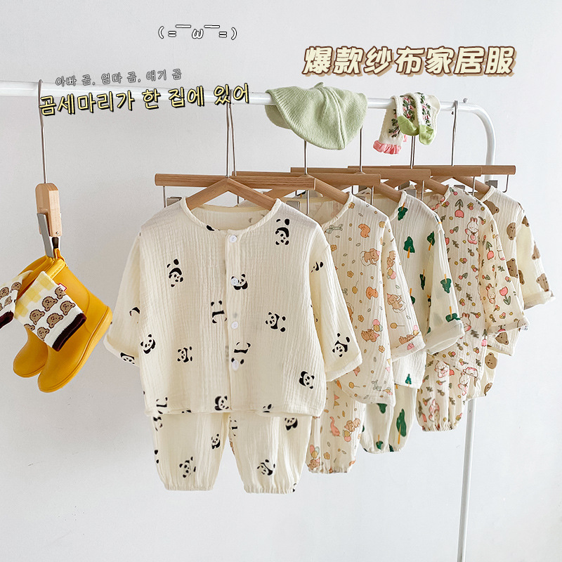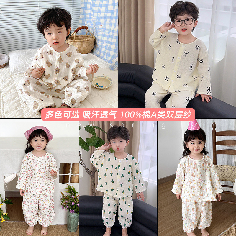 어린이 잠옷 여름 순면 얇은 아기 더블 거즈 홈 의류 세트 봄과 가을 남녀 아기 에어컨 옷스토어 가기