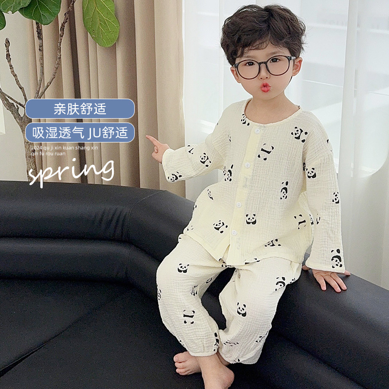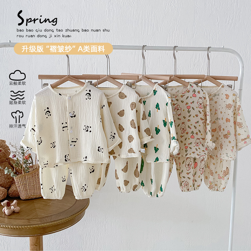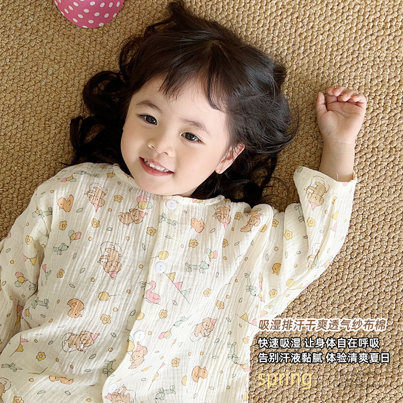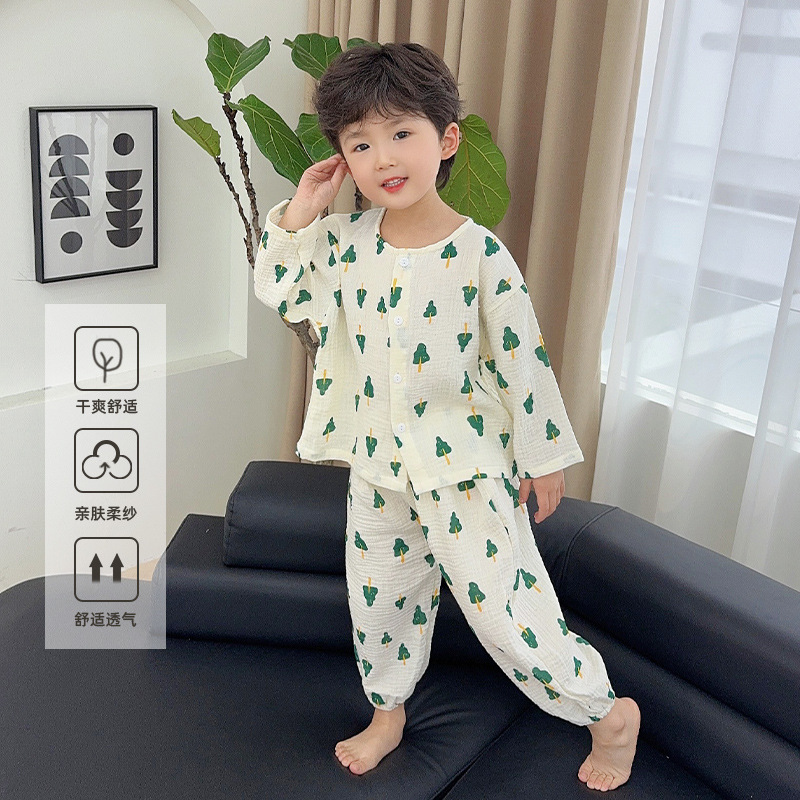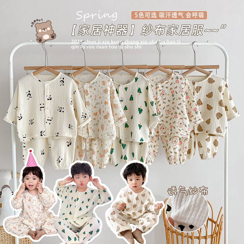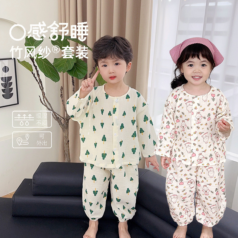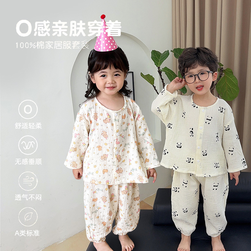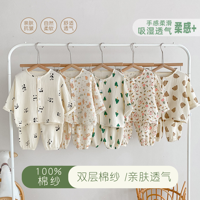 어린이 잠옷 여름 순면 얇은 아기 더블 거즈 홈 의류 세트 봄과 가을 남녀 아기 에어컨 옷