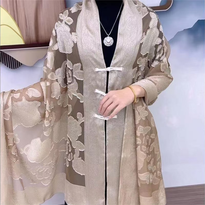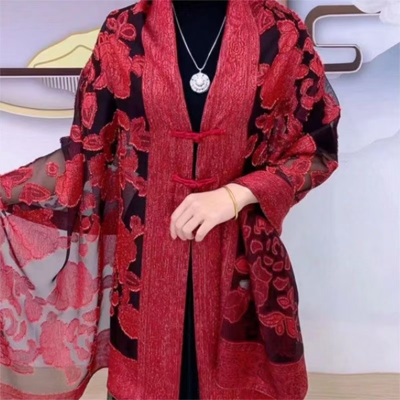 2024 디자이너 새로운 봄과 여름 얇은 컷 실크 로즈 중국 느슨한 플러스 사이즈 유명한 스타일 어머니의 목도리