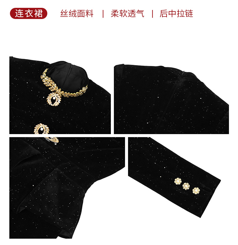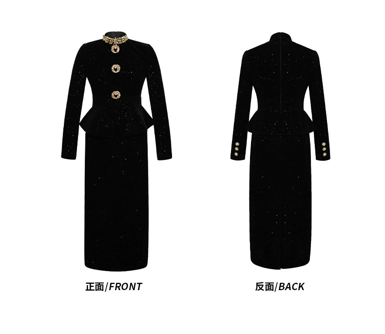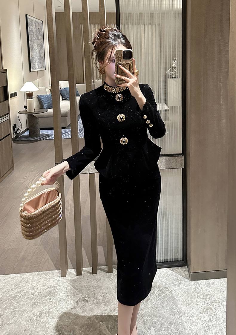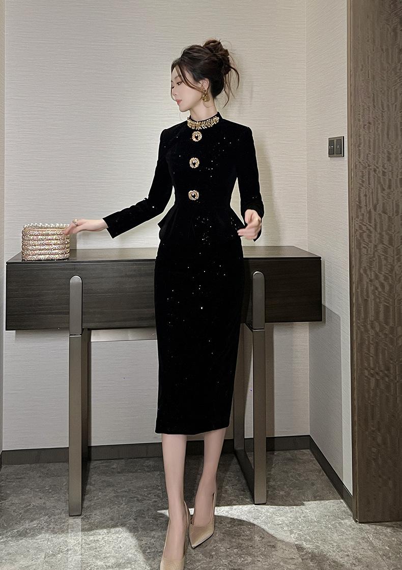 우아한 명사 스타일의 부잣집 딸을 위한 2025 가을 신상 여성용 다이아몬드 장식 라운드넥 슬림핏 원피스 21633스토어 가기